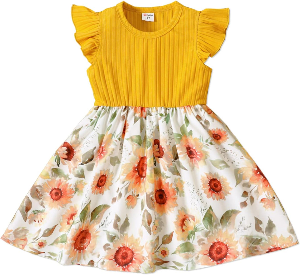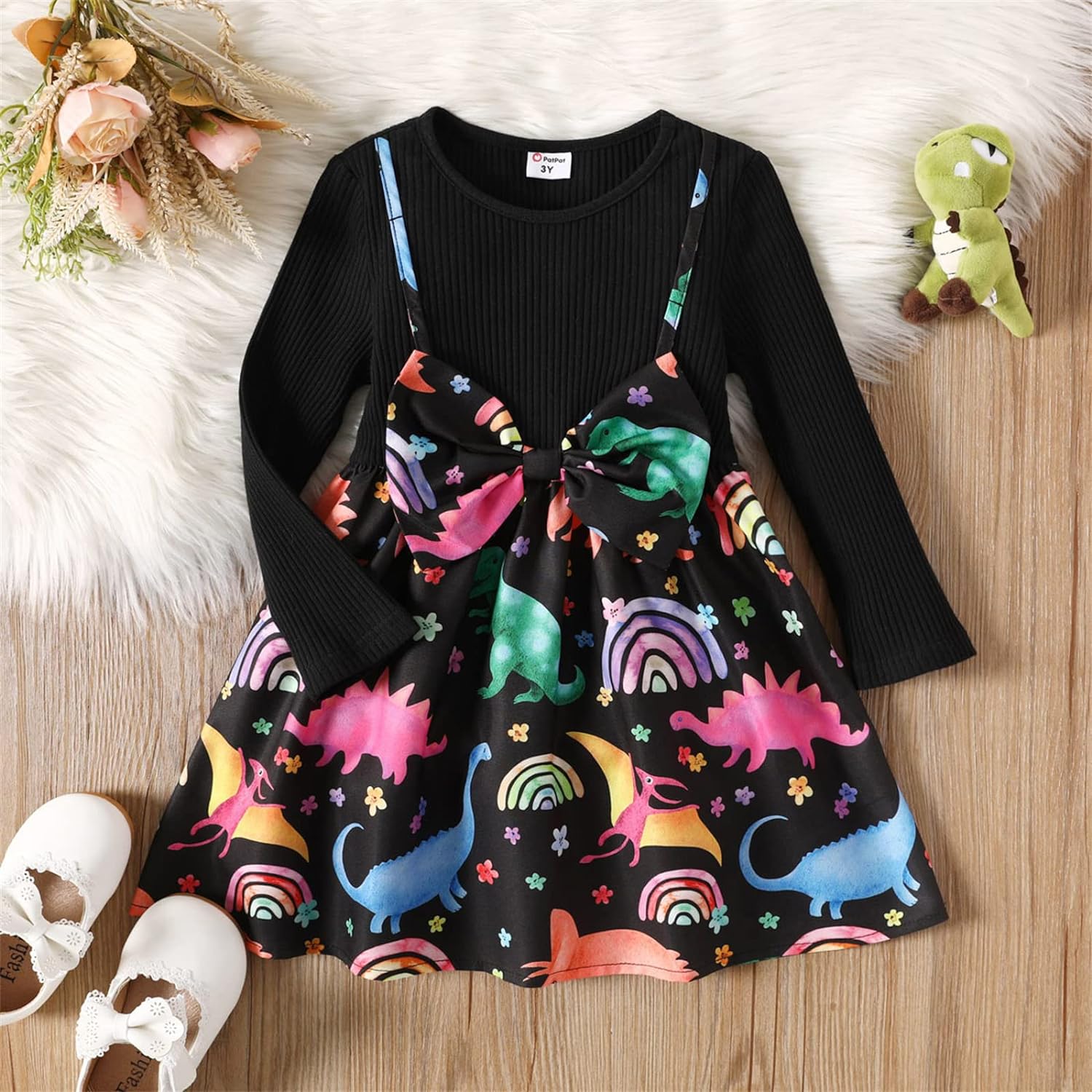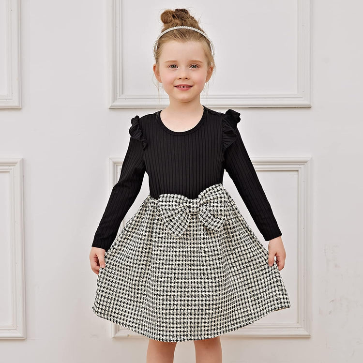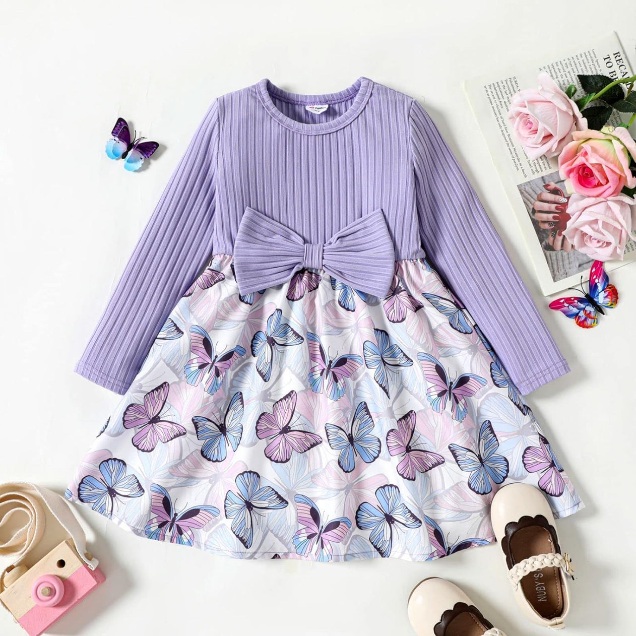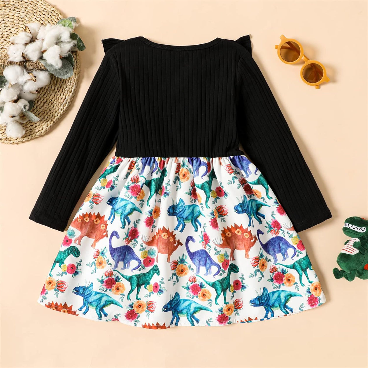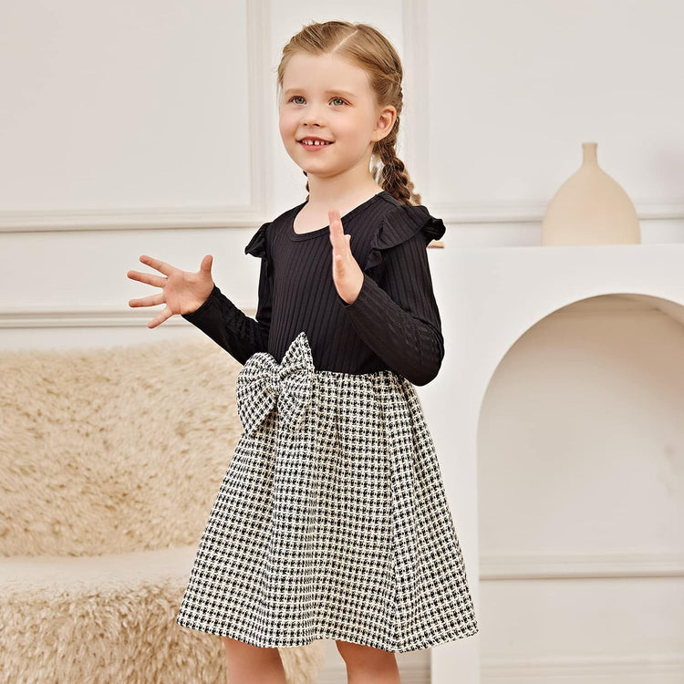 PATPAT Baby Toddler Floral Print Bowknot Dress Colorblock Round Neck Long Sleeves Fall Dress for Girls