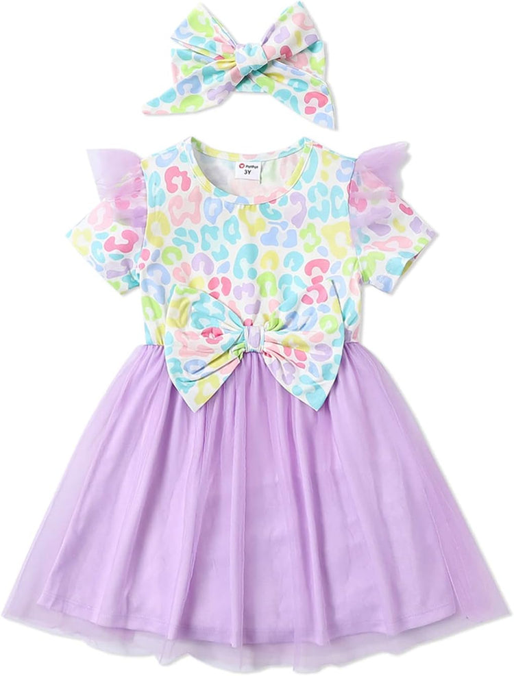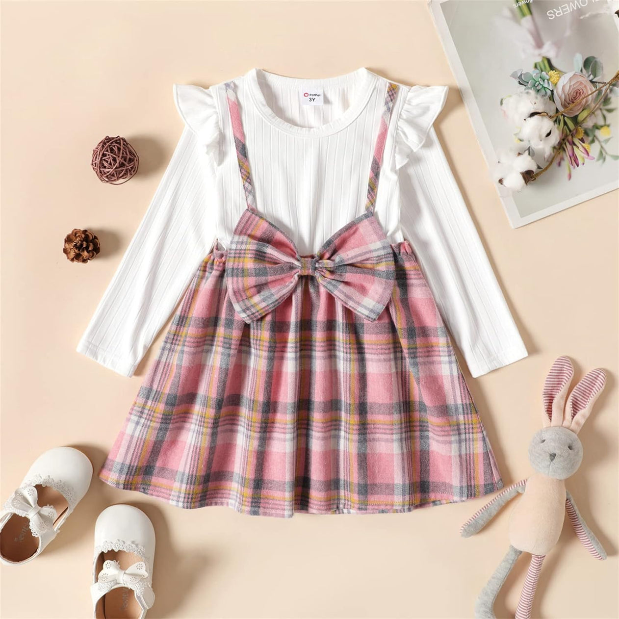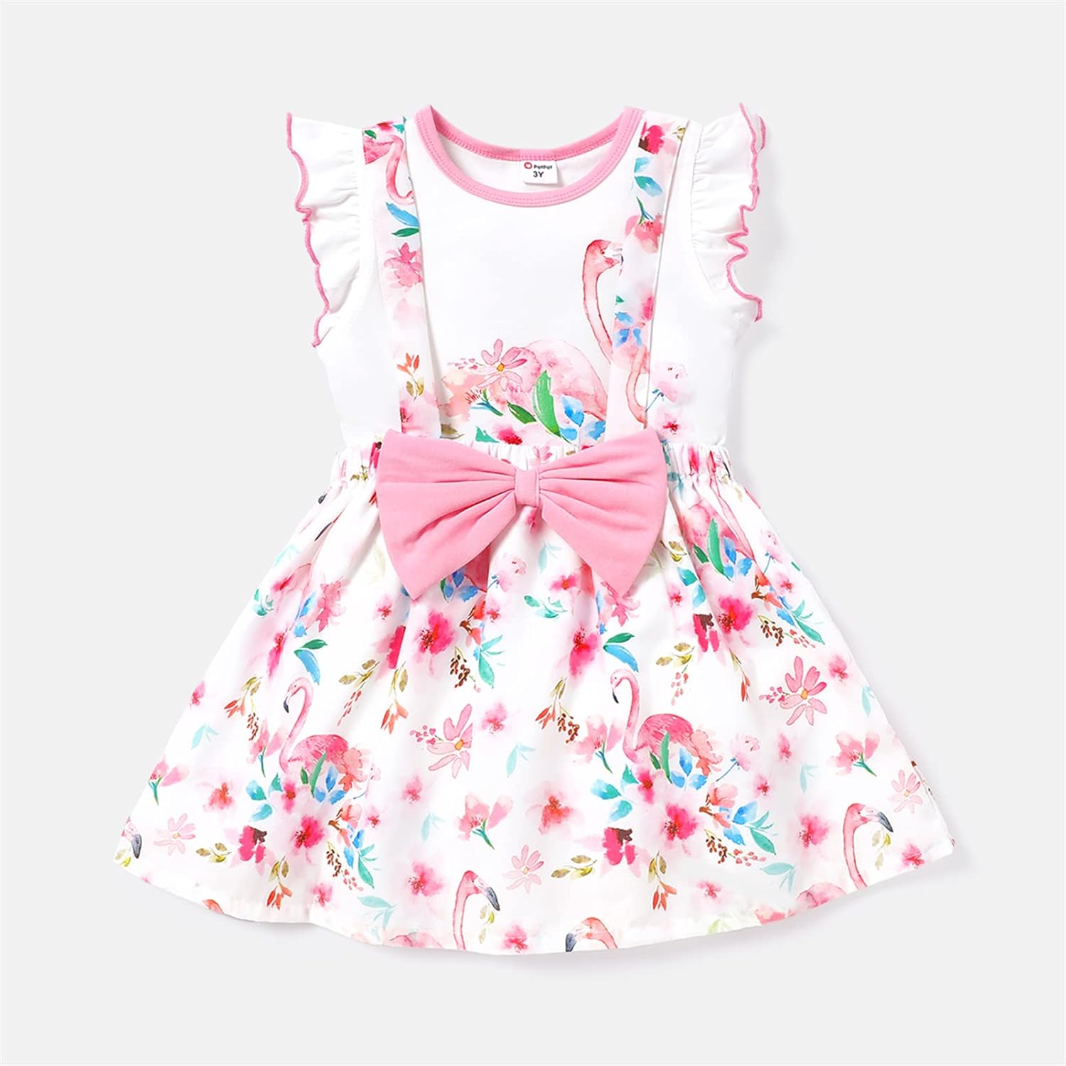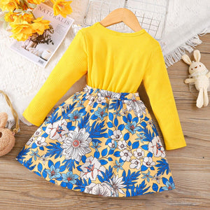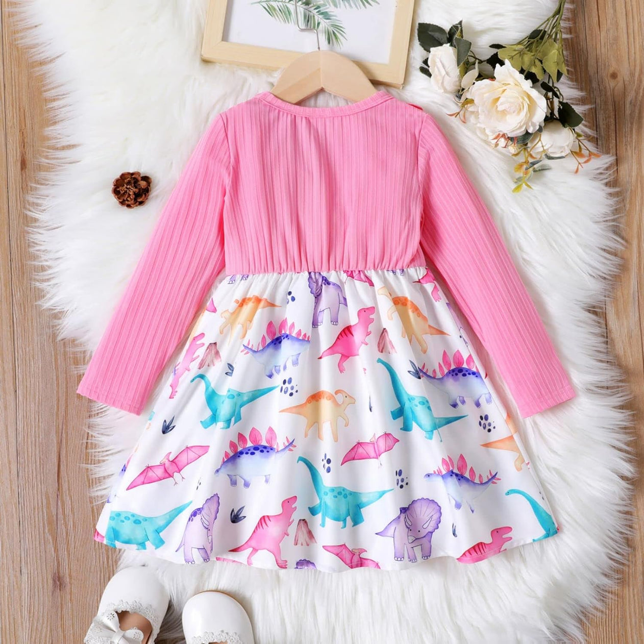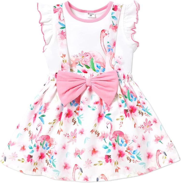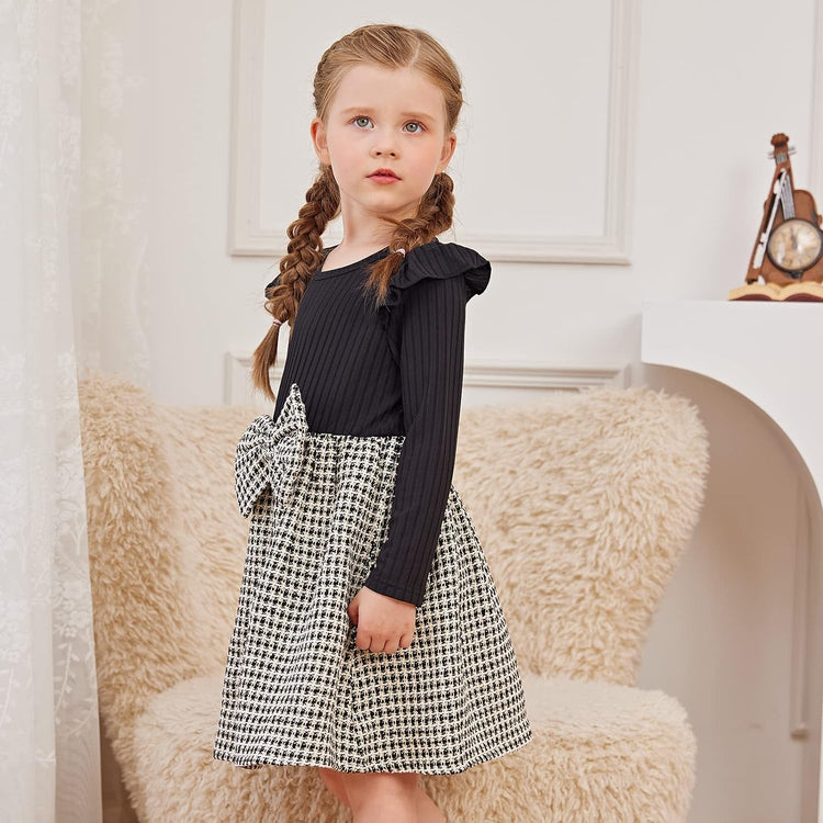 PATPAT Baby Toddler Floral Print Bowknot Dress Colorblock Round Neck Long Sleeves Fall Dress for Girls