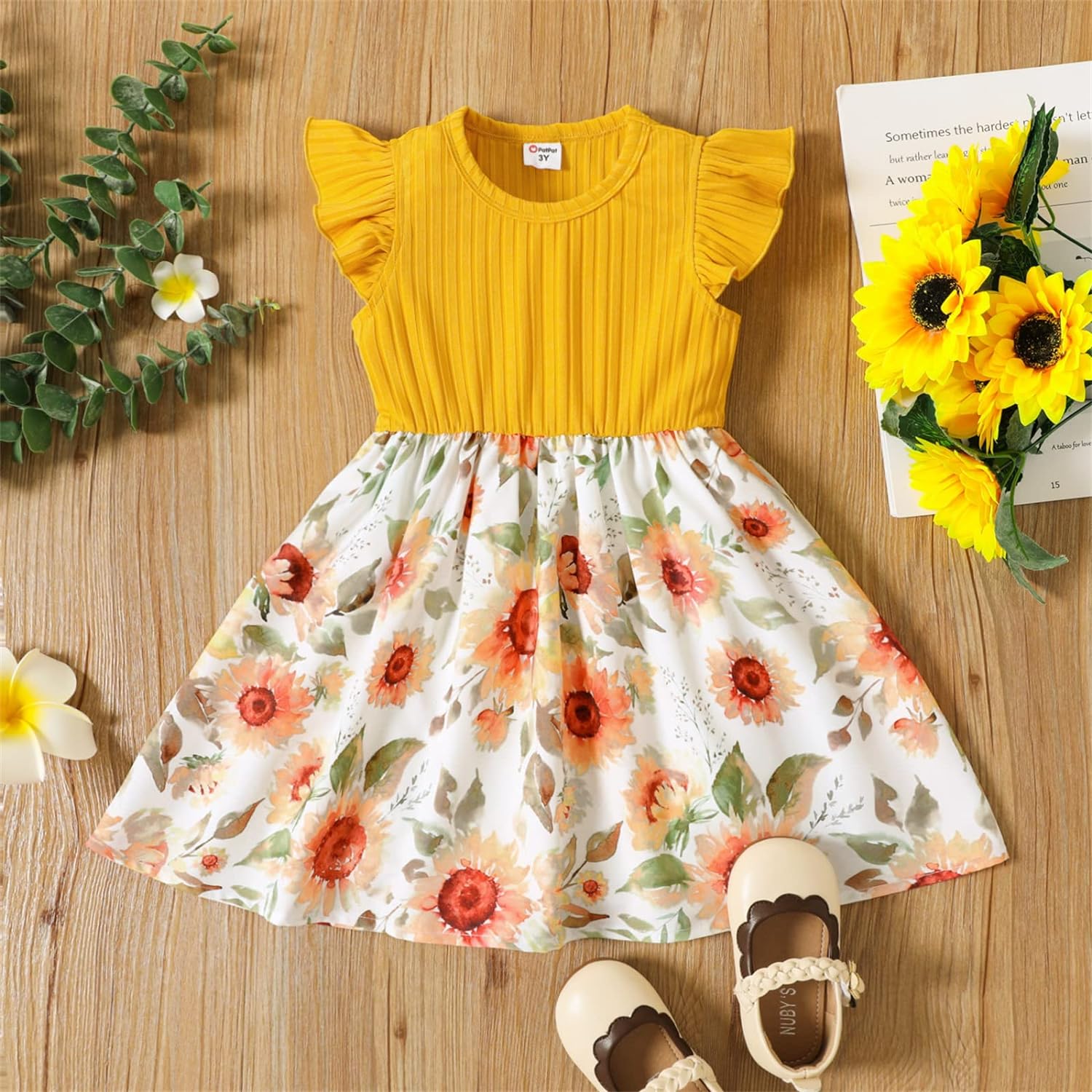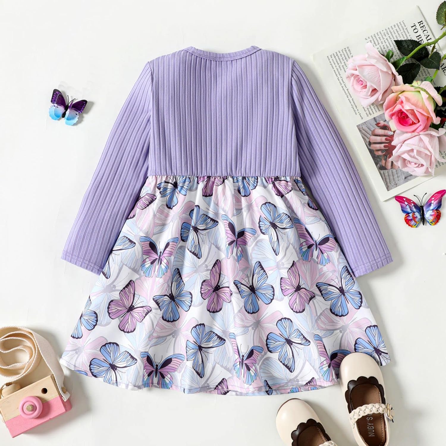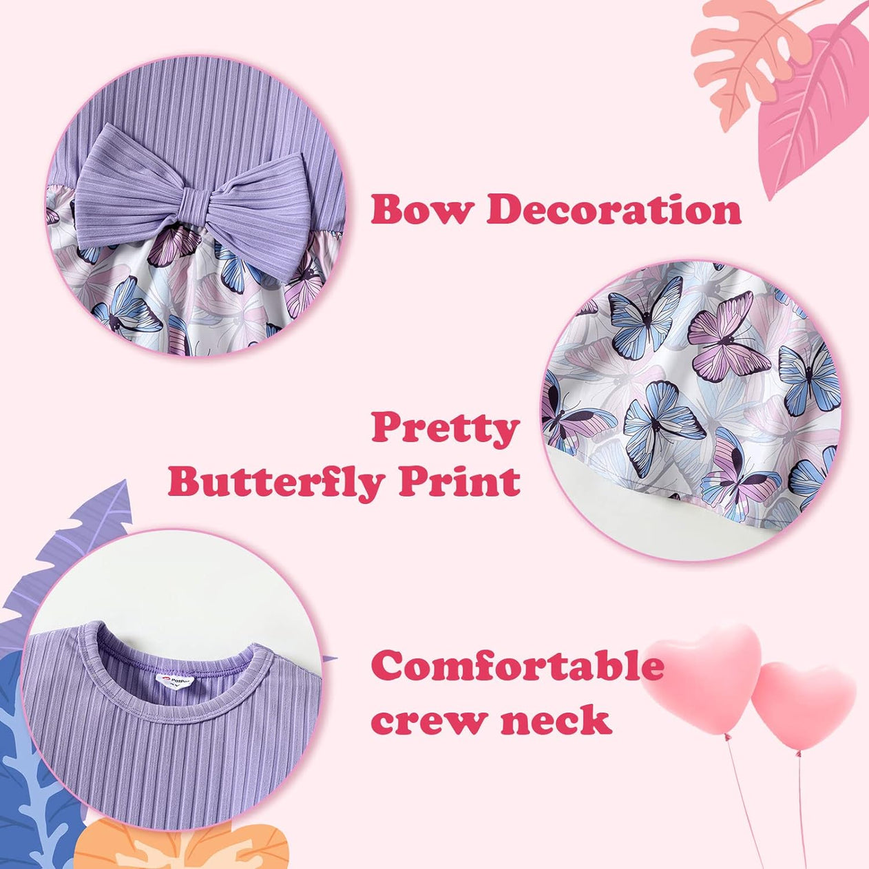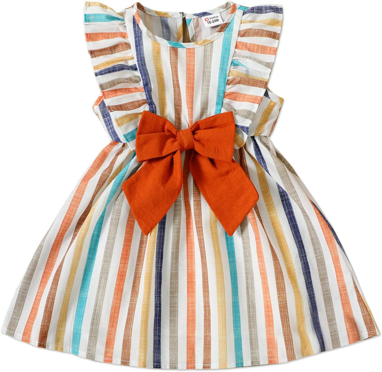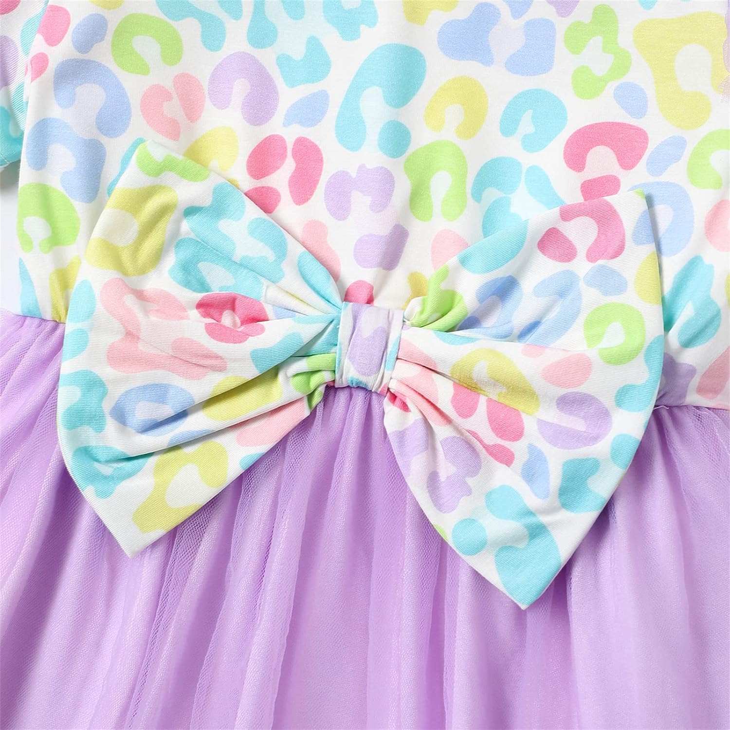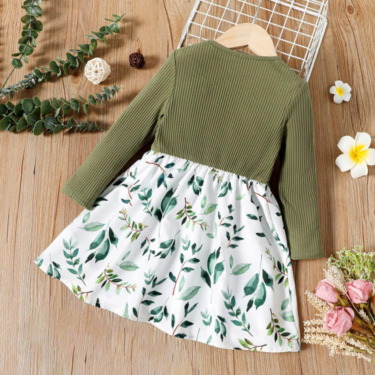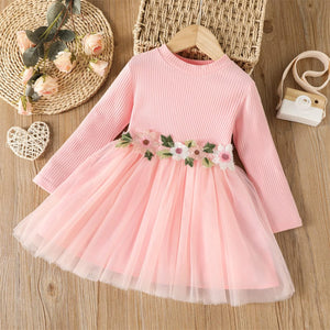 PATPAT Baby Toddler Floral Print Bowknot Dress Colorblock Round Neck Long Sleeves Fall Dress for Girls