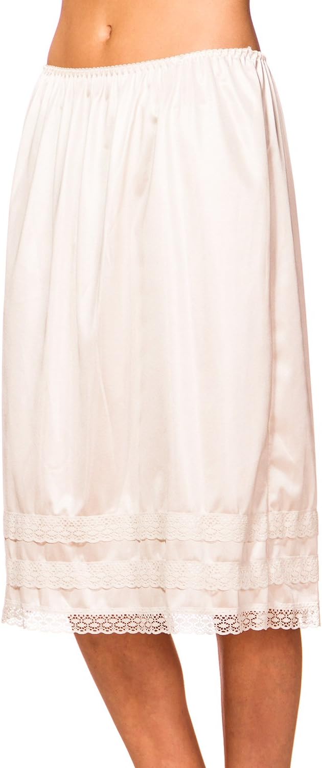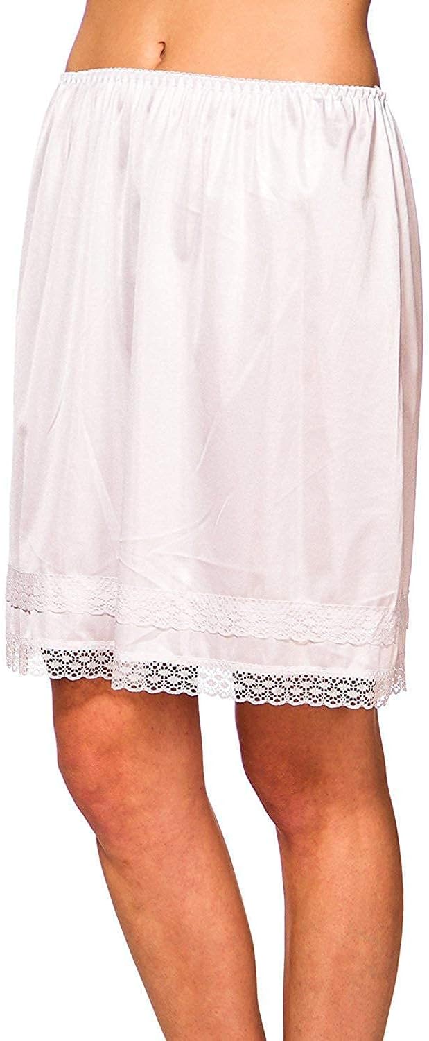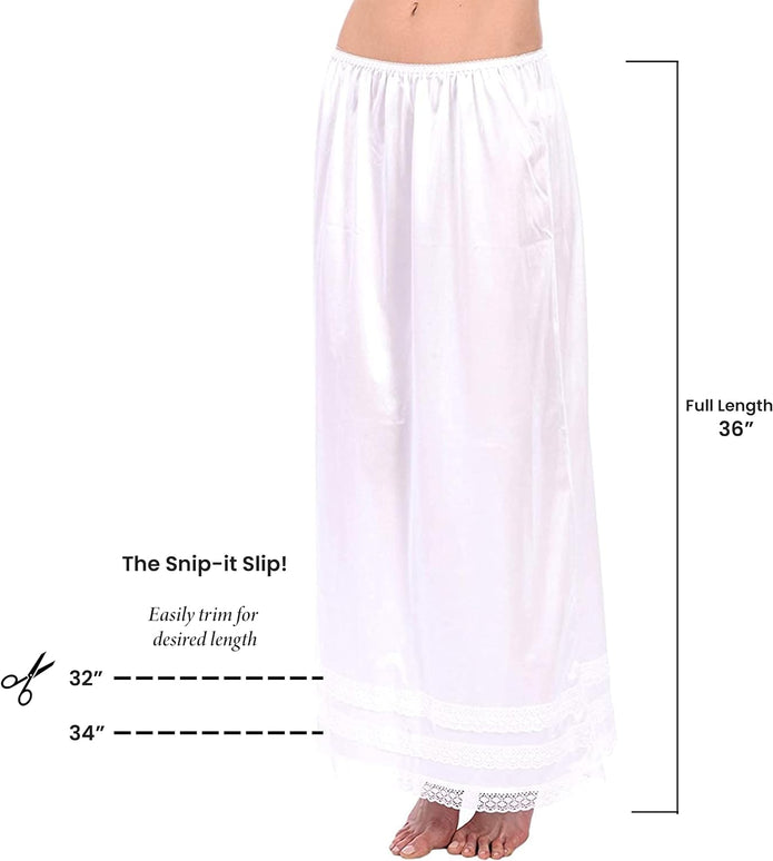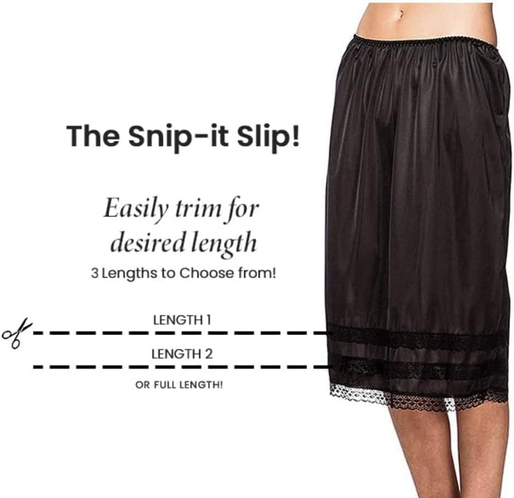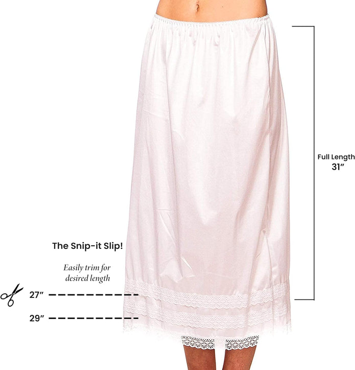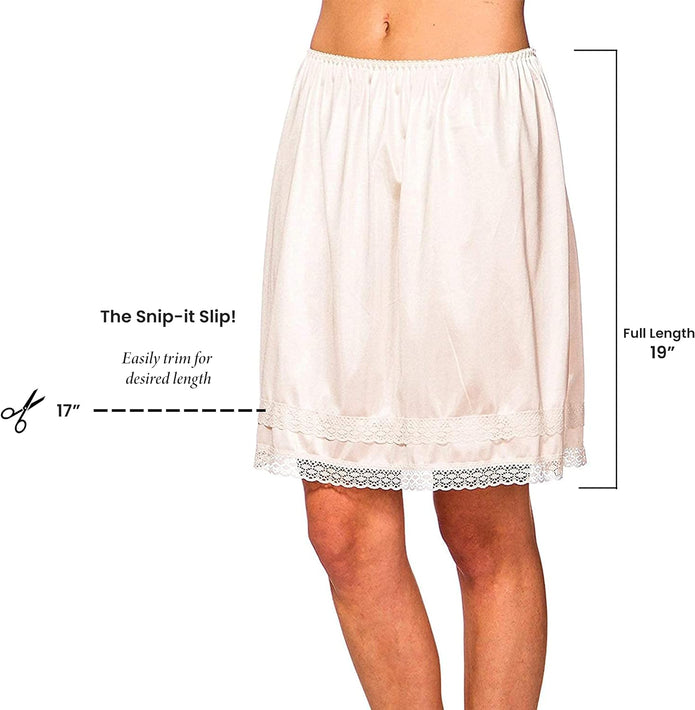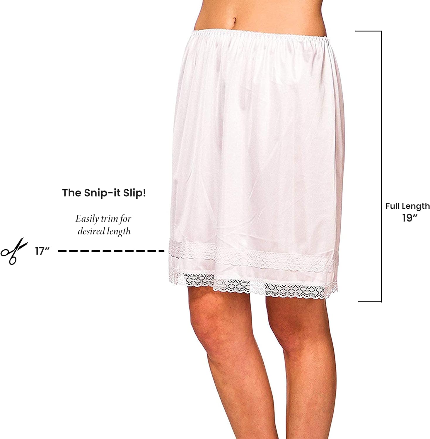 Patricia Lingerie Women's Soft Satin Snip It Half Slip Custom Length Cling Free with Lace Trim, Elastic Waistband