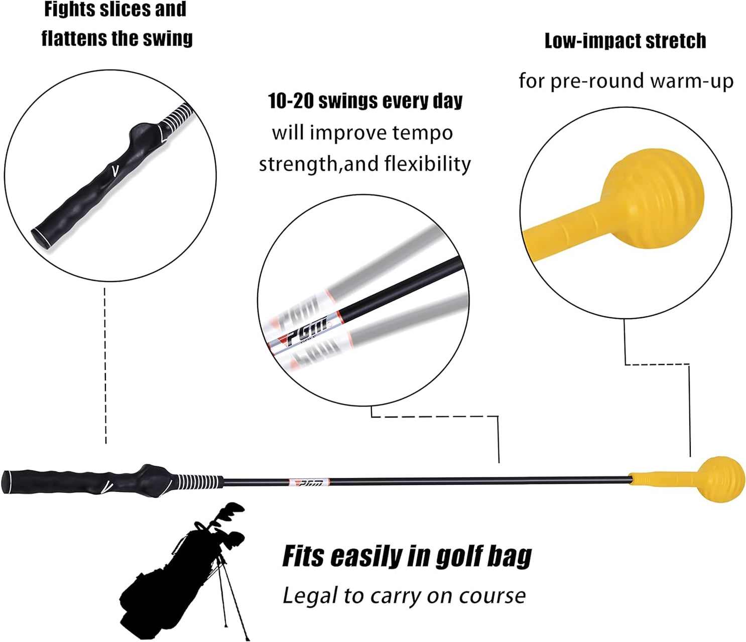 - 【DEVELOP BETTER TEMPO AND CONTROL】PGM golf tempo stick has flexible shaft coordinates the rhythm between your arms, upper body, and lower body. So if you want more power, more control over your swing. You have to learn to put some pressure on the golf warm up club. If you swing the racket correctly, you will apply the bend to this tempo trainer, you should always keep the bend and bend the stick of this practice swing trainer as much as possible