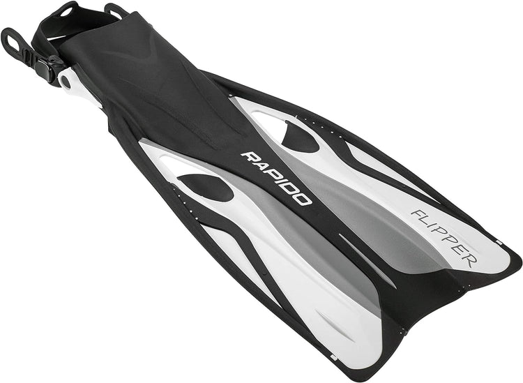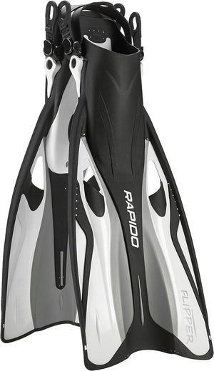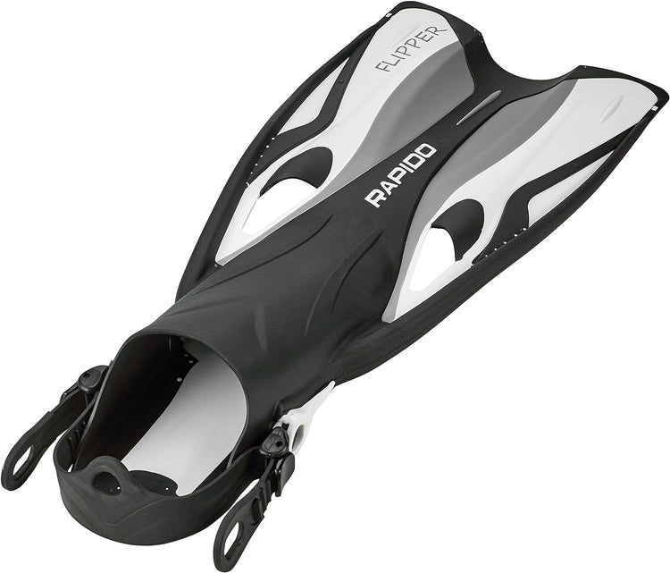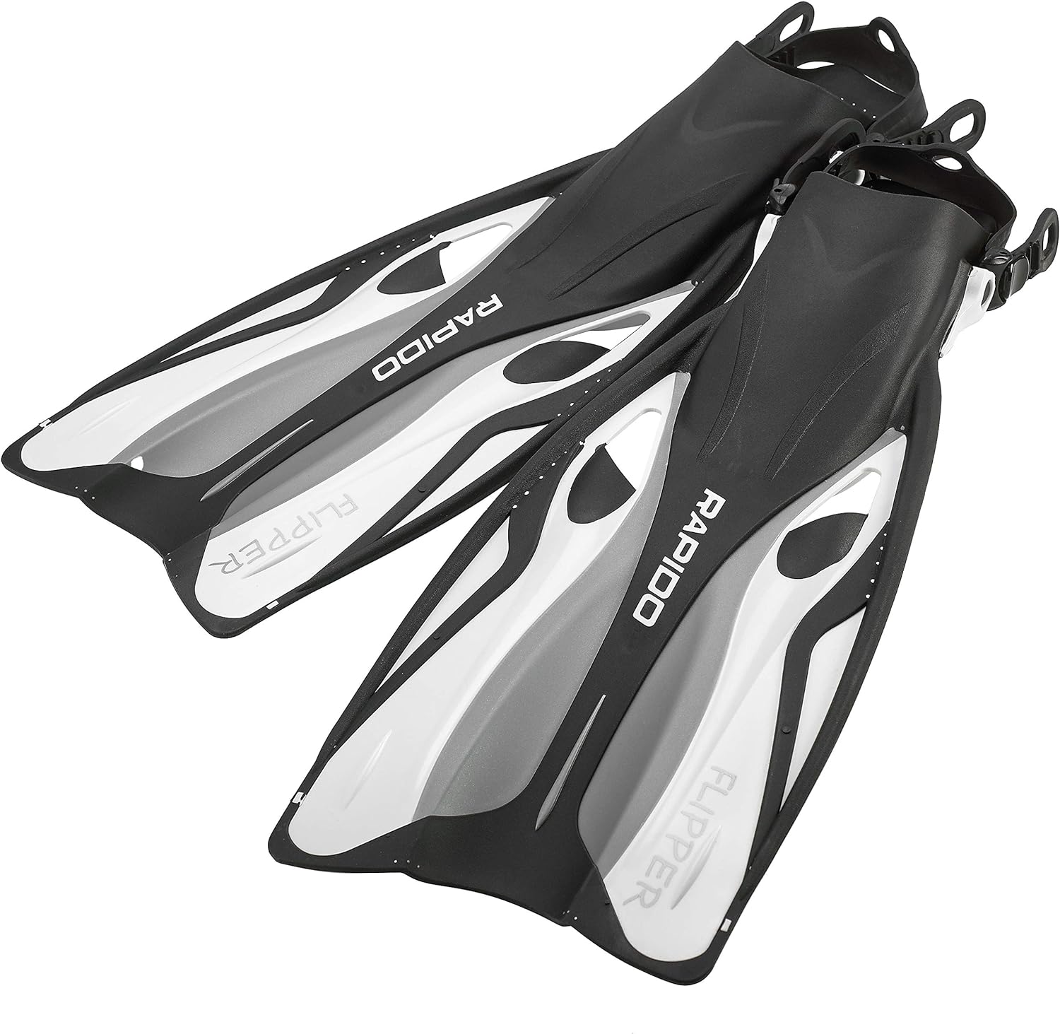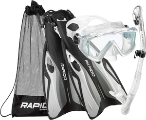 Enjoy the underwater life with the Rapido Boutique Collection Clareza Three Window Tempered Glass Lens Mask Fin Snorkel Set with Snorkeling Gear Carry Bag, MASK - Rapido Boutique Collection Clareza Three Lens Tempered Glass Construction Mask, With it's patented tempered single glass lens design, with patented no-seam side windows for increased field of view. The lenses are no-tint glass for greater visual clarity and safety in diving. With its double feathered edge sealing crystal clear silicone rubber skirt for increased comfort, wide split style mask strap and streamline shape combined for a snug fit all makes this one great mask for any watersport enthusiasts. Mask is equipped with push-button swivel buckles for easy adjustment. Mask provides an exceptional panoramic view of the underwater world. Although it is a 3-window mask, the Clareza Three Lens Mask provides a low internal volume that is easy to clear. Mask has an over-molded frame for strength and durability . . . FINS - Rapido Boutique Collection Flipper Open Heel Adjustable Fin, Excellent for snorkeling and ideal for leg workouts in the pool. Experience power and performance with the Rapido Flipper Fins. Designed for adults, these snorkel fins boast a patented, detached foot pocket to help reduce leg cramping, unnecessary stain and fatigue. You'll love the Flipper technology's full power and performance when you sport these Rapido fins all season long. Key Features: Extended sole plate adds thrust, Simple strap adjustment system, Designed for maximum comfort, Durable and offers long lasting performance. Flexible Center Channel Accelerates Water Over The Blade For Improved Efficiency, Reduces the stress on while accelerating the water over the blade, Great flexibility, Long-lasting, Light-weight and wear-resistant, Quick release, Quick - adjust buckle makes adjusting a snap. Super Ergonomic Open Heel Foot Pocket Design: The Flipper fin has an extended sole plate, which adds thrust and relieves strain on your foot. Built with a simple and reliable strap adjustment system for ease of donning and doffing. A contoured foot pocket design gives maximum comfort . . . SNORKEL: Rapido Boutique Collection Maximum Performance Senhora Dry Snorkel, Completely redesigned with more refined and streamlined element, allowing the valve to close quicker than any other dry snorkel. The new barrel shape makes the snorkel more streamlined in the water. Even the snorkel keeper has been improved to include a push button two-piece connector, allowing for easy connection to the mask strap. Patented Senhora Dry prevents water from entering the snorkel eliminating the need for clearing the snorkel. The new barrel and valve design ensures the highest performance and was validated through extensive Ansti testing. Flex section for comfortable positioning and will drop away when not in use. Self-draining purge valve for use when switching from Scuba to snorkel. Pure soft silicone patented Comfy silicone mouthpiece.
