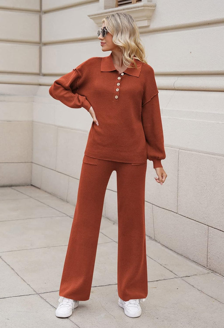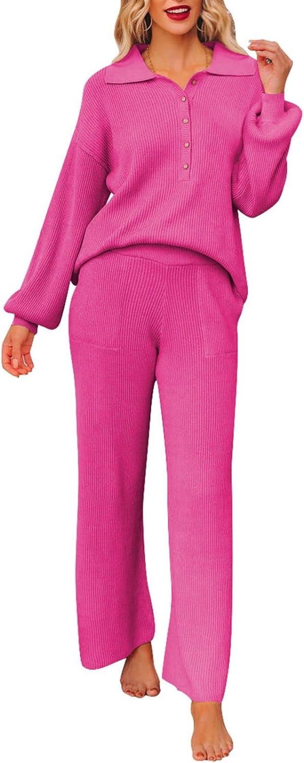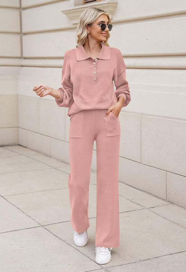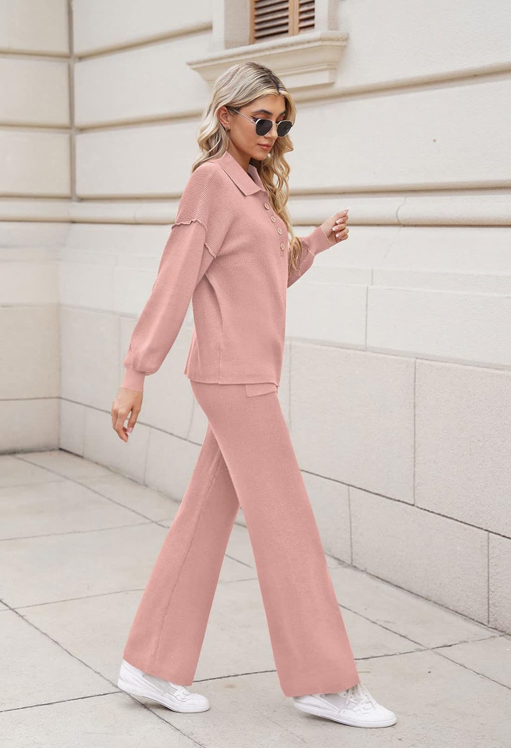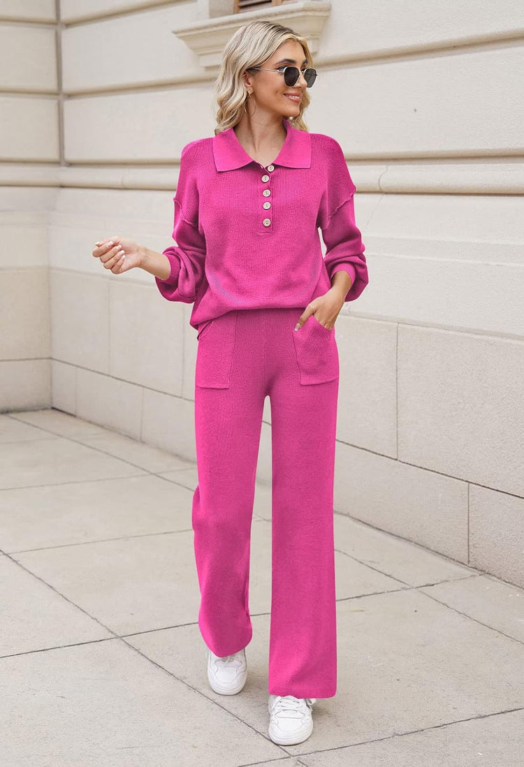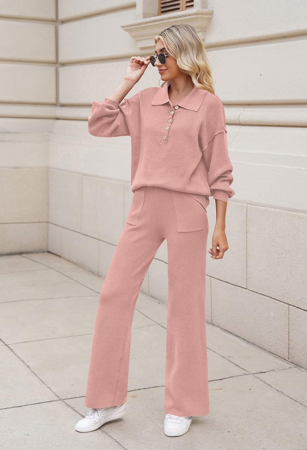 Pink Queen Women's 2 Piece Outfit Sweater Set Long Sleeve Button Knit Pullover Top Wide Leg Pants Pocket Sweatsuit