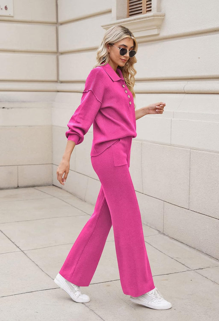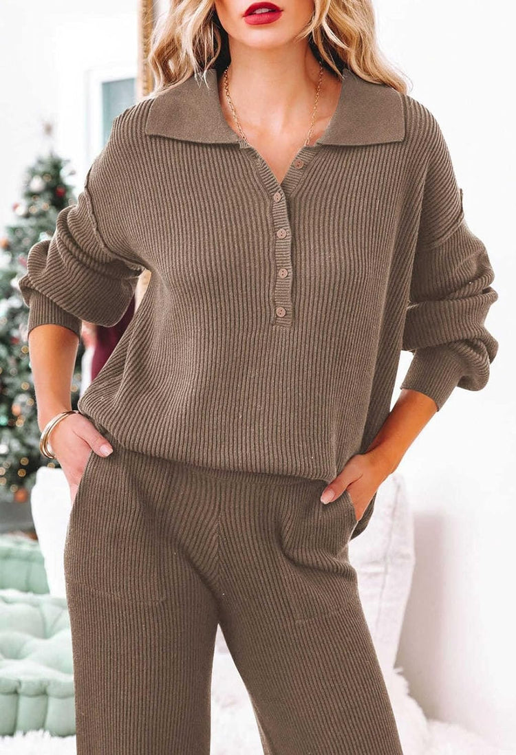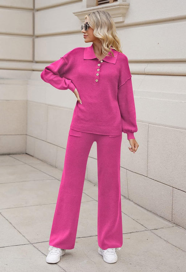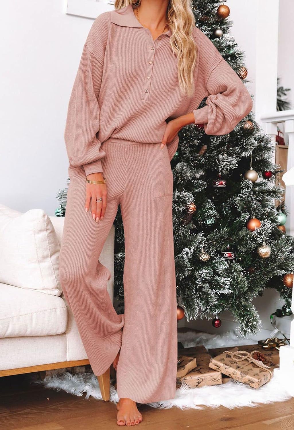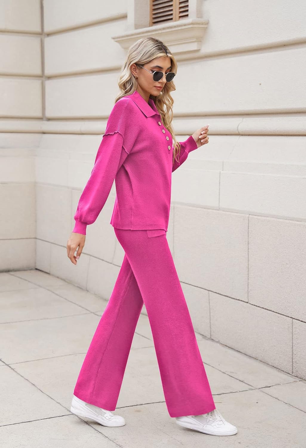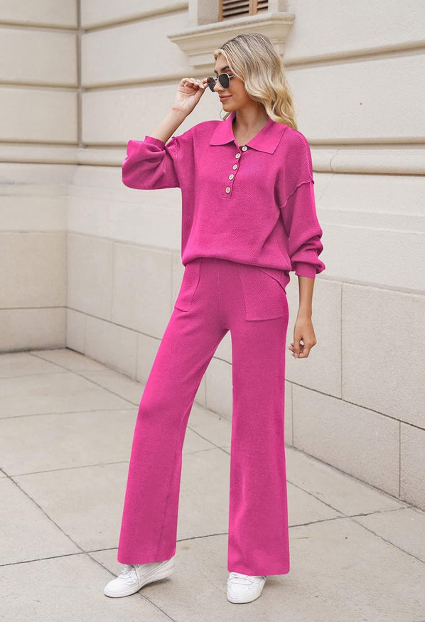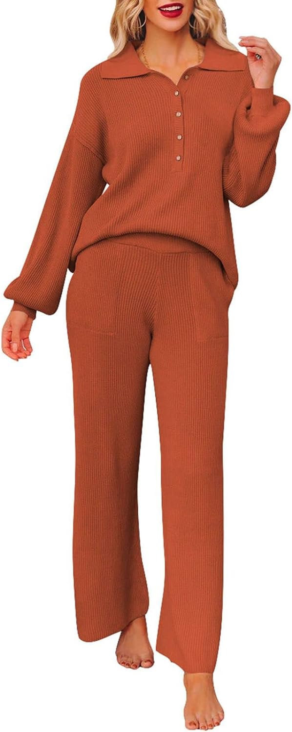 Pink Queen Women's 2 Piece Outfit Sweater Set Long Sleeve Button Knit Pullover Top Wide Leg Pants Pocket Sweatsuit