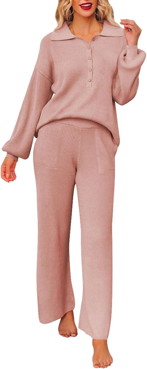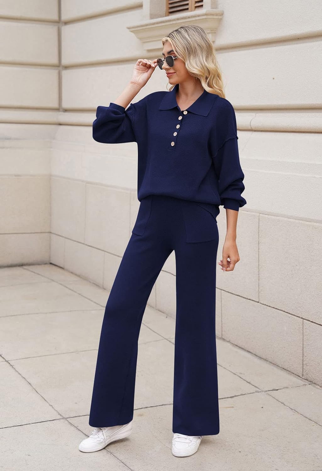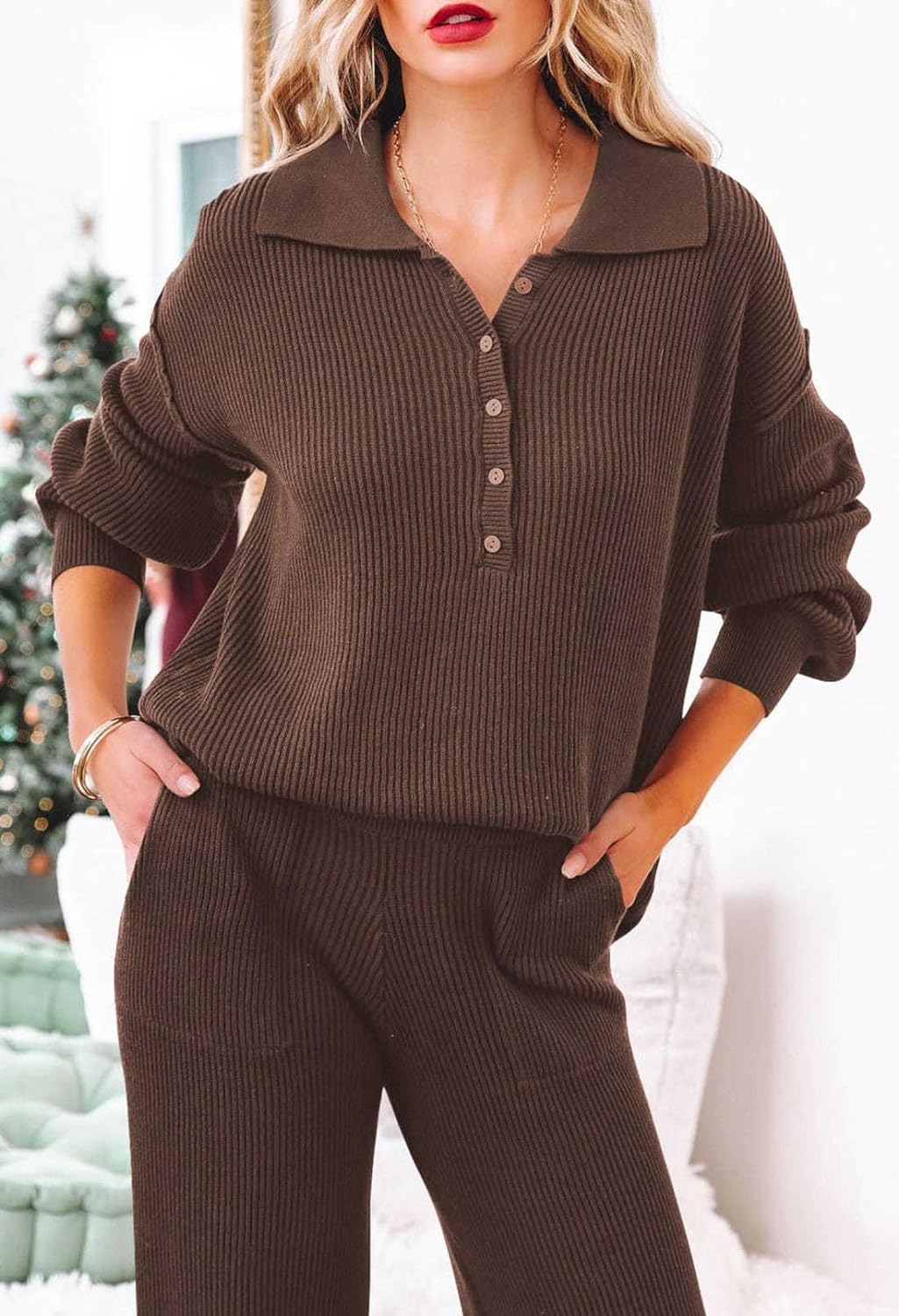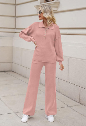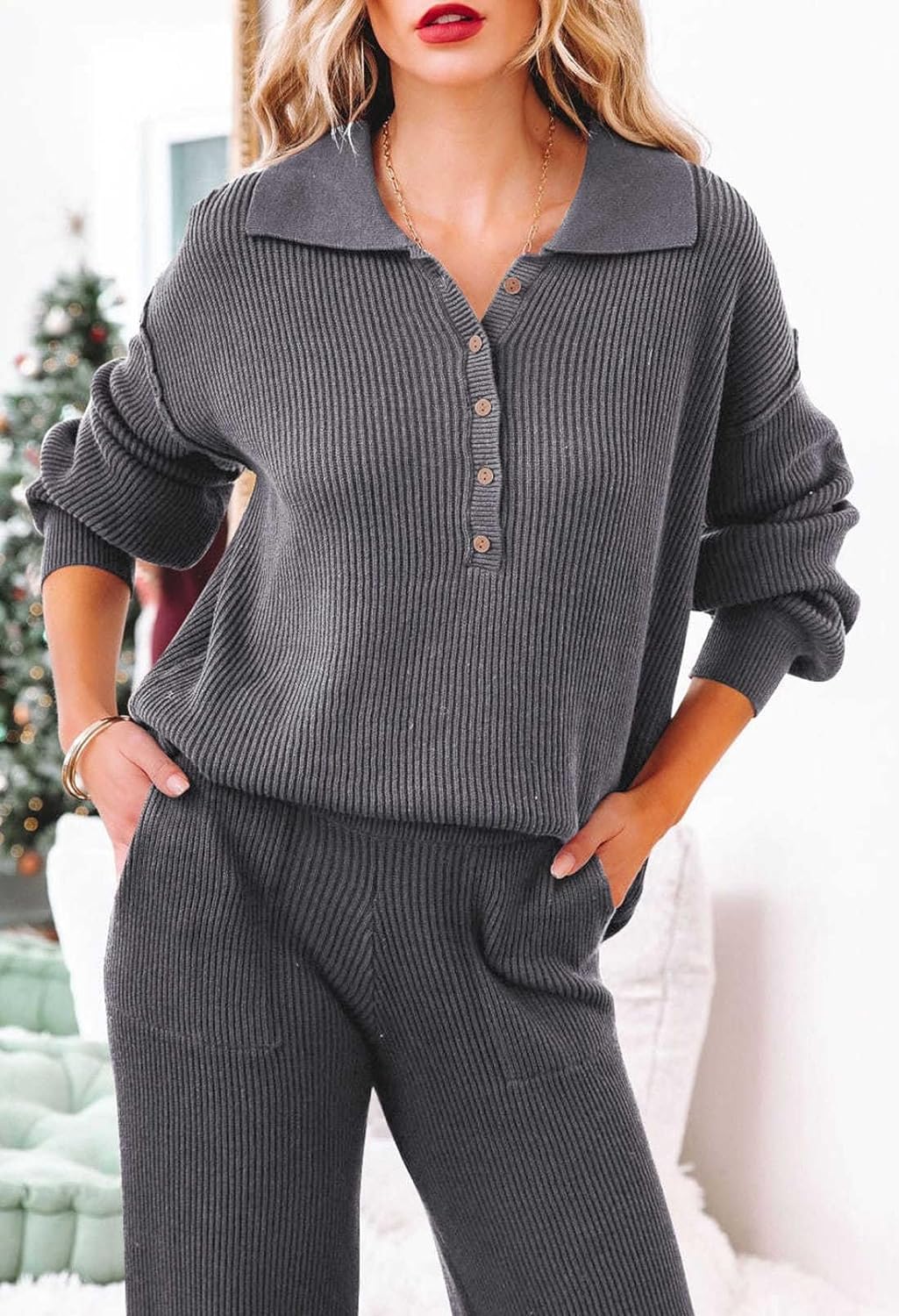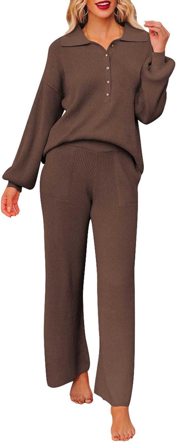 Pink Queen Women's 2 Piece Outfit Sweater Set Long Sleeve Button Knit Pullover Top Wide Leg Pants Pocket Sweatsuit