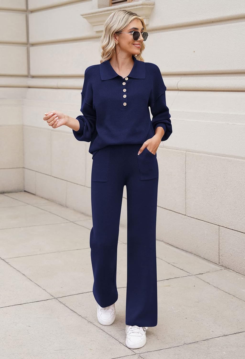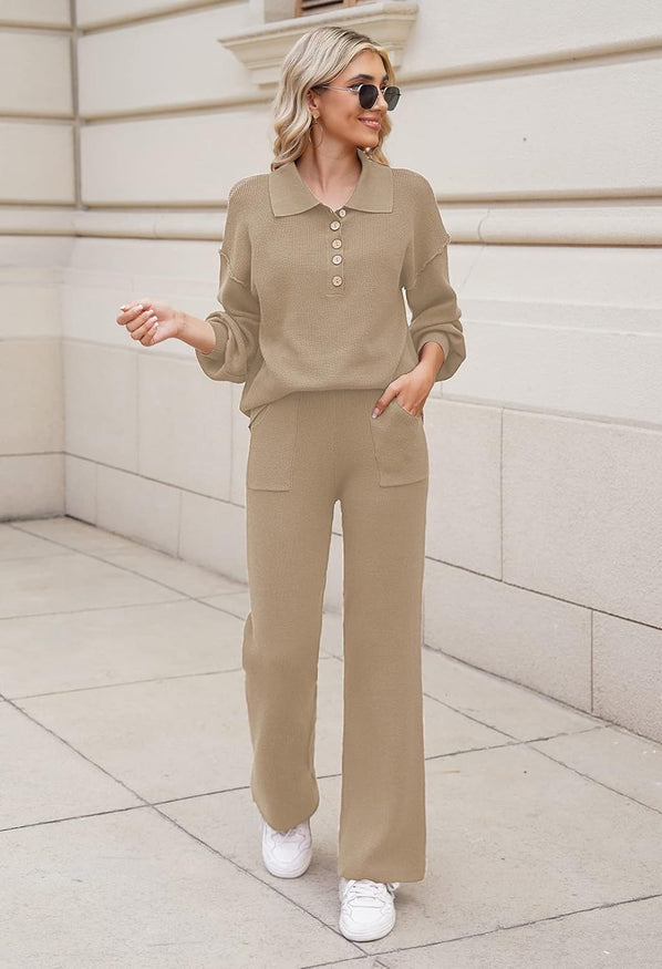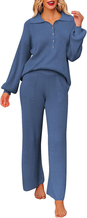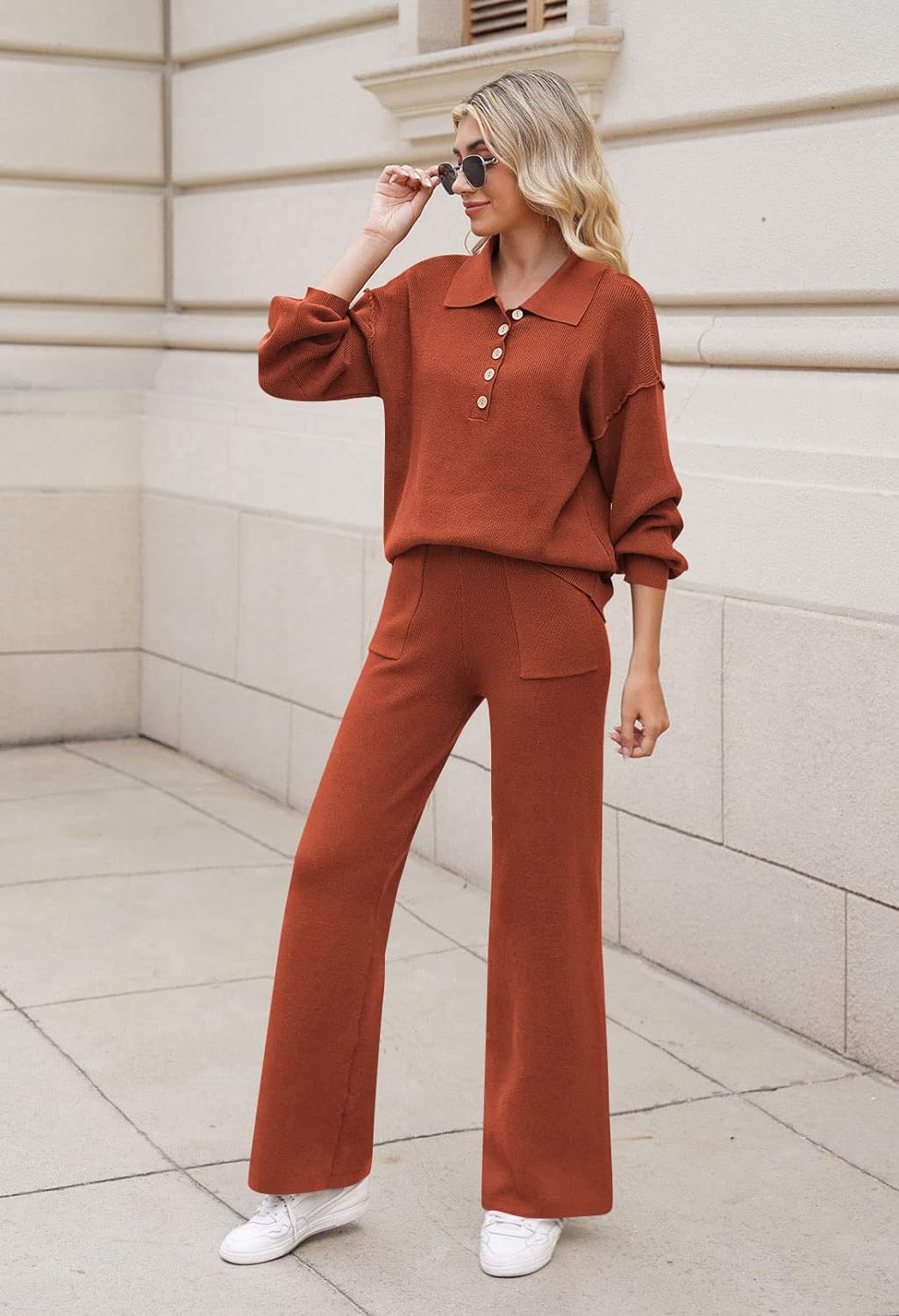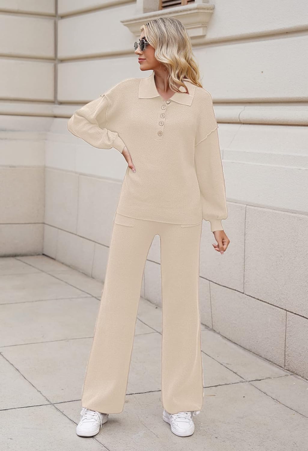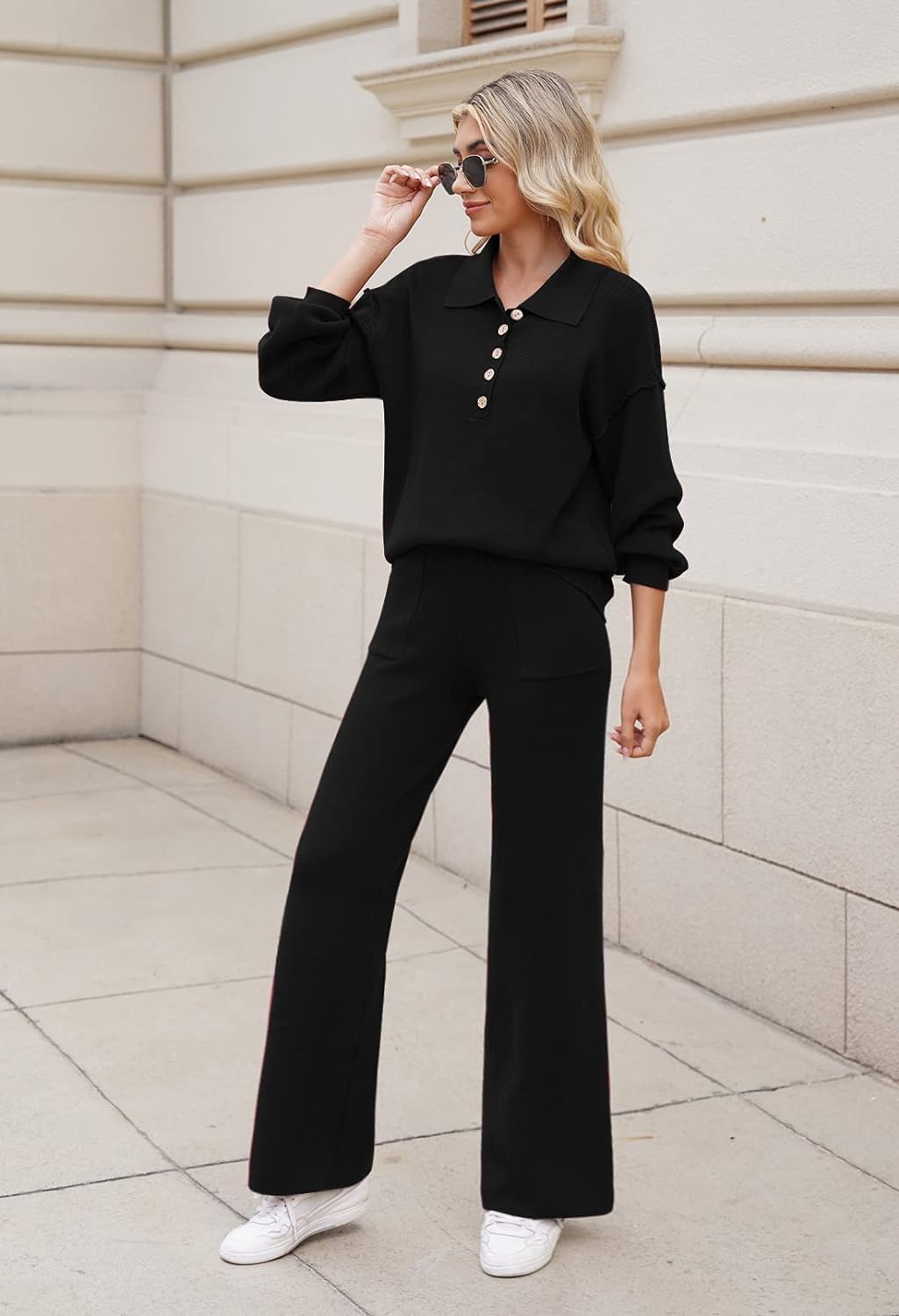 Pink Queen Women's 2 Piece Outfit Sweater Set Long Sleeve Button Knit Pullover Top Wide Leg Pants Pocket Sweatsuit