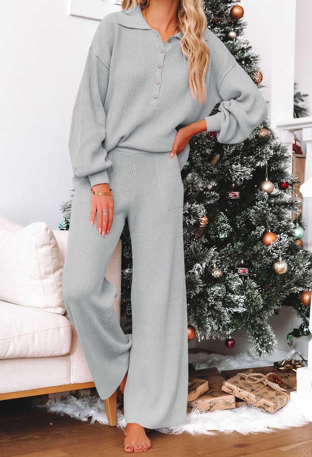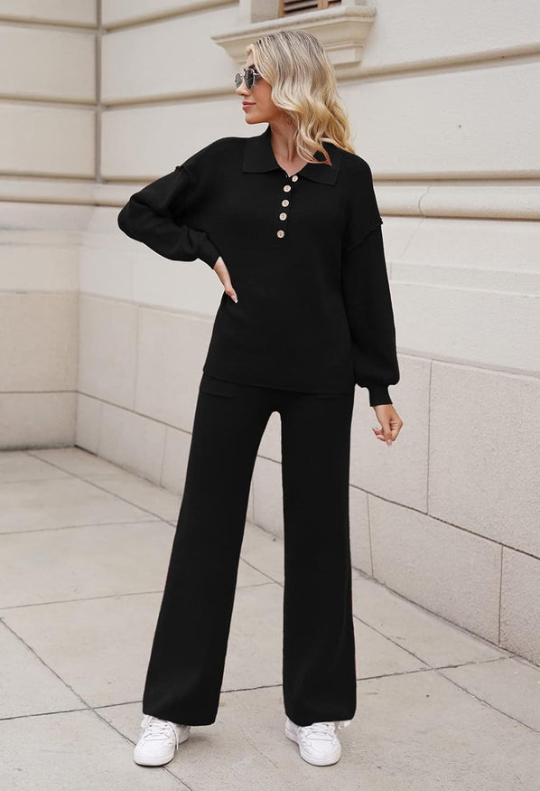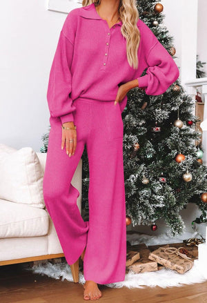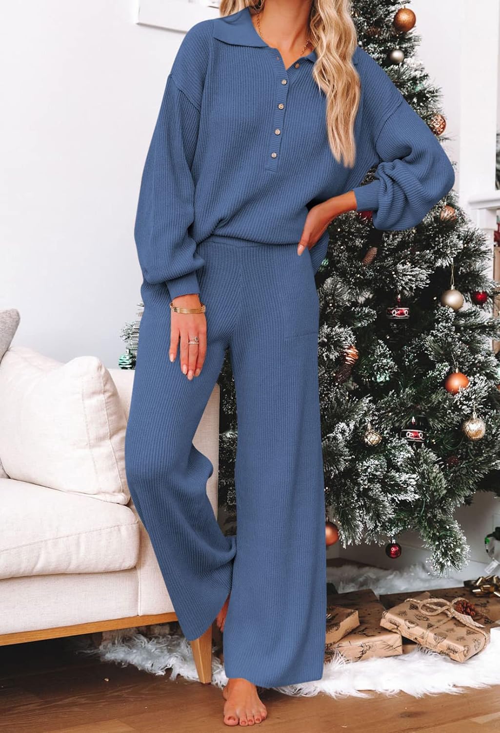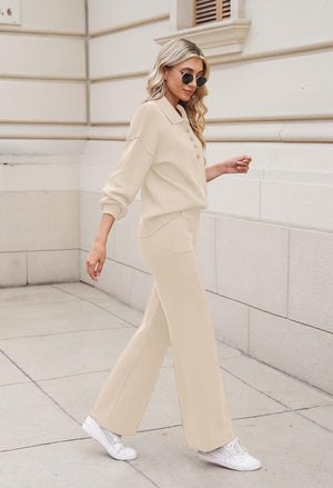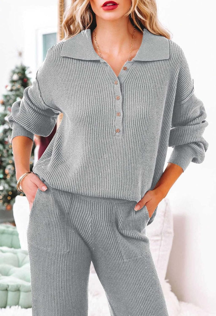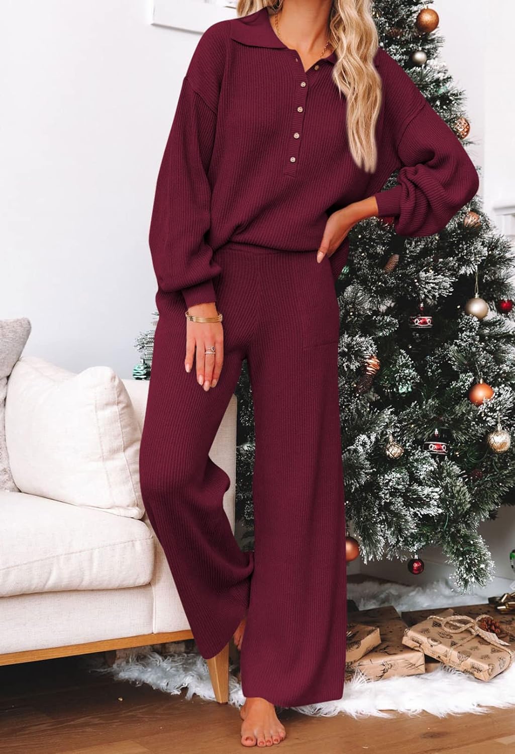 Pink Queen Women's 2 Piece Outfit Sweater Set Long Sleeve Button Knit Pullover Top Wide Leg Pants Pocket Sweatsuit
