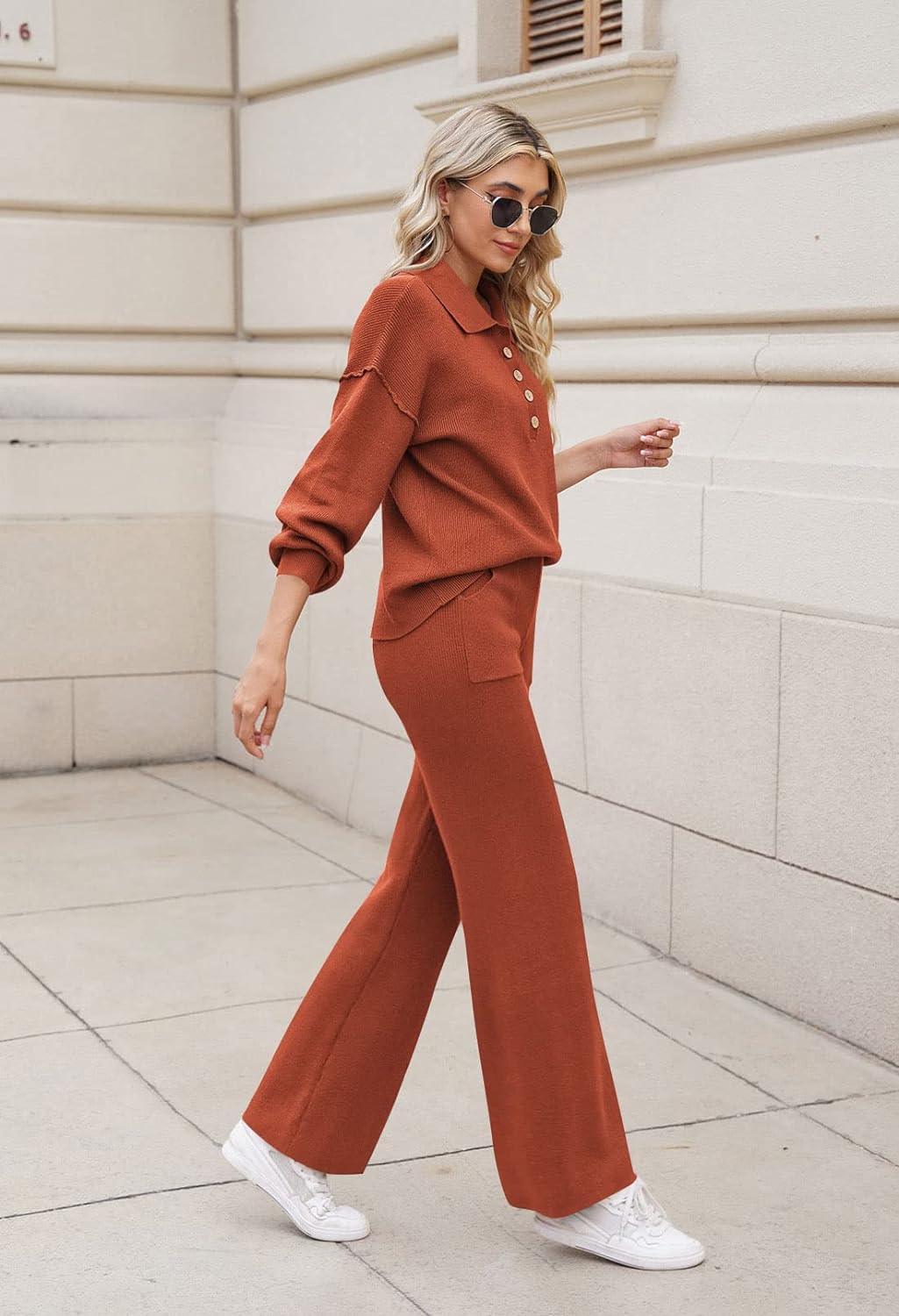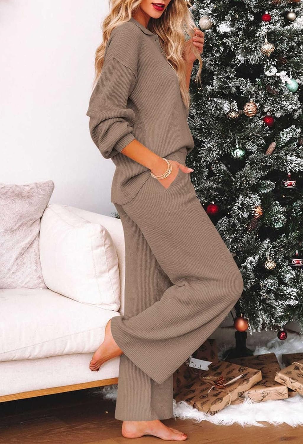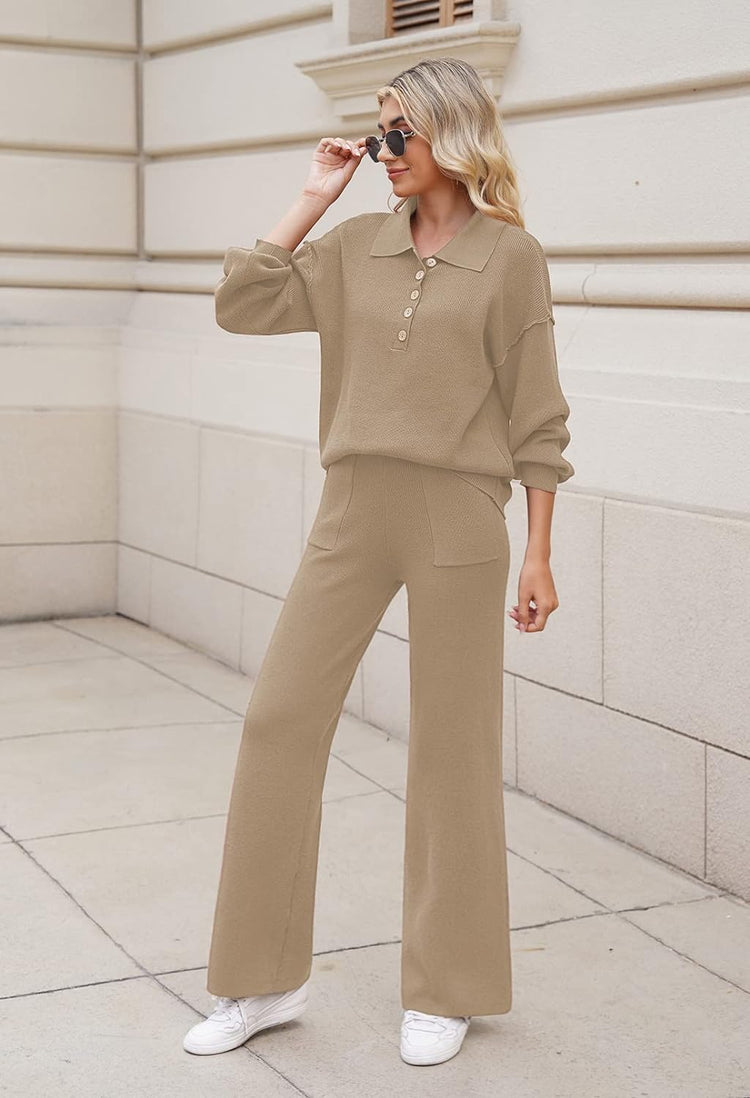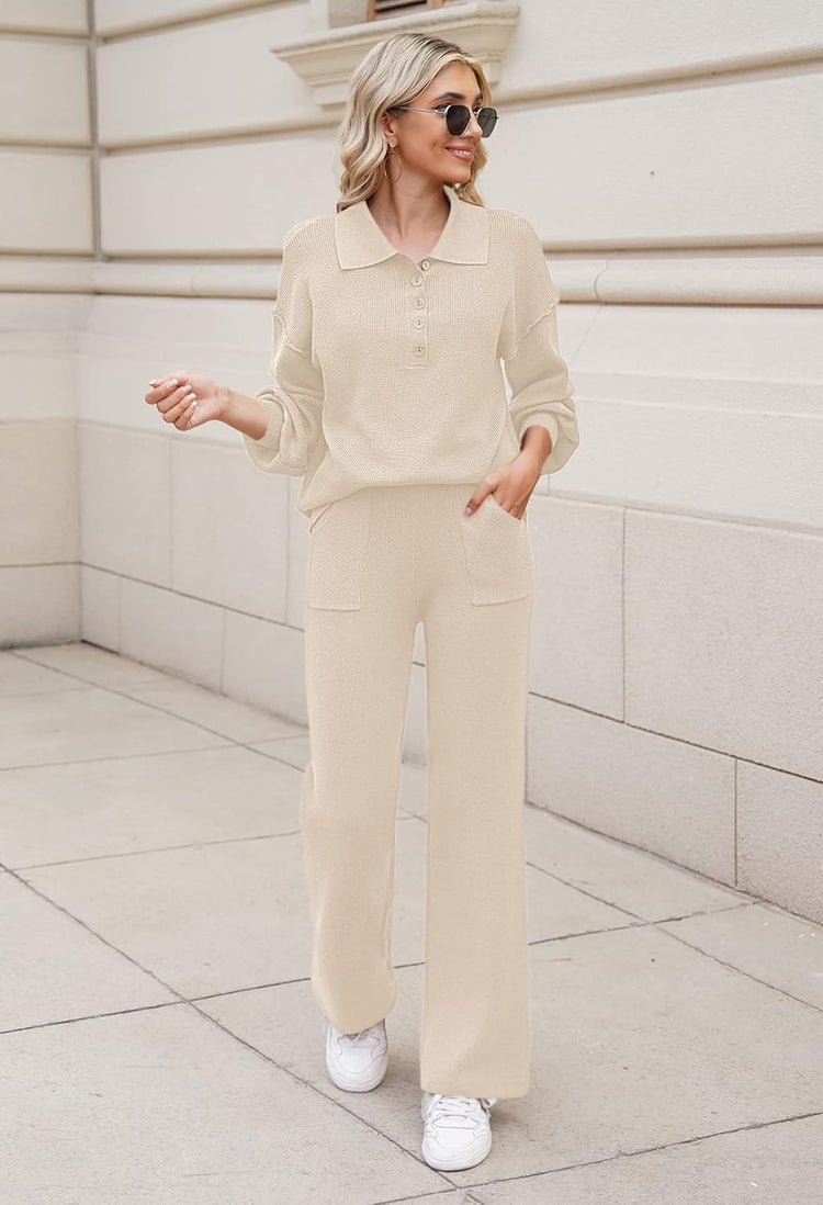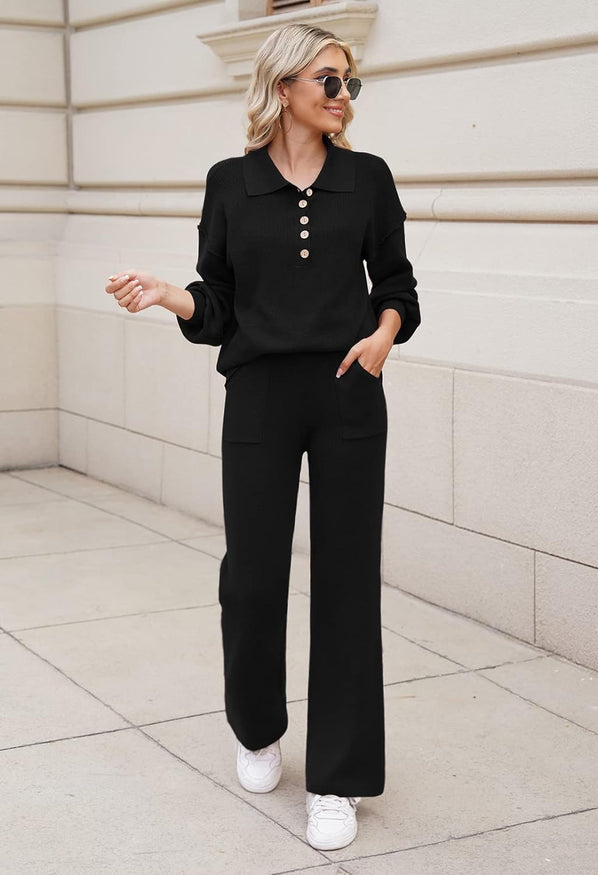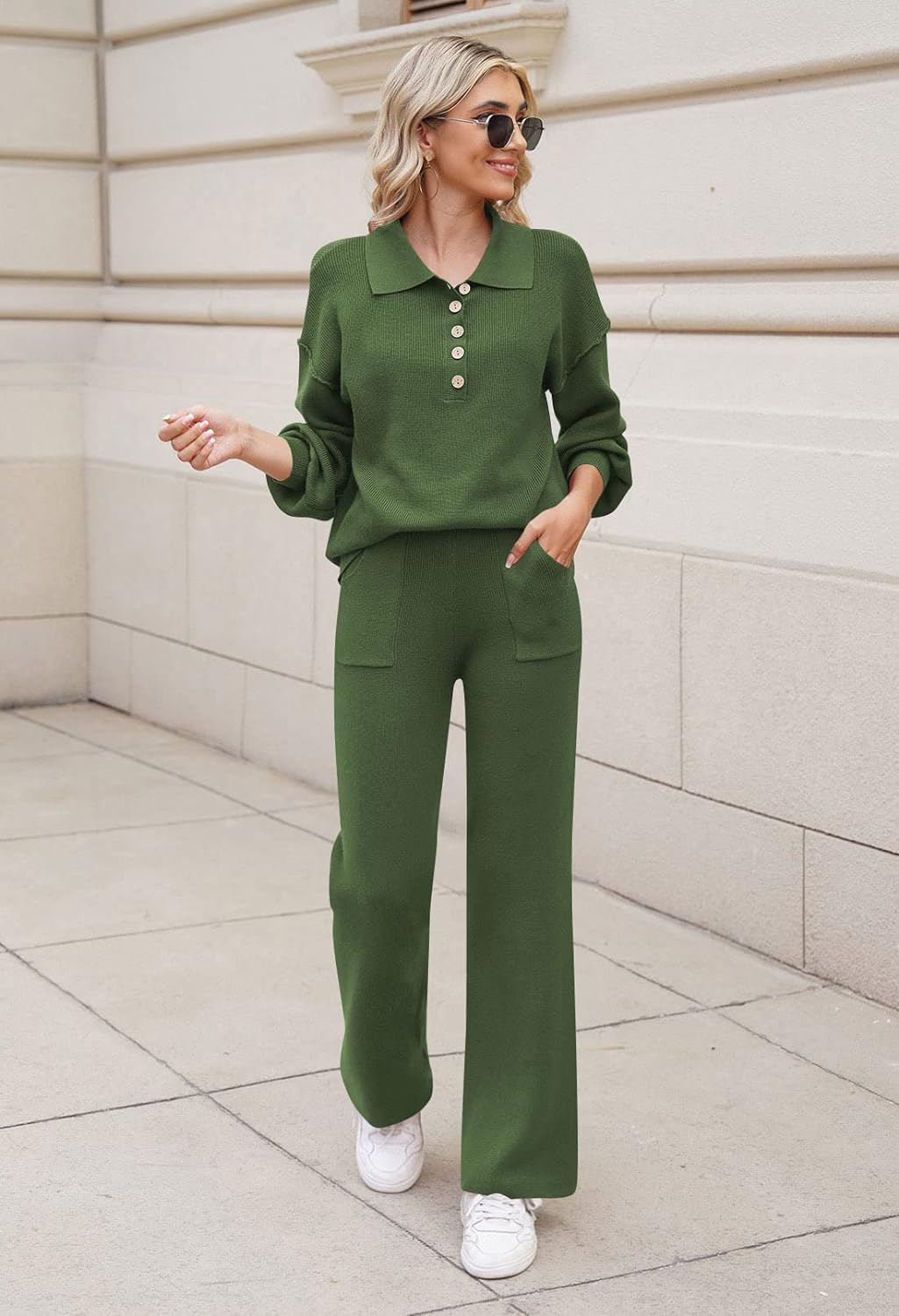 Pink Queen Women's 2 Piece Outfit Sweater Set Long Sleeve Button Knit Pullover Top Wide Leg Pants Pocket Sweatsuit