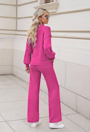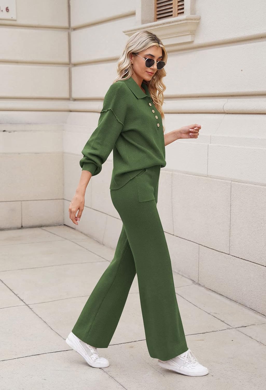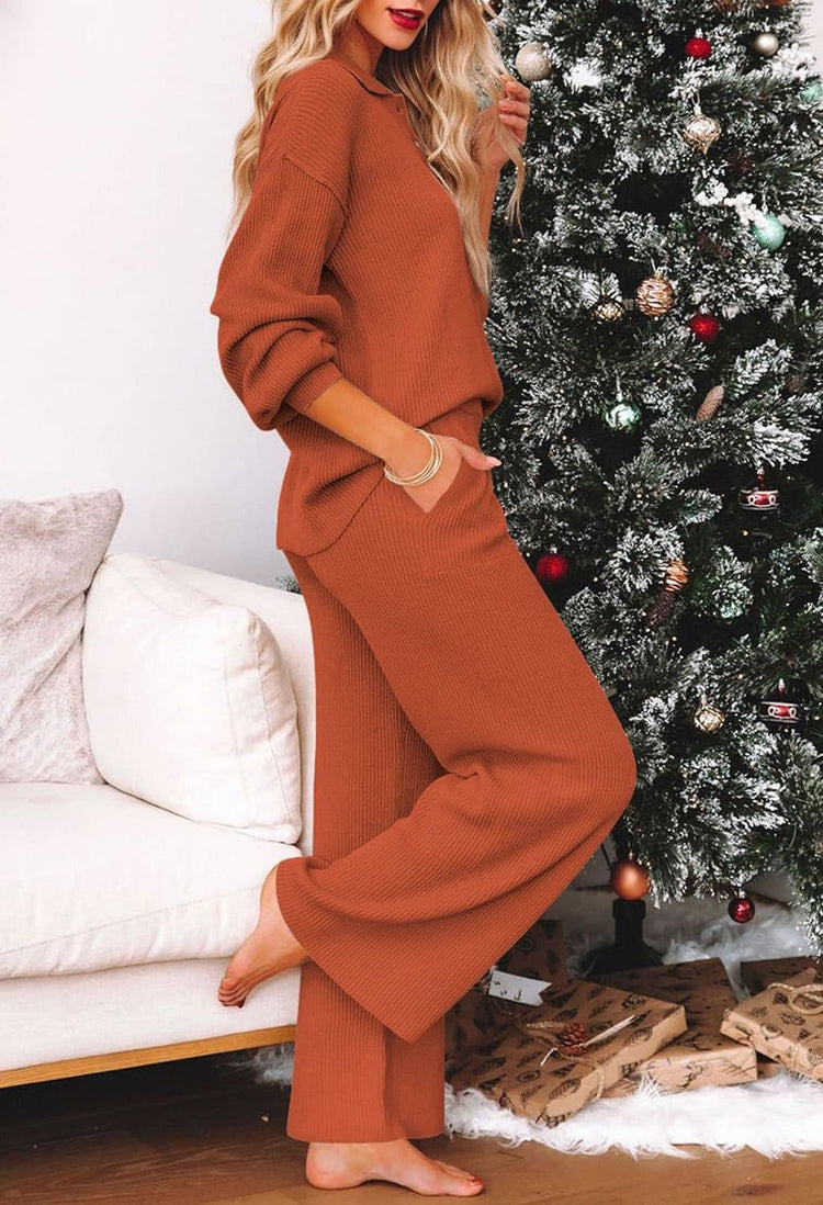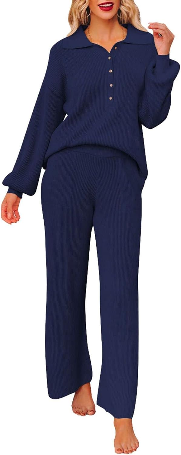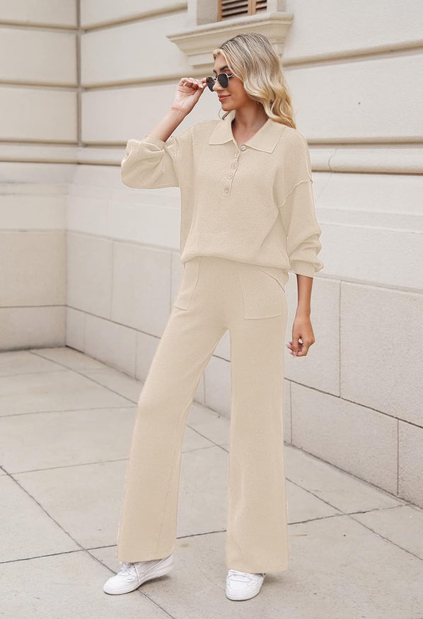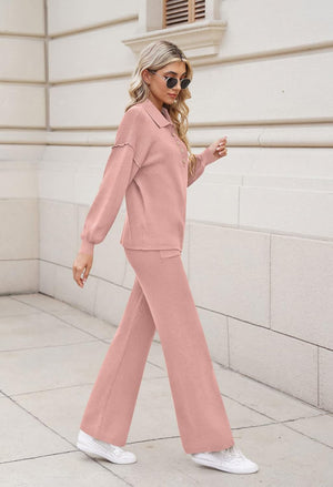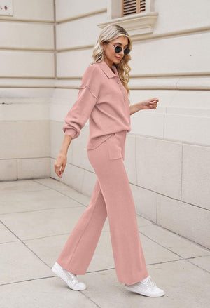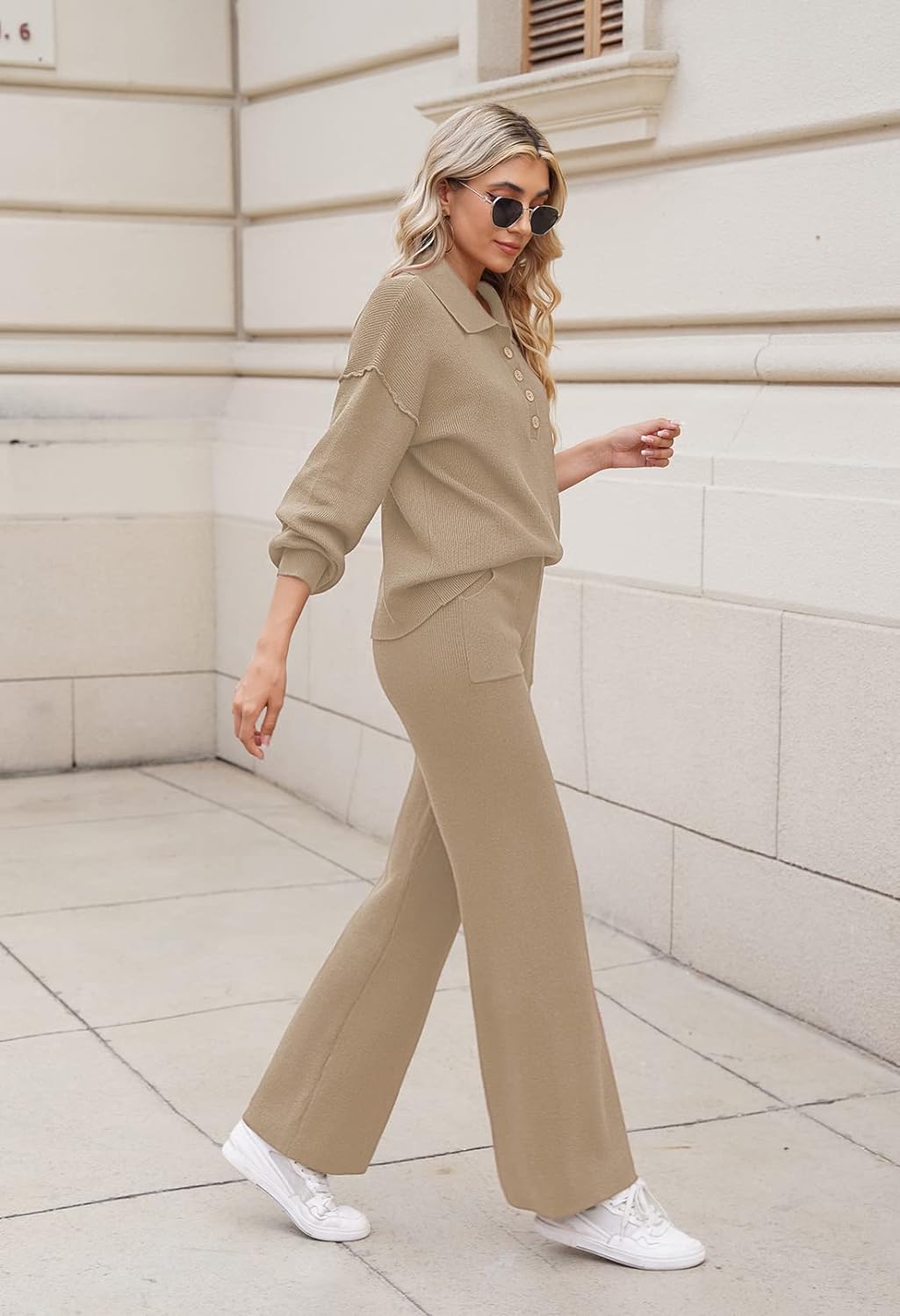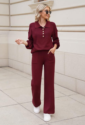 Pink Queen Women's 2 Piece Outfit Sweater Set Long Sleeve Button Knit Pullover Top Wide Leg Pants Pocket Sweatsuit
