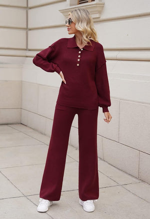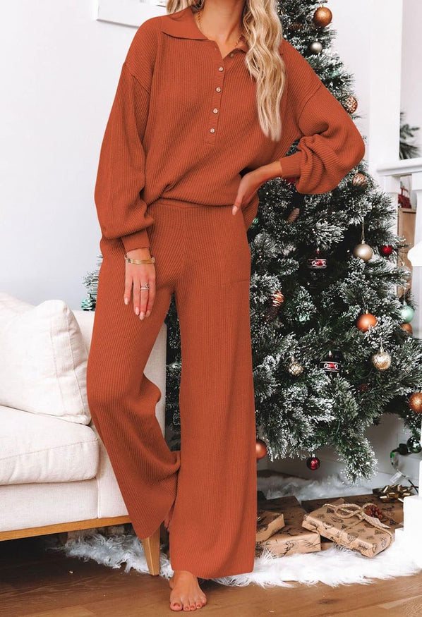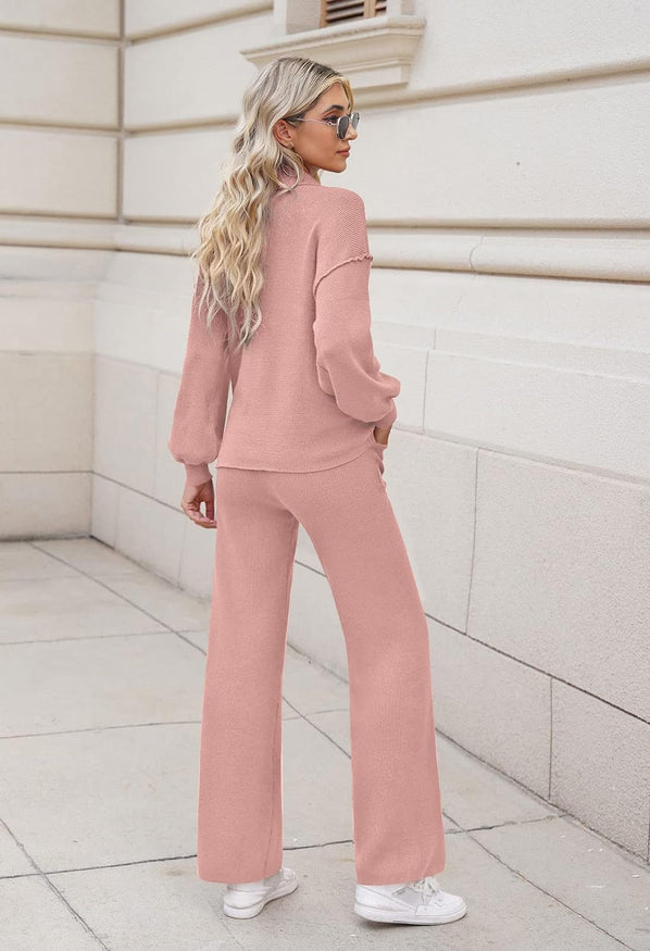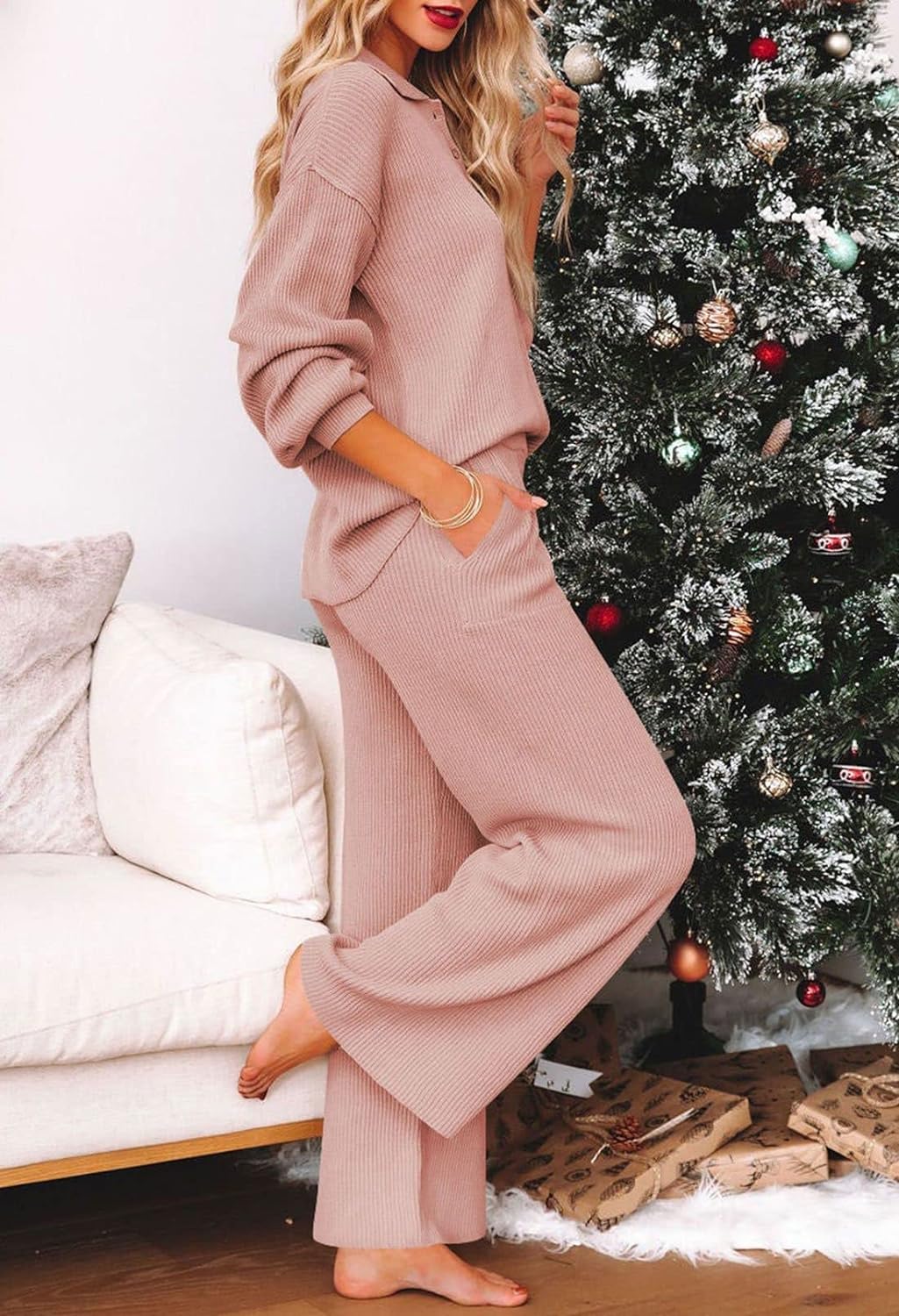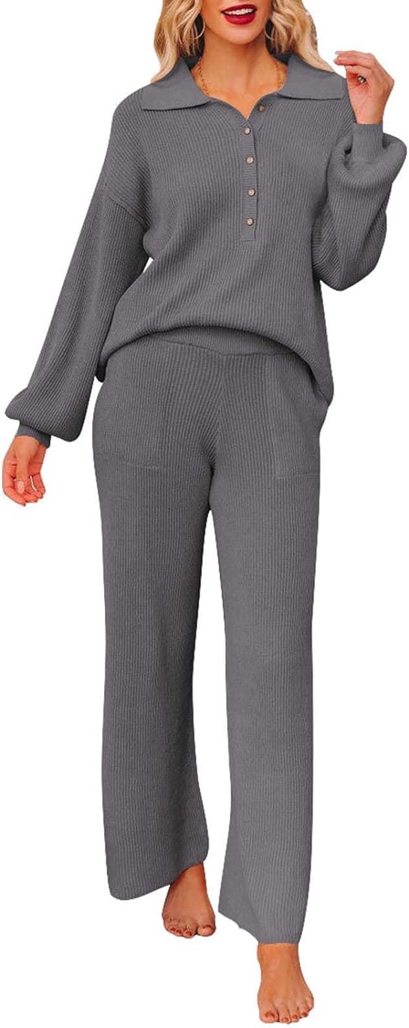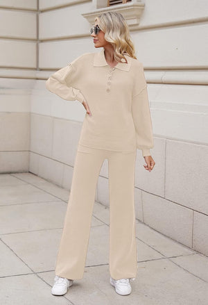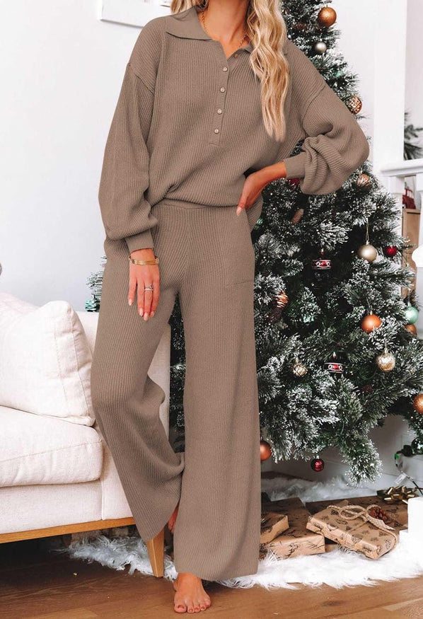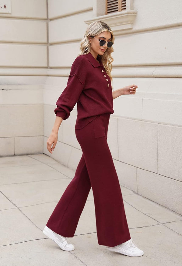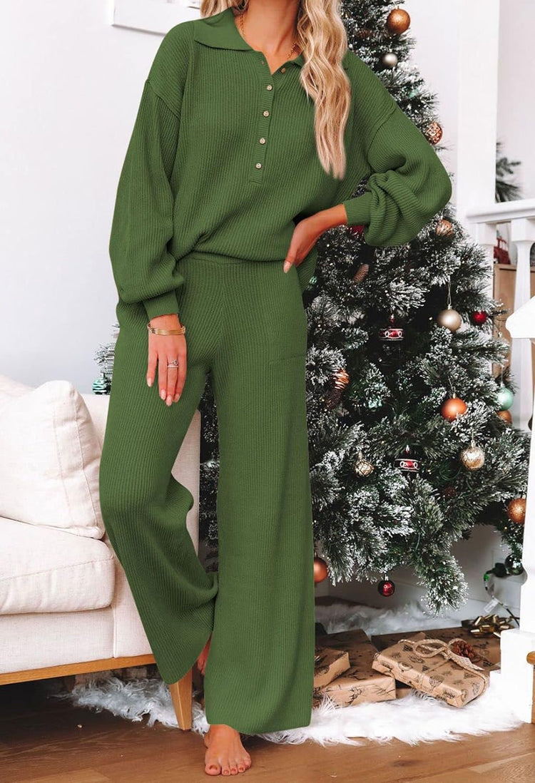 Pink Queen Women's 2 Piece Outfit Sweater Set Long Sleeve Button Knit Pullover Top Wide Leg Pants Pocket Sweatsuit