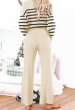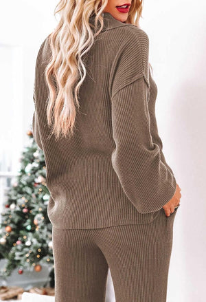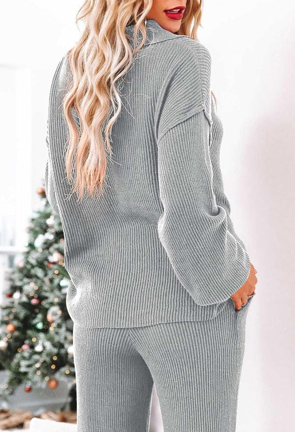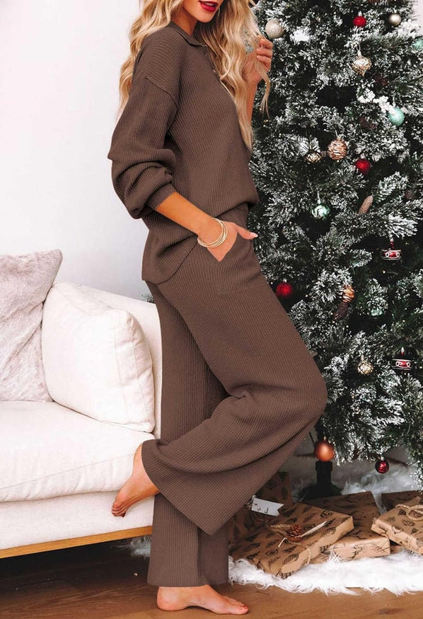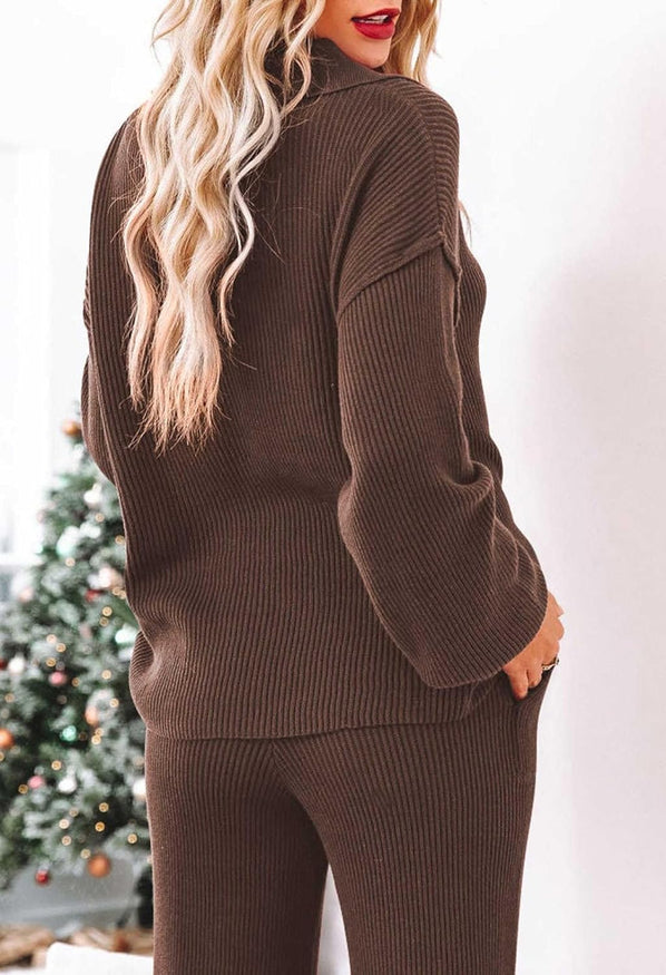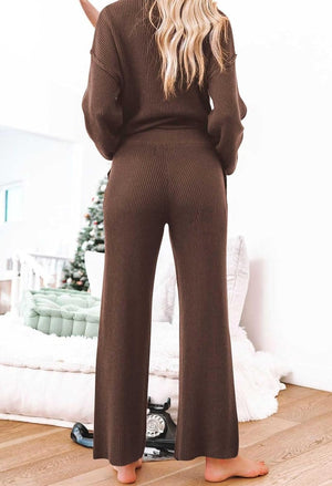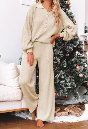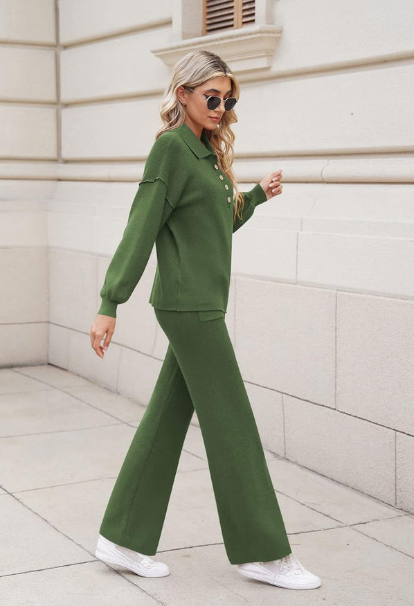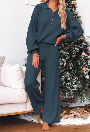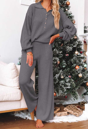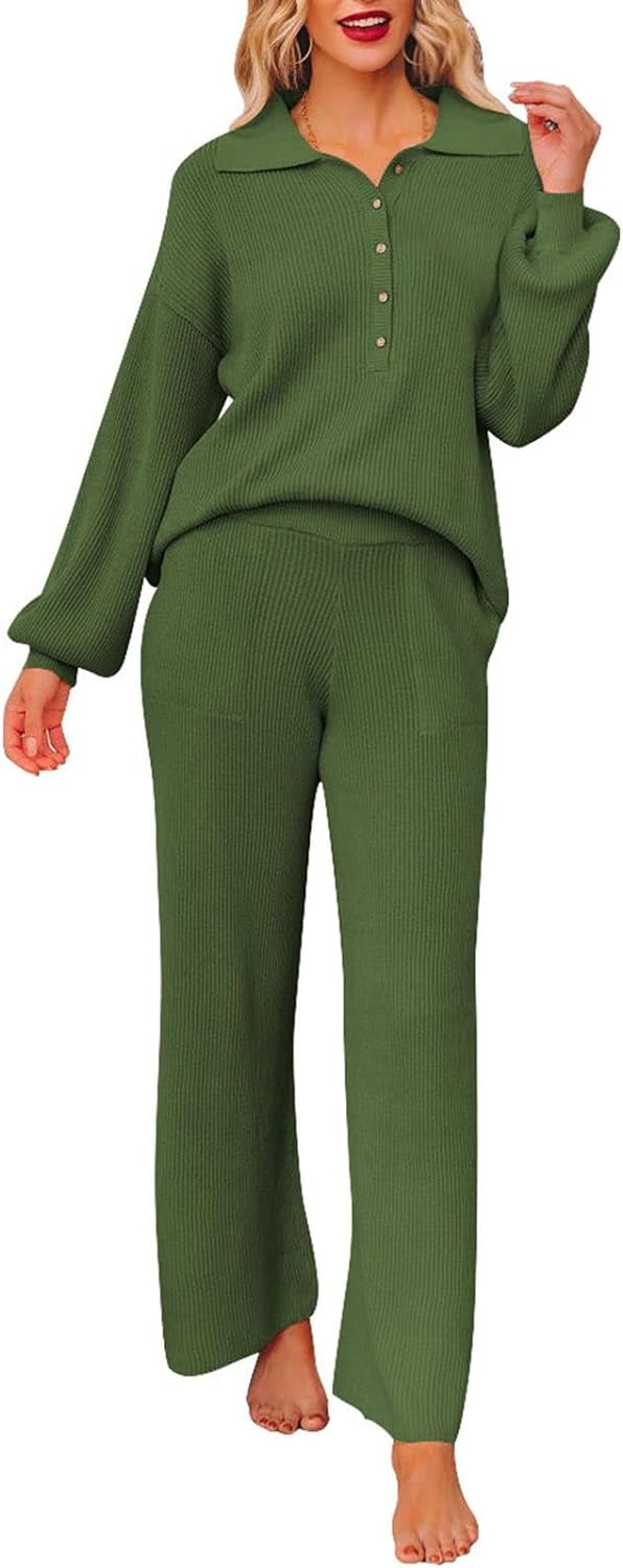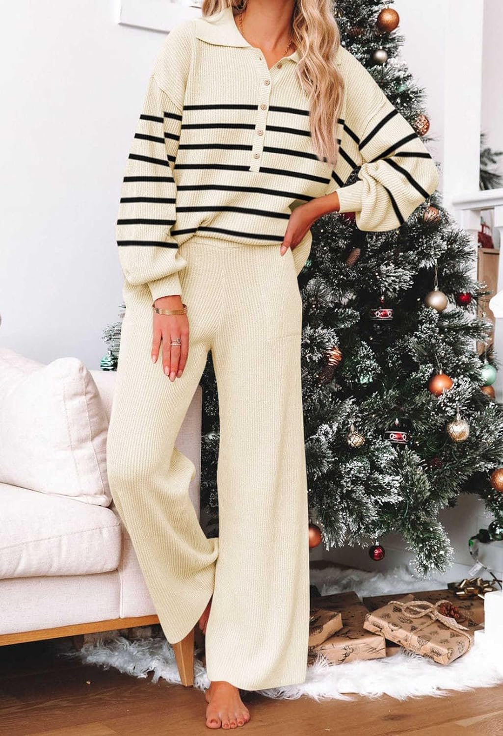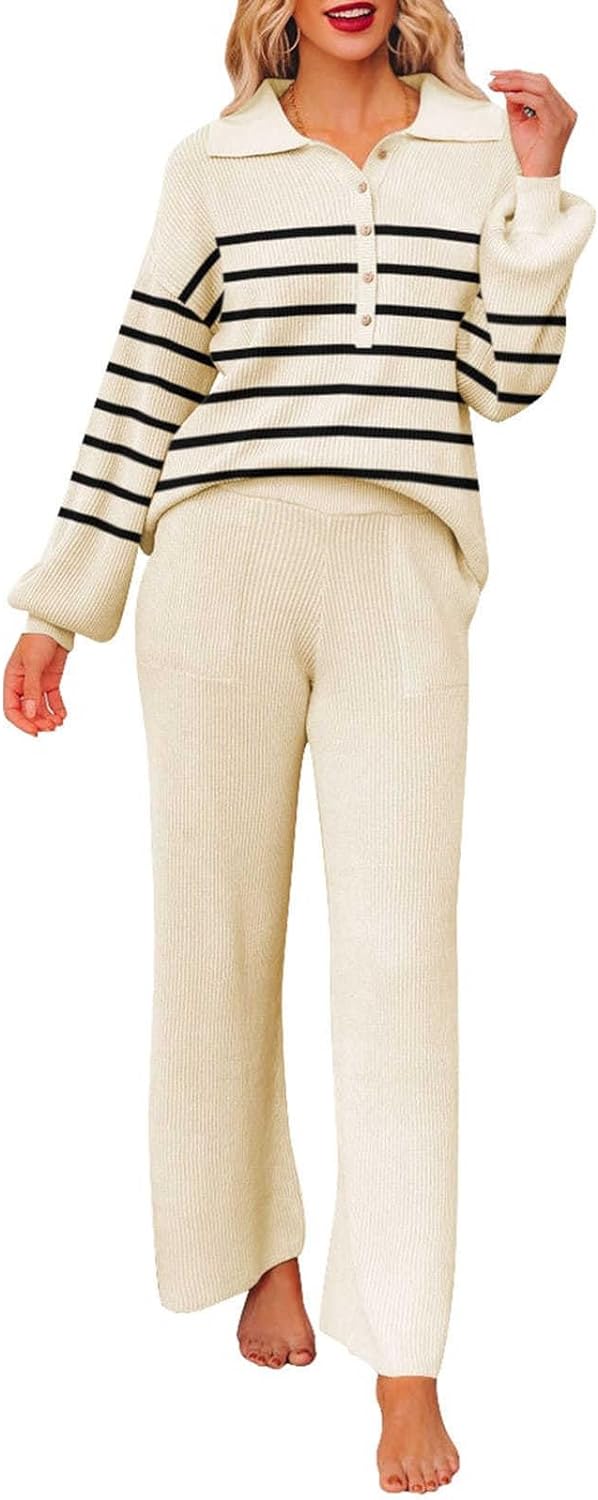 Pink Queen Women's 2 Piece Outfit Sweater Set Long Sleeve Button Knit Pullover Top Wide Leg Pants Pocket Sweatsuit