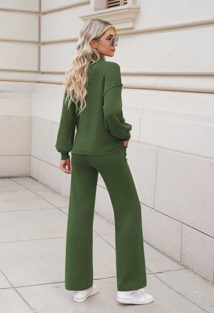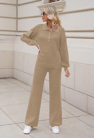 Fashion pullover sweatsuits for women/ 2 pieces bubble long sleeve outfits set/ classic v neck loungewear suits/ button Knit Pullover sweater tracksuits/ high waisted wide leg pants/ puff long sleeve workout set/ casual 2 piece oversized sport set/ sport pullover tracksuit / women jogger set