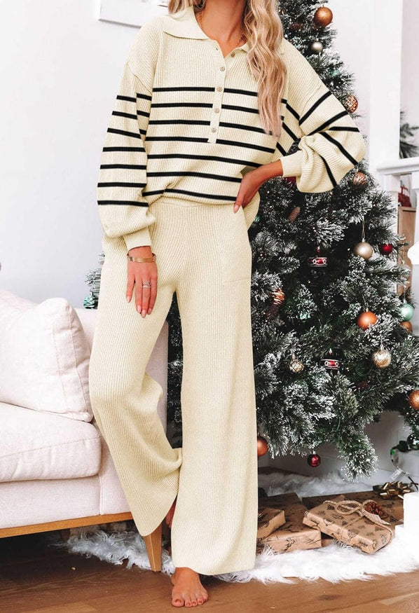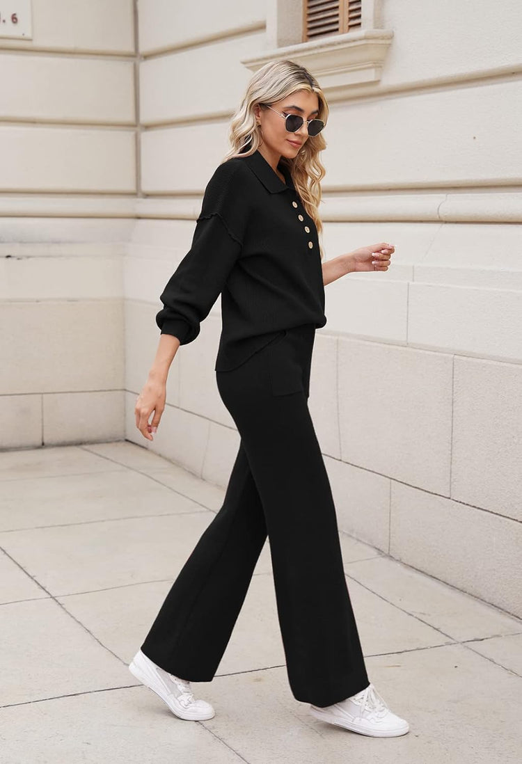 Pink Queen Women's 2 Piece Outfit Sweater Set V Neck Long Sleeve Button Knit Pullover Top And Wide Leg Pants Sweatsuit