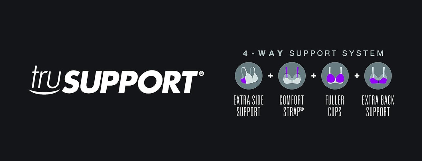 Welcome to a world of lift, shape, and sublime comfort in any size with the Playtex Secrets® balconette full-coverage wireless T-shirt bra. This could be the most comfortable wireless bra you've ever owned. A dream for fuller figures, it's designed with the remarkable TruSupport® 4-way support system with higher sides to help control bulges, fuller cups for natural shaping, wider straps for all-day ease, and a smoother back for stability. Its modern, open balconette styling and flattering sweetheart neckline are complemented with beautiful satin trim. Foam-lined cups and a built-in comfort band provide outstanding wireless support. You'll appreciate the oh-so-smooth cups that practically disappear under even clingy clothes. Plus the comfort straps are carefully designed to relieve pressure on your shoulders. In any size, this wireless balconette bra is one to love.
