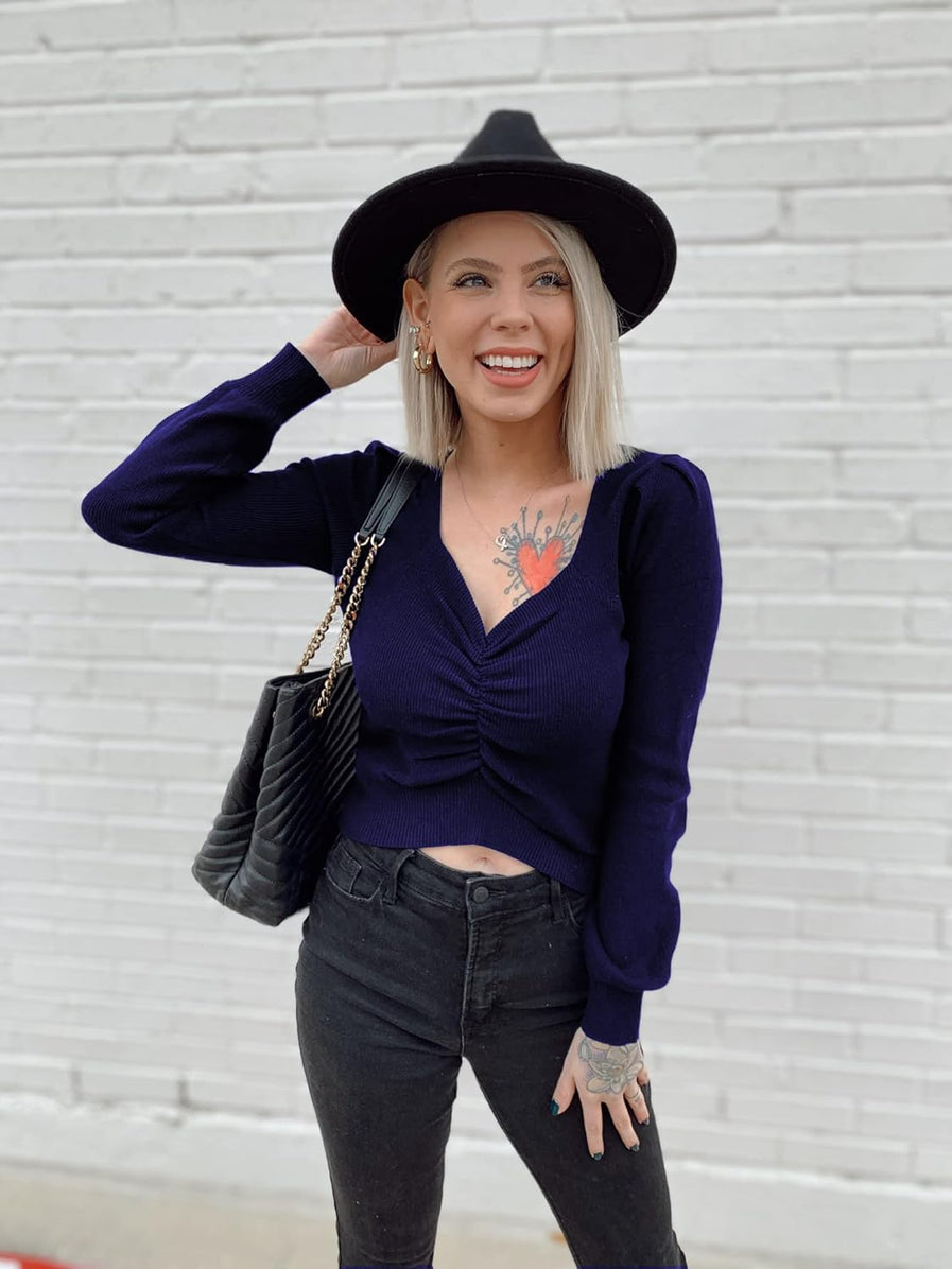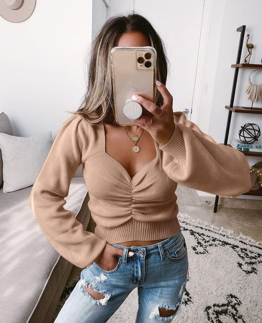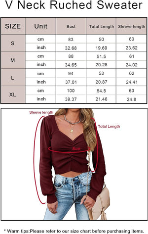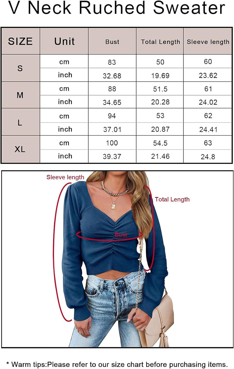 Features:Ruched long sleeve top,off the shoulder tops,ruched top,fitted sweater, v-neck sweater,long sleeve tops for women sexy casual Colors:Cropped white sweater,jujube red cropped sweater,cropped black sweater,apricot womens going out tops long sleeve,pink off shoulder top,dark sea blue sweater crop tops,olive green ruched long sleeve tops for women,dark apricot long sleeve fashion tops for women,bright blue cute long sleeve tops,bright blue ruched sweater,grey cute tops for women trendy going out