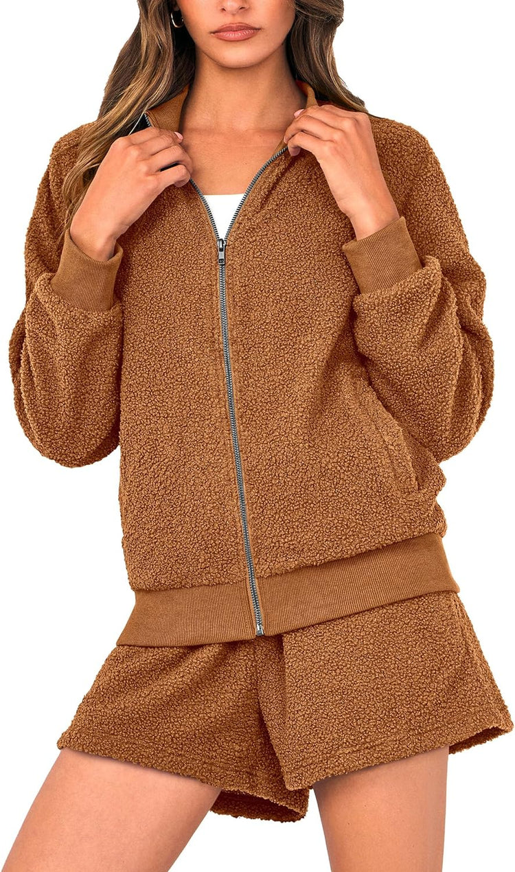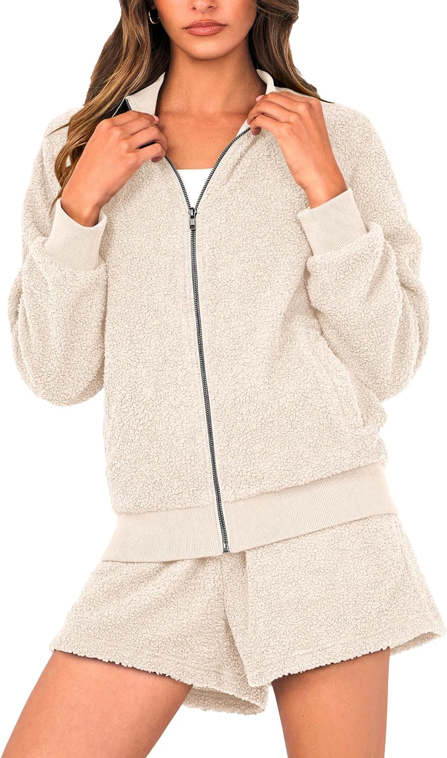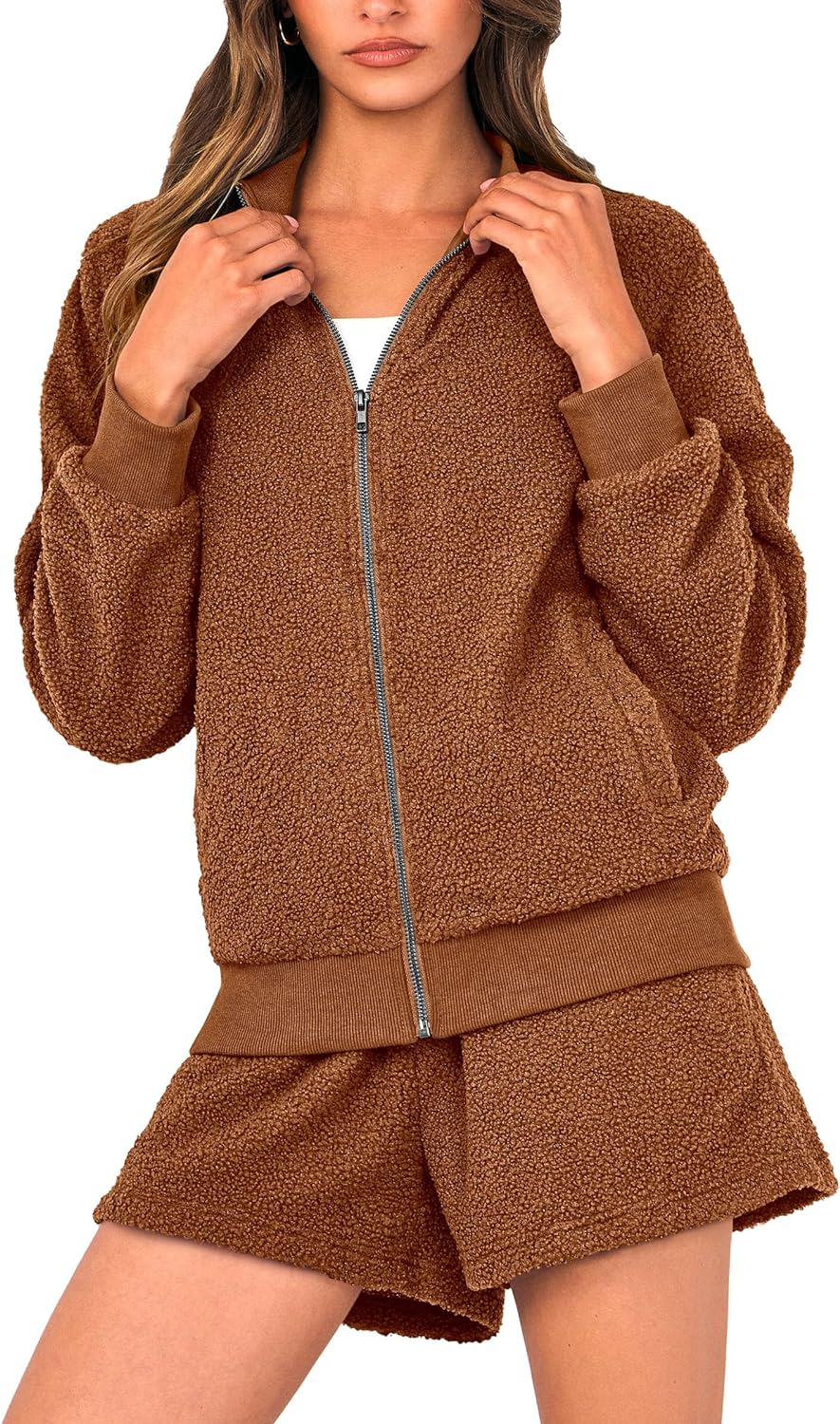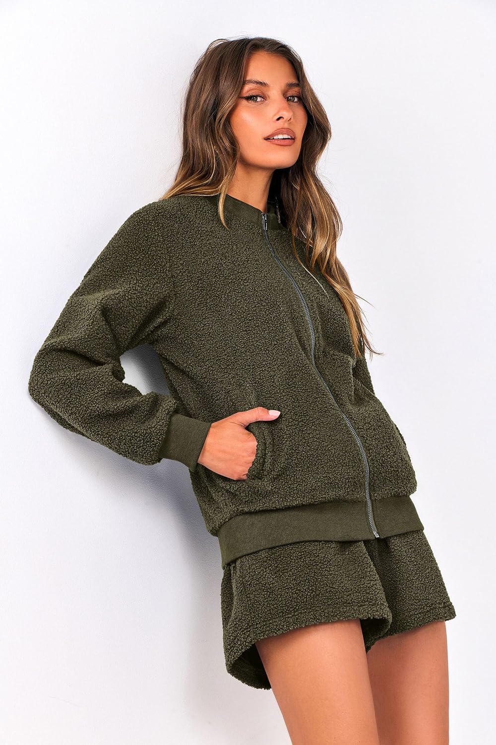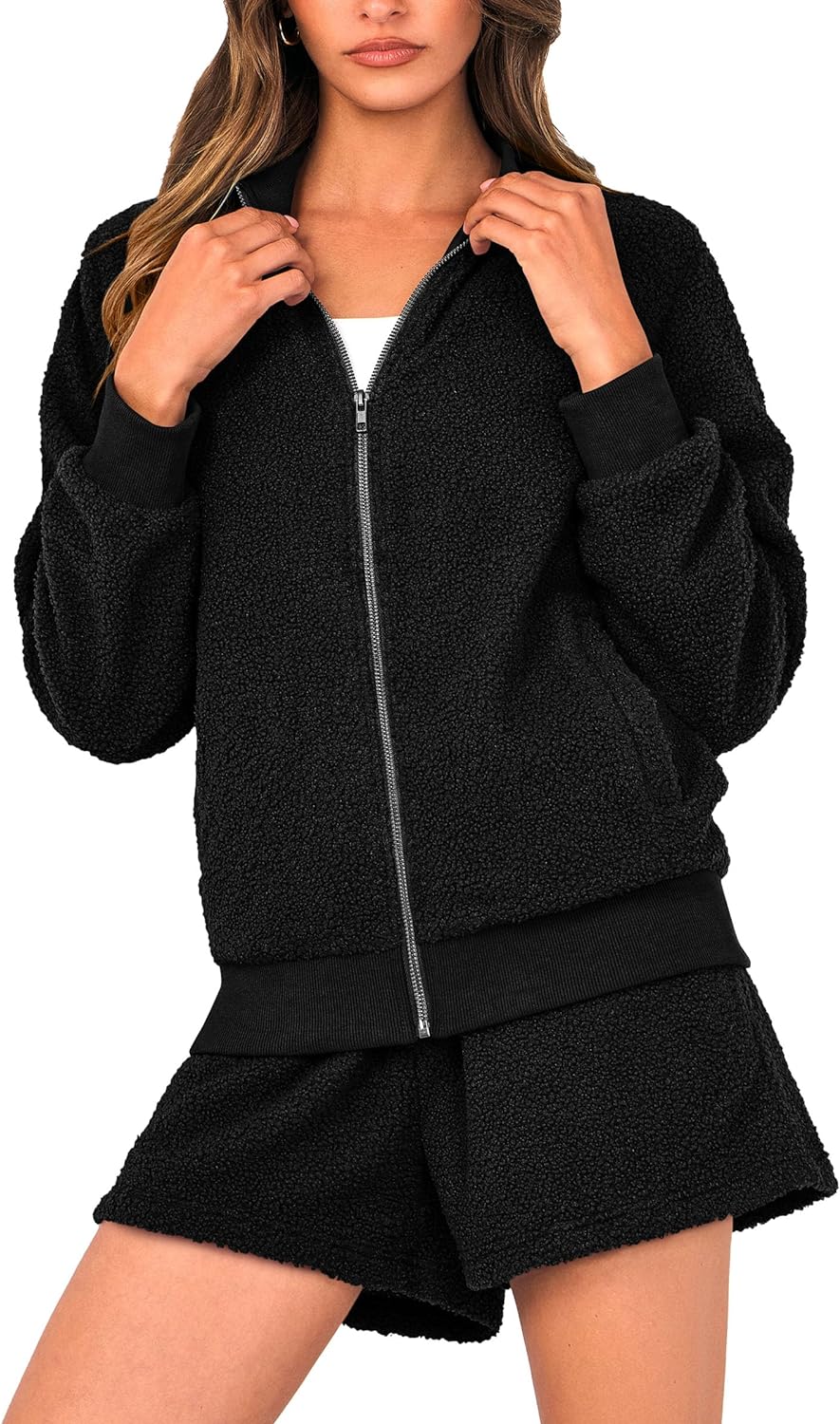 PRETTYGARDEN 2 Piece Outfits For Women Fleece Zip Up Jackets And Mini Shorts Sets