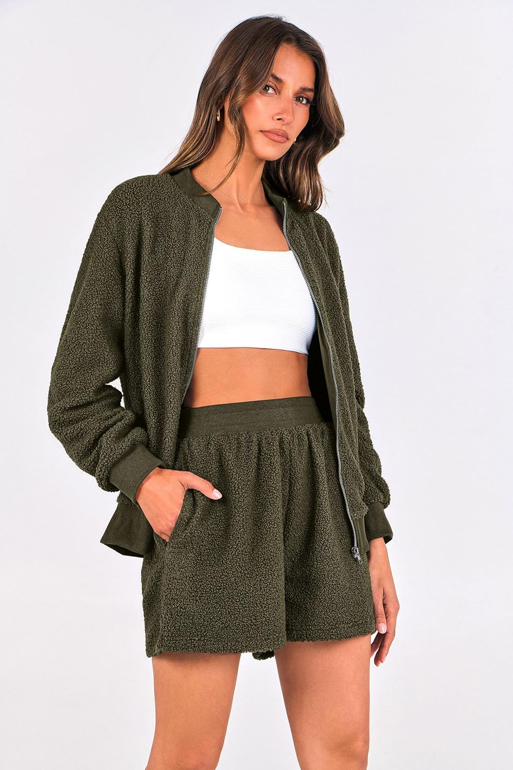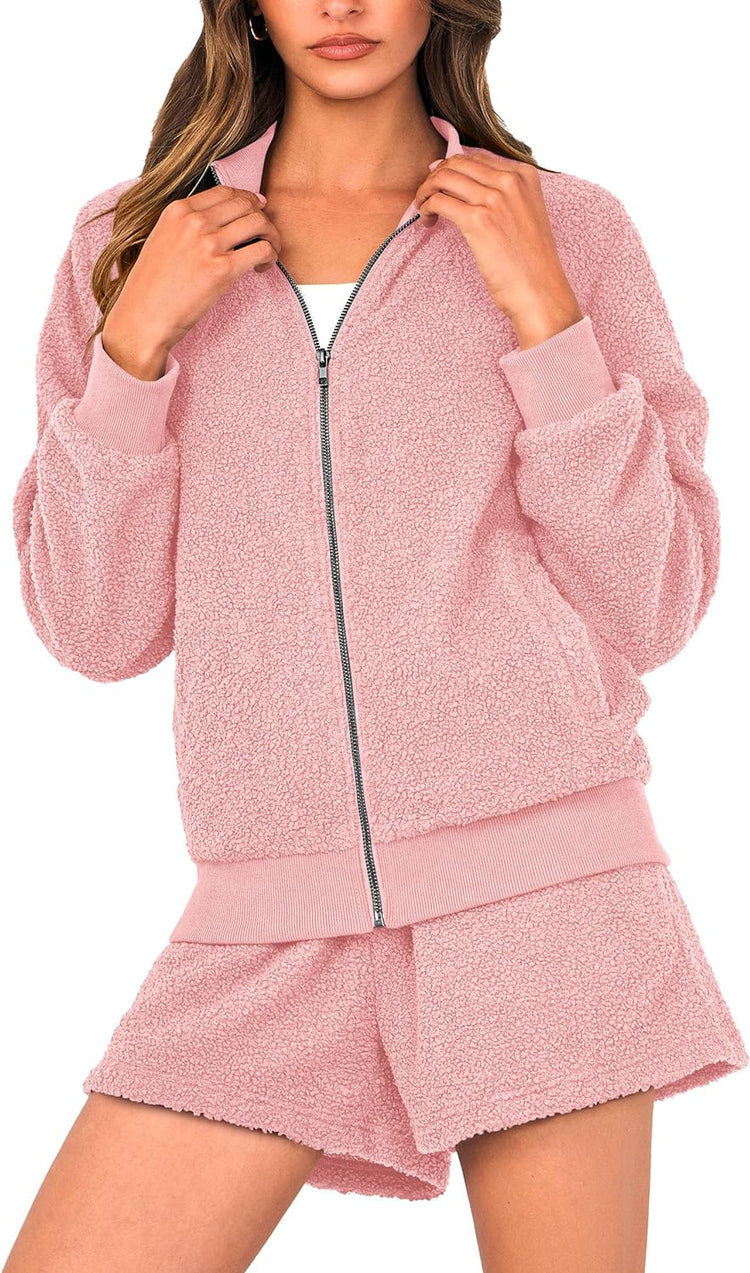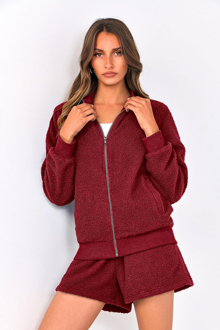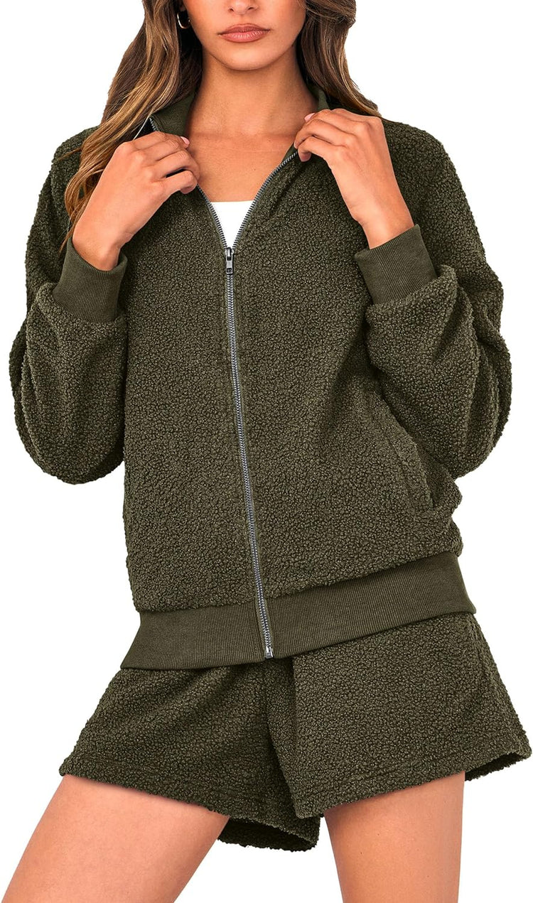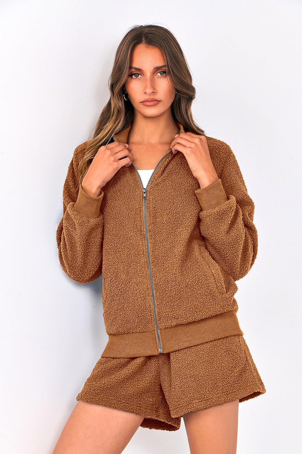 PRETTYGARDEN 2 Piece Outfits For Women Fleece Zip Up Jackets And Mini Shorts Sets