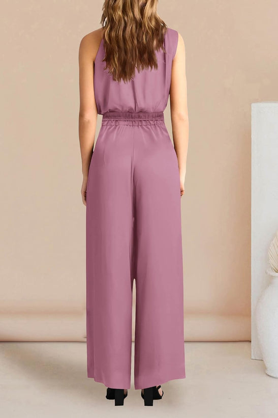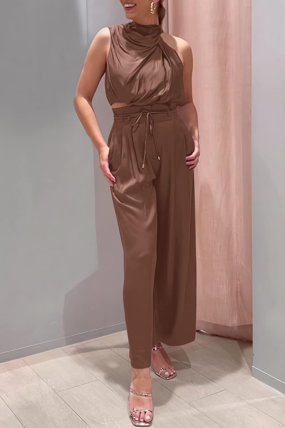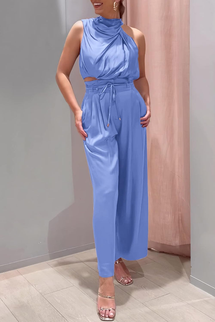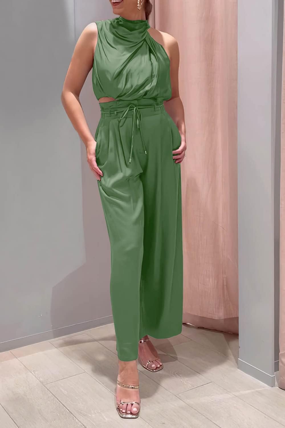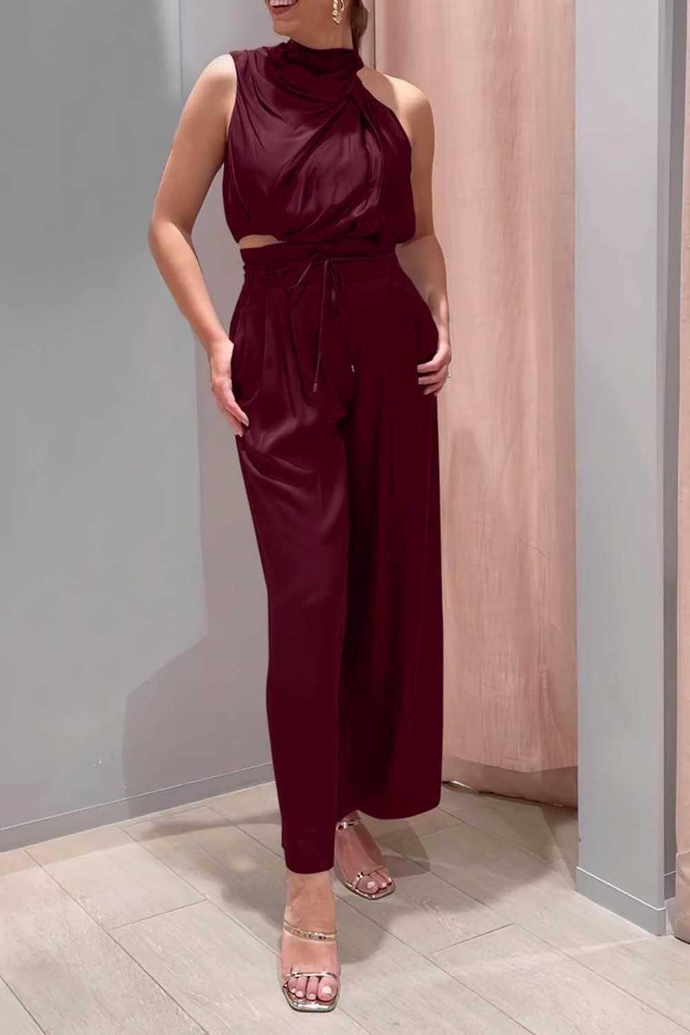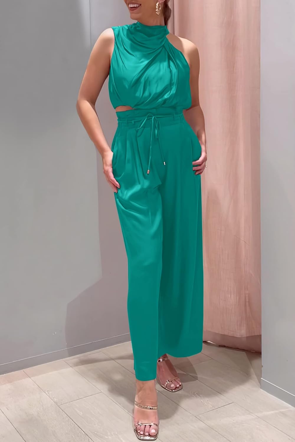 Fabric Type: 100%PolyesterFashion Style: Mock Neck/Sleeveless/Wide Leg/Elastic Waist/Side Pockets/Keyhole/Belt
