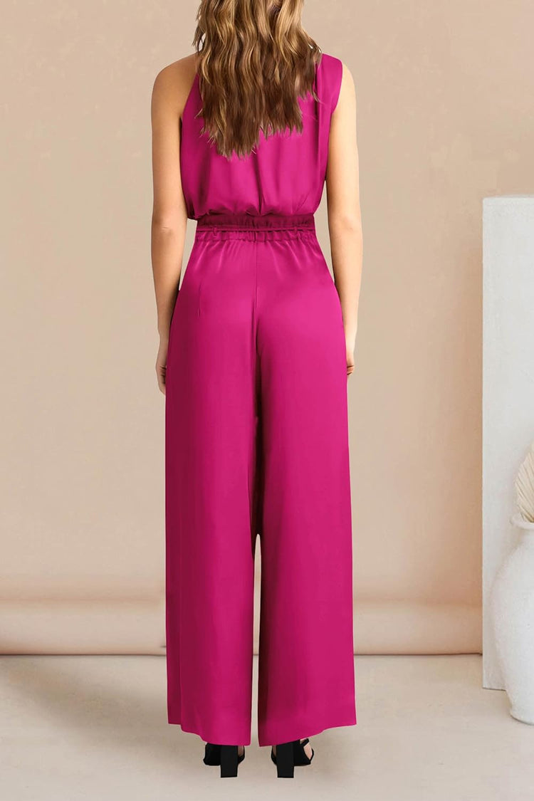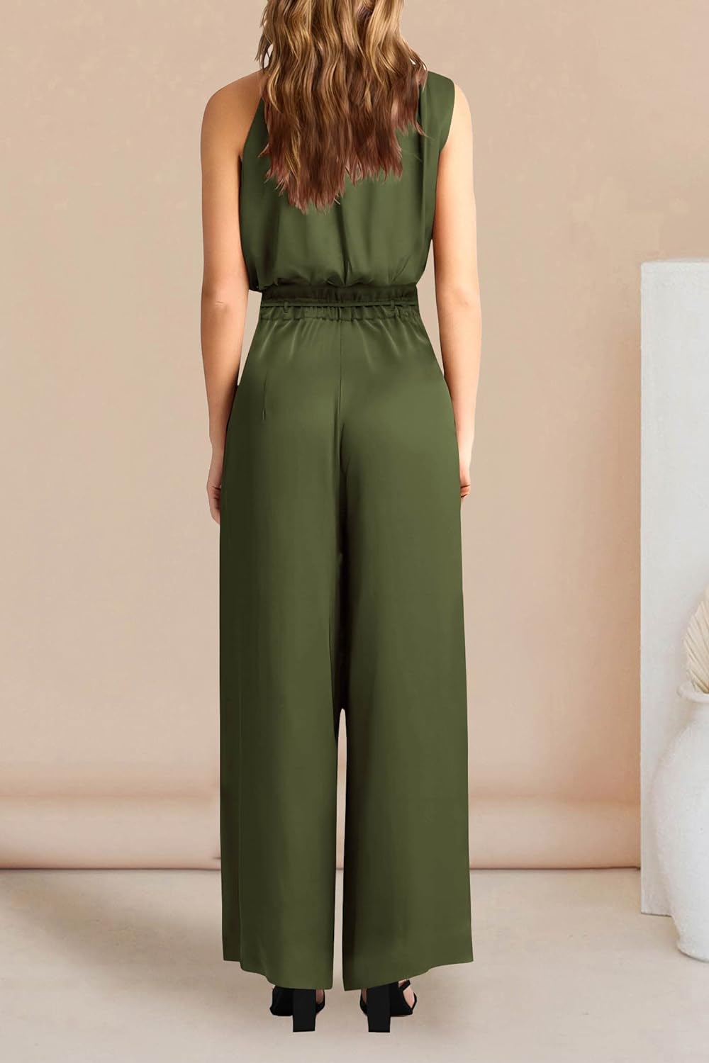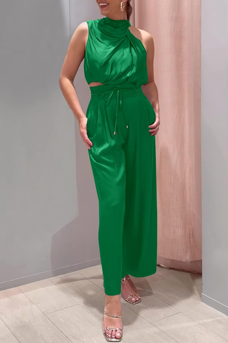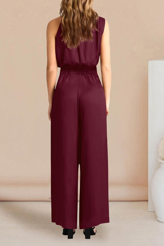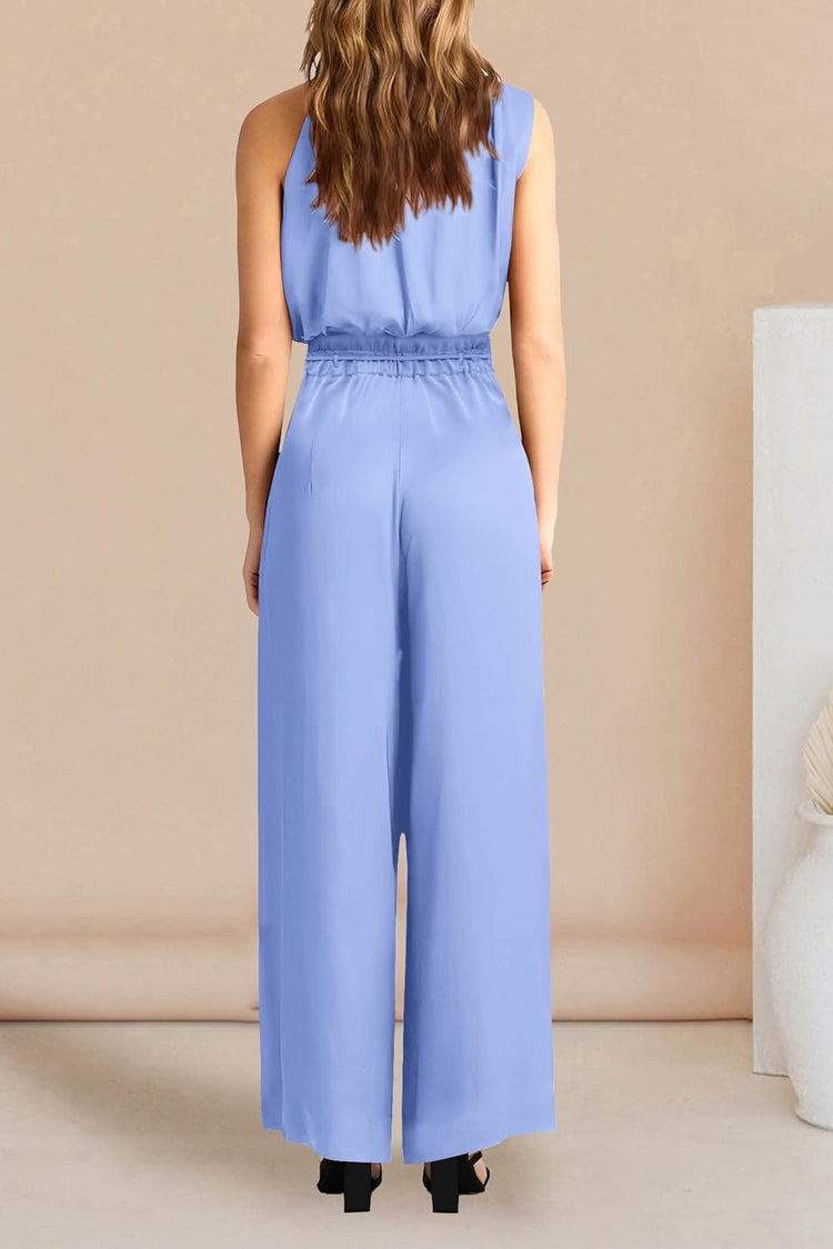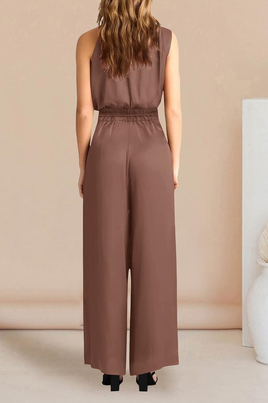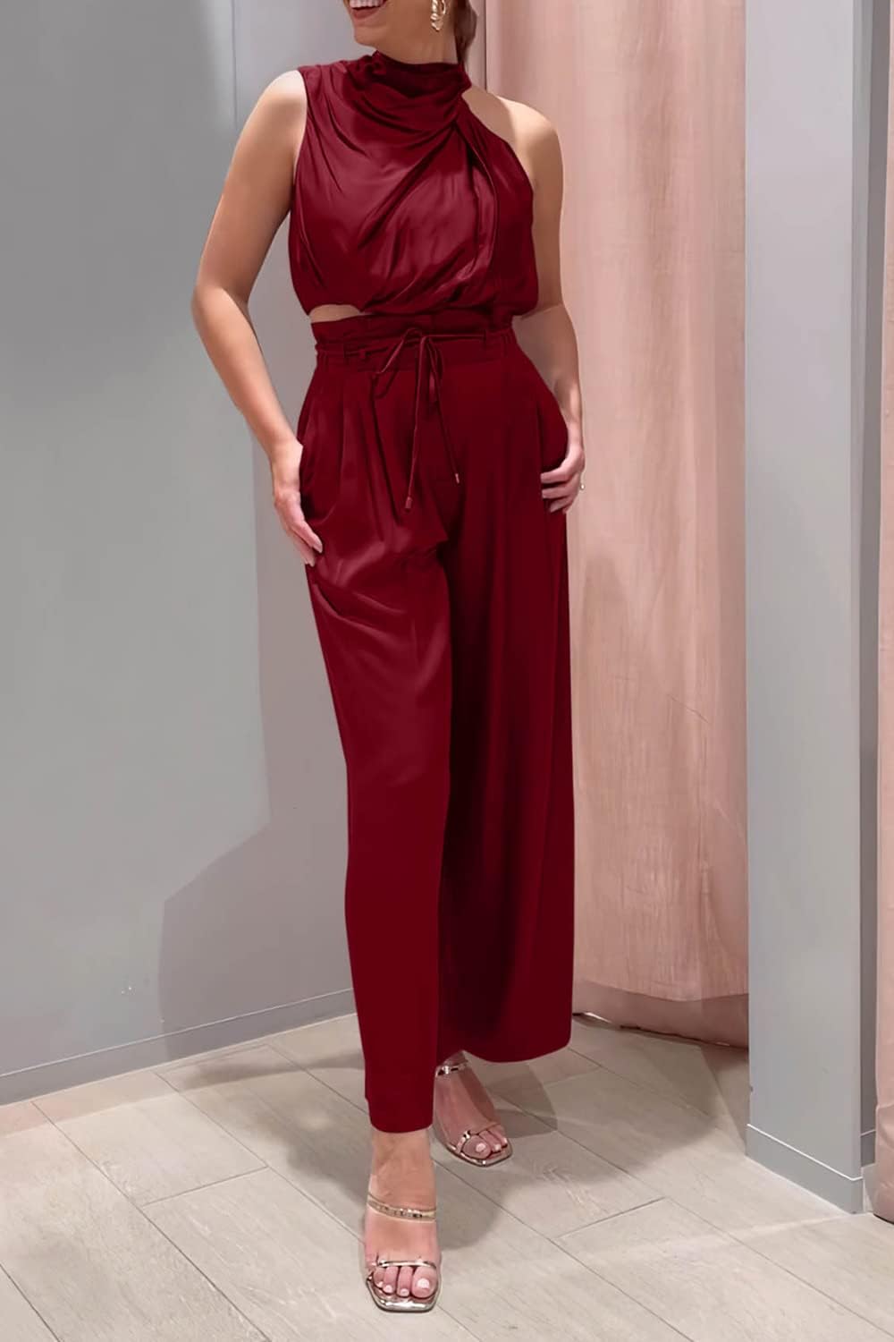 Fabric Type: 100%PolyesterFashion Style: Mock Neck/Sleeveless/Wide Leg/Elastic Waist/Side Pockets/Keyhole/Belt