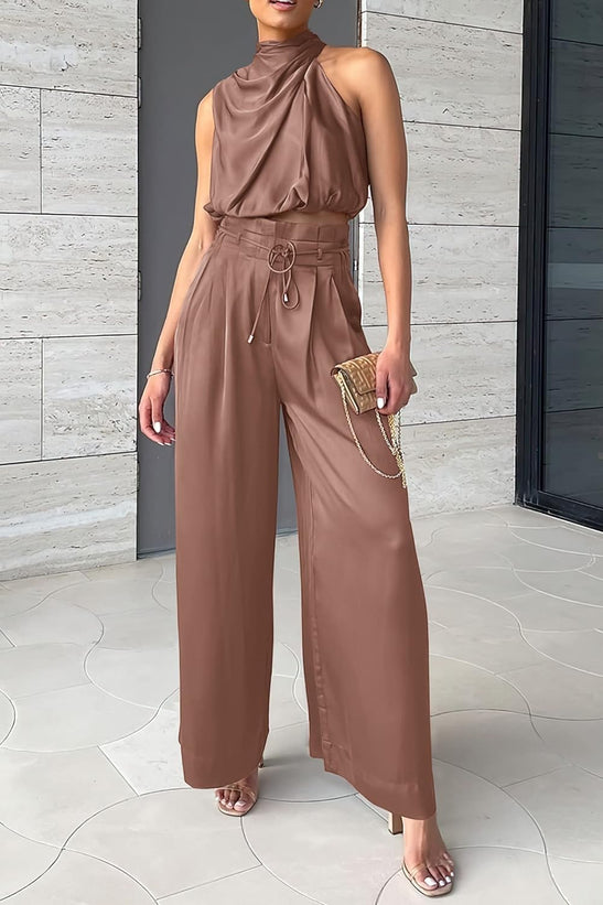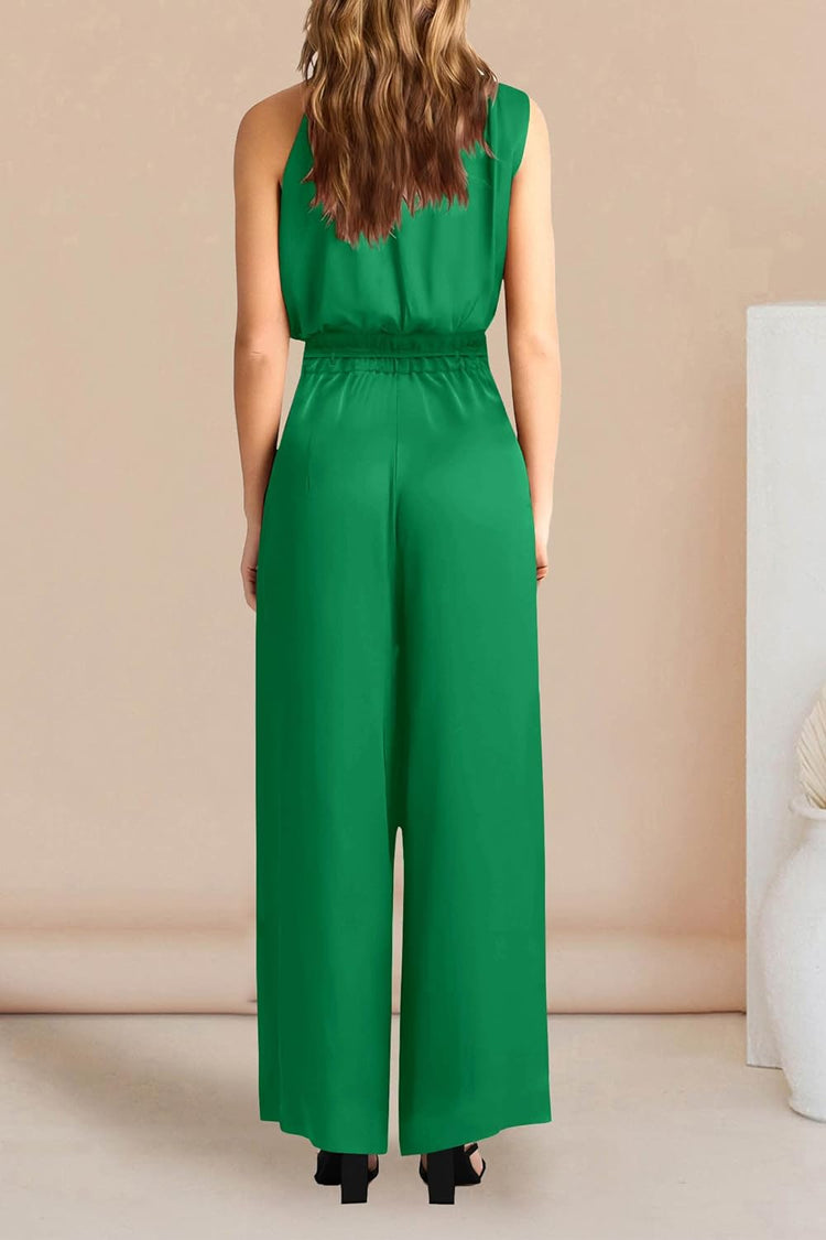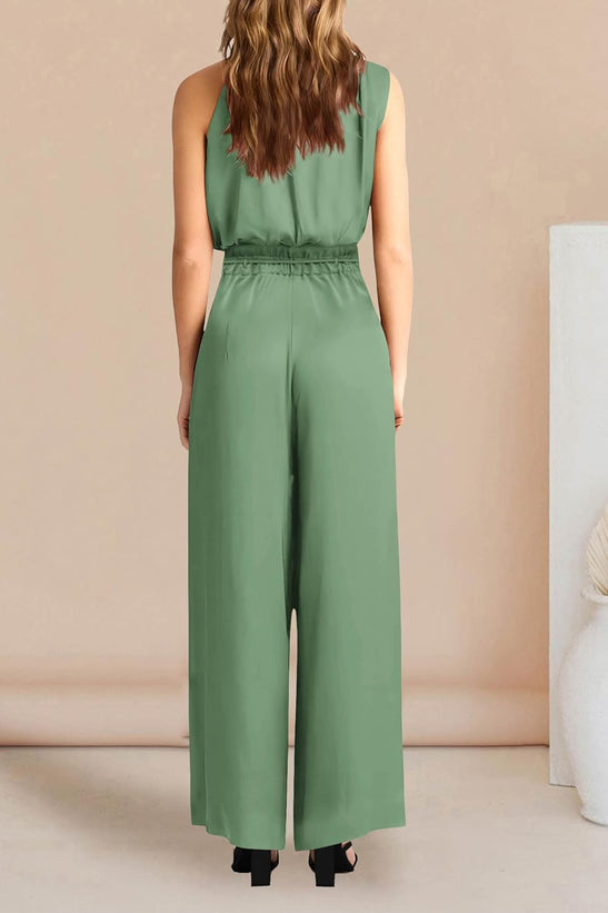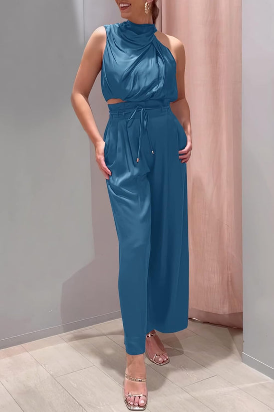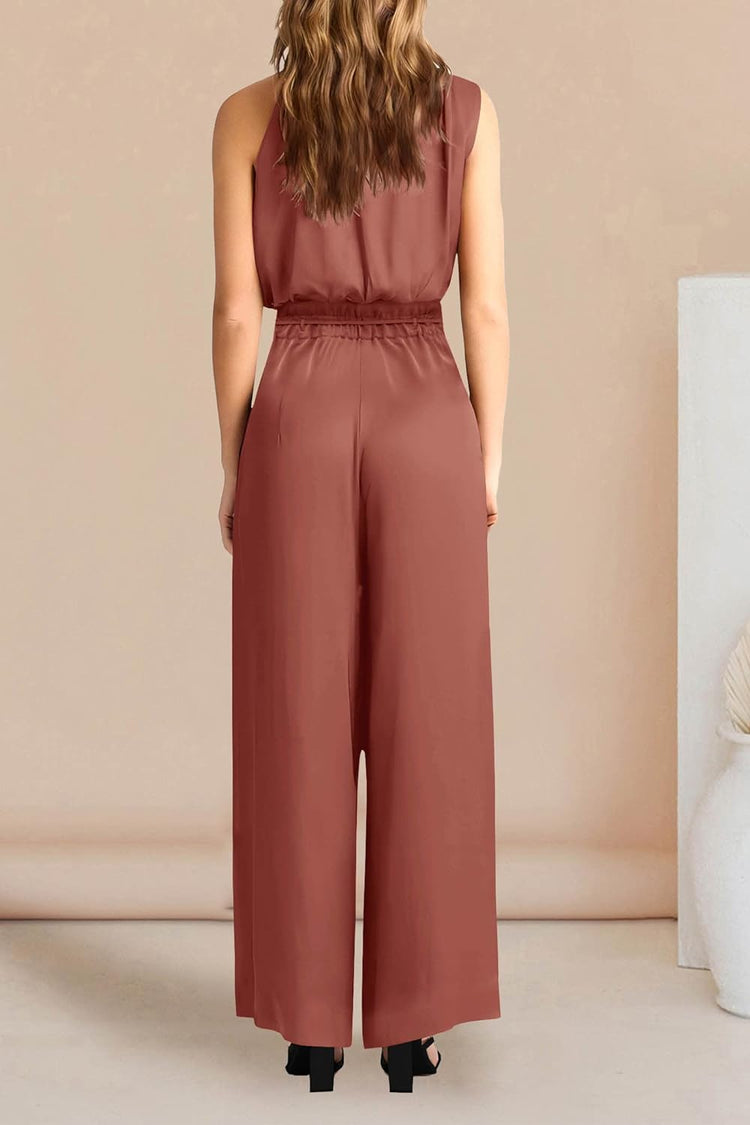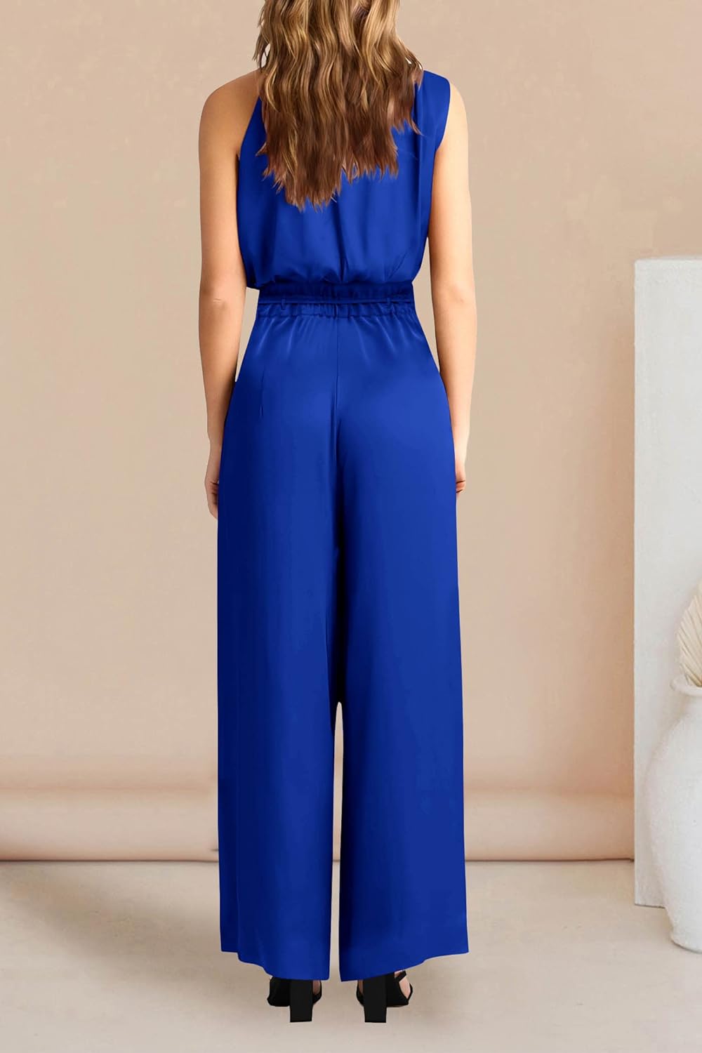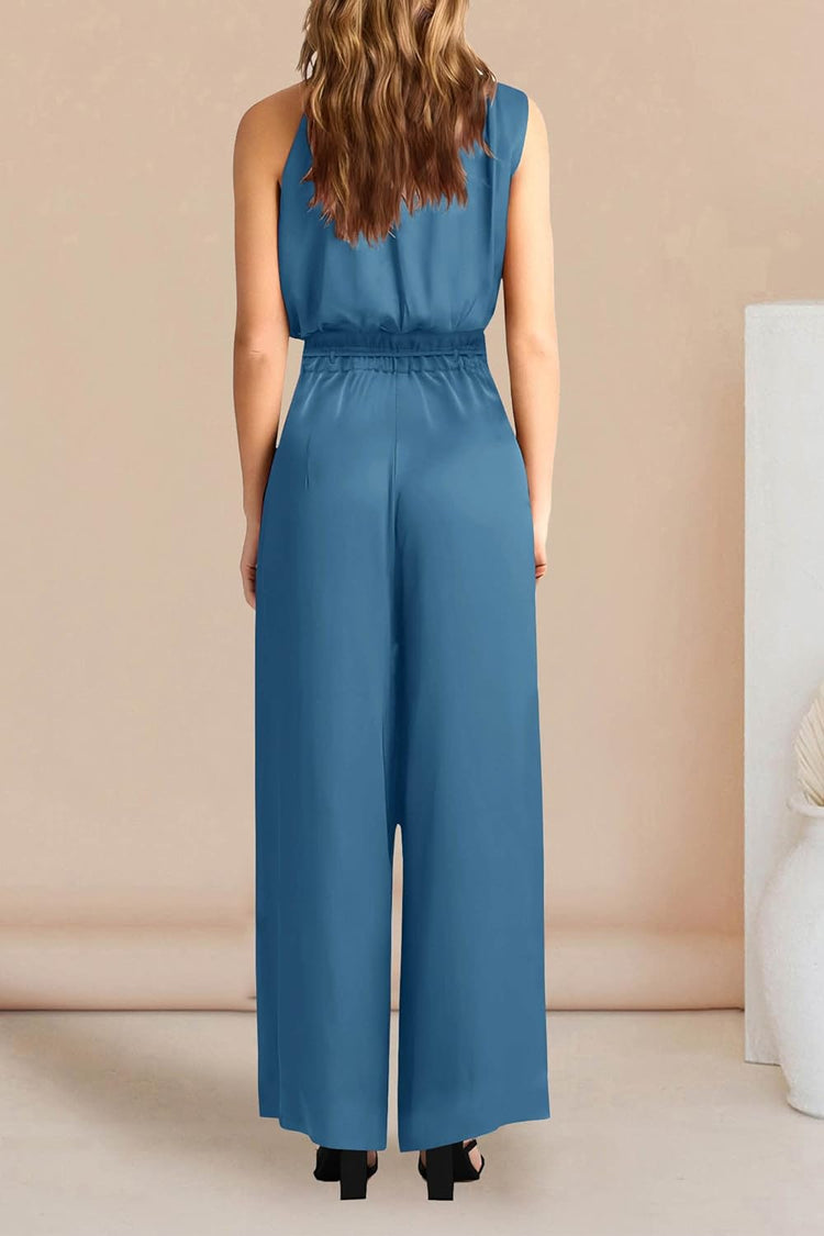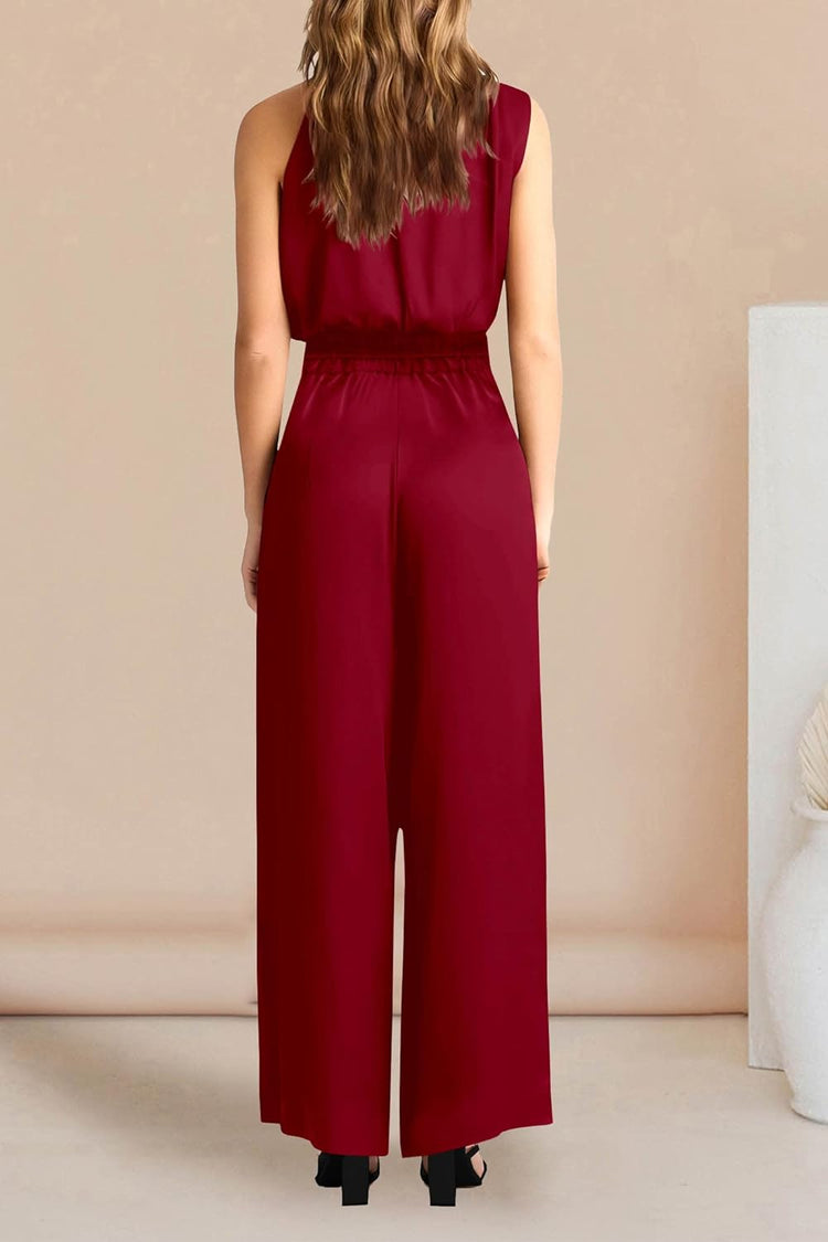 Fabric Type: 100%PolyesterFashion Style: Mock Neck/Sleeveless/Wide Leg/Elastic Waist/Side Pockets/Keyhole/Belt