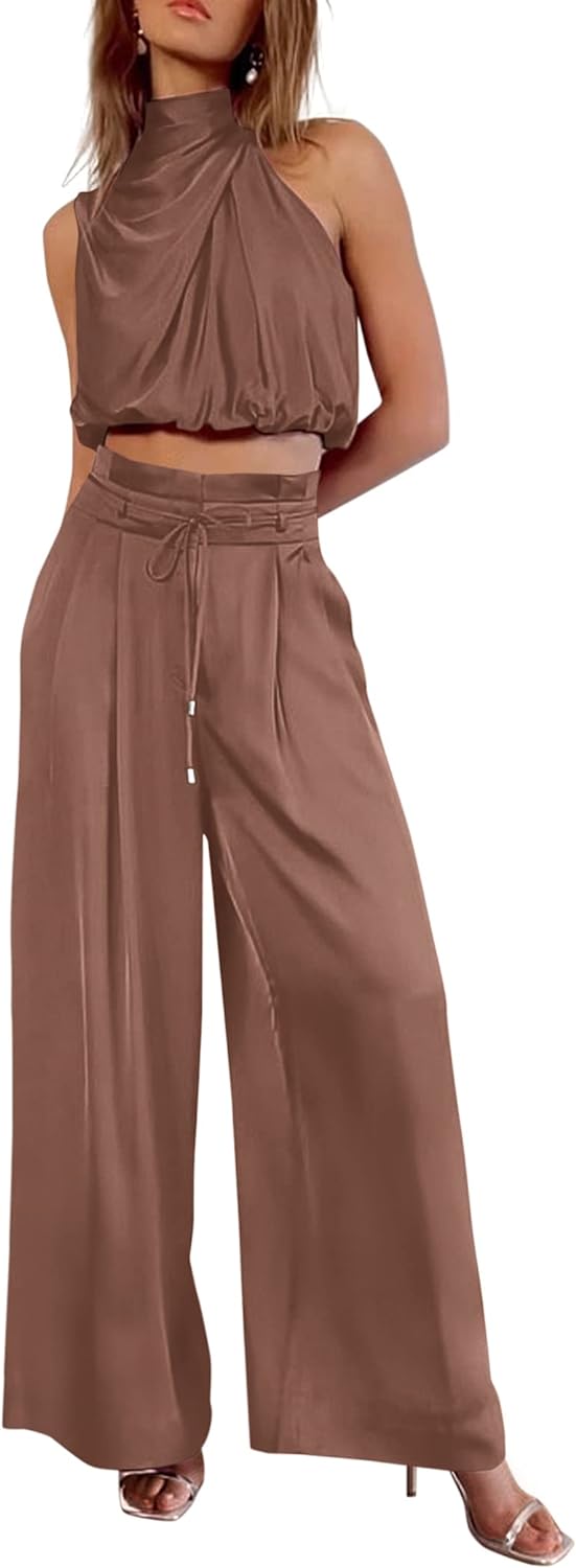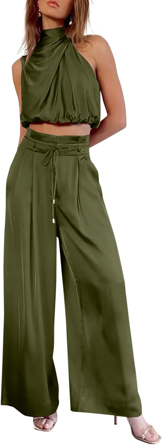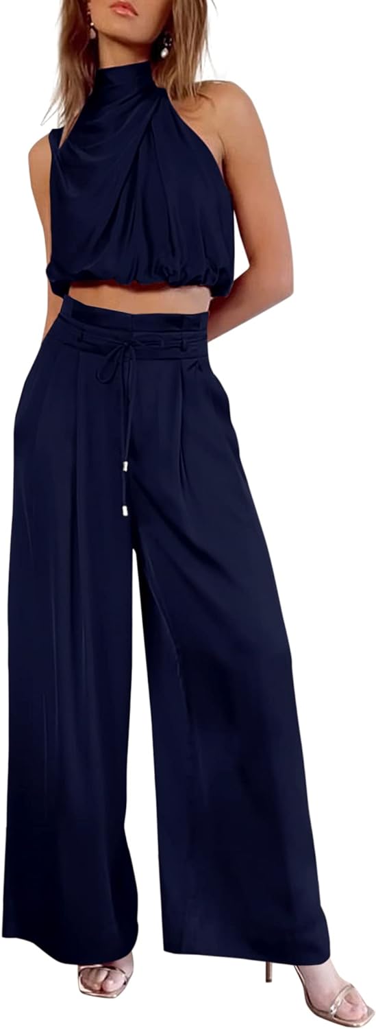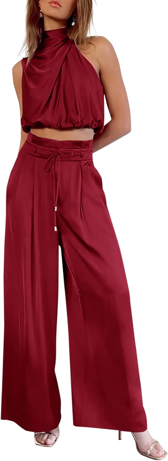 PRETTYGARDEN Women Two Piece Outfits Sleeveless Crop Top And Palazzo Pants Set
