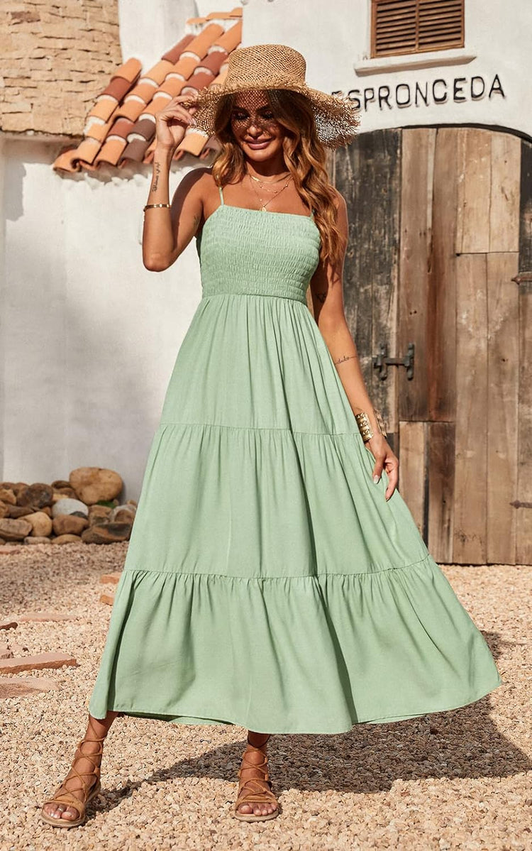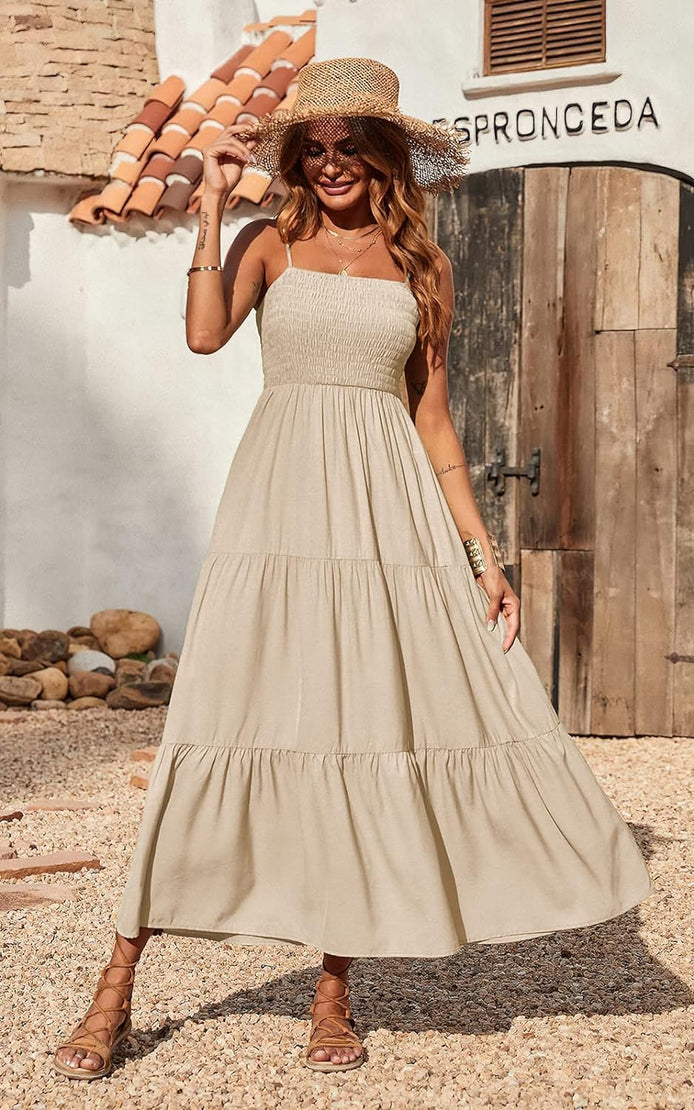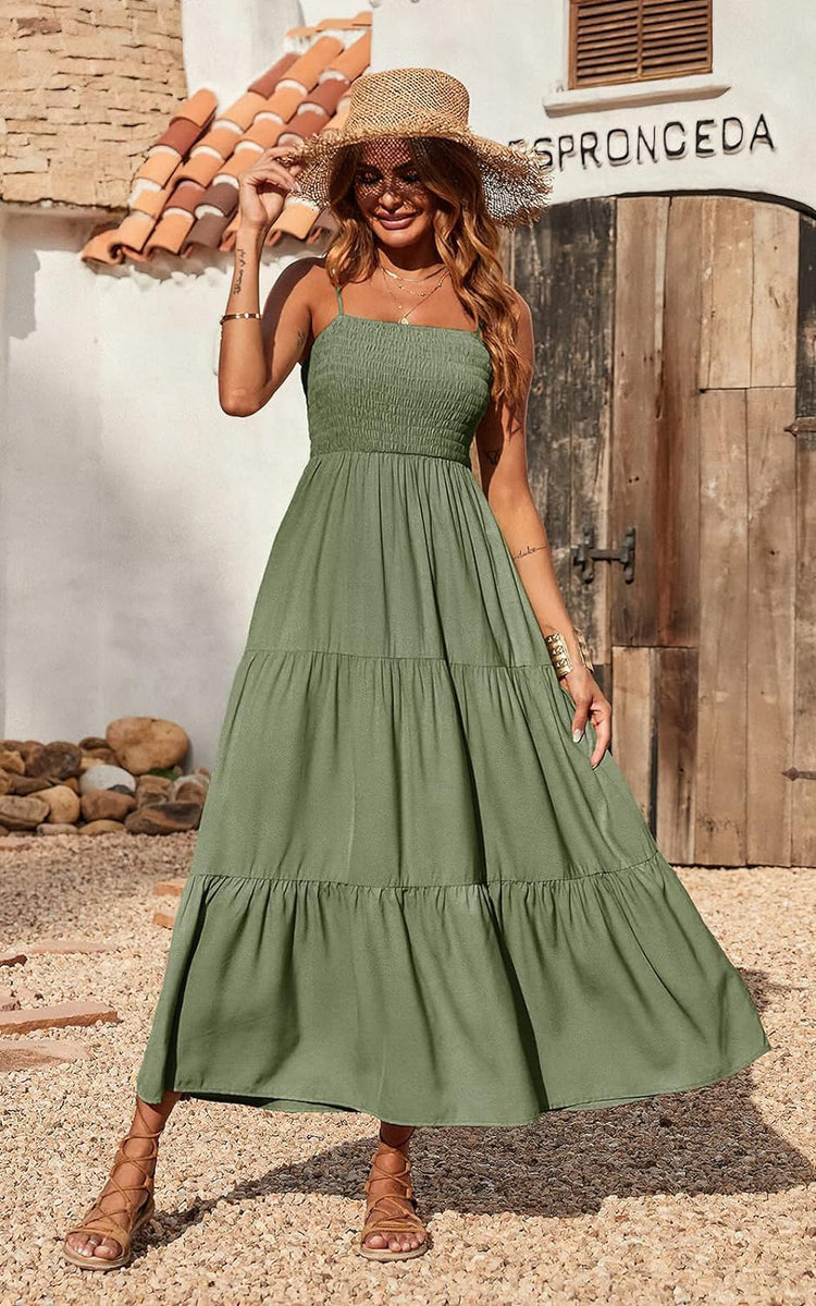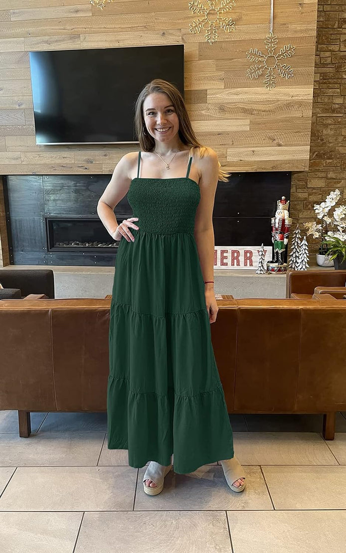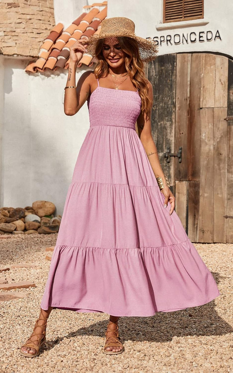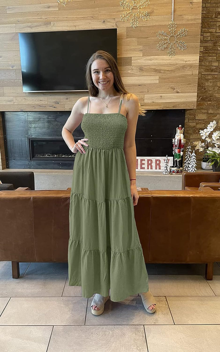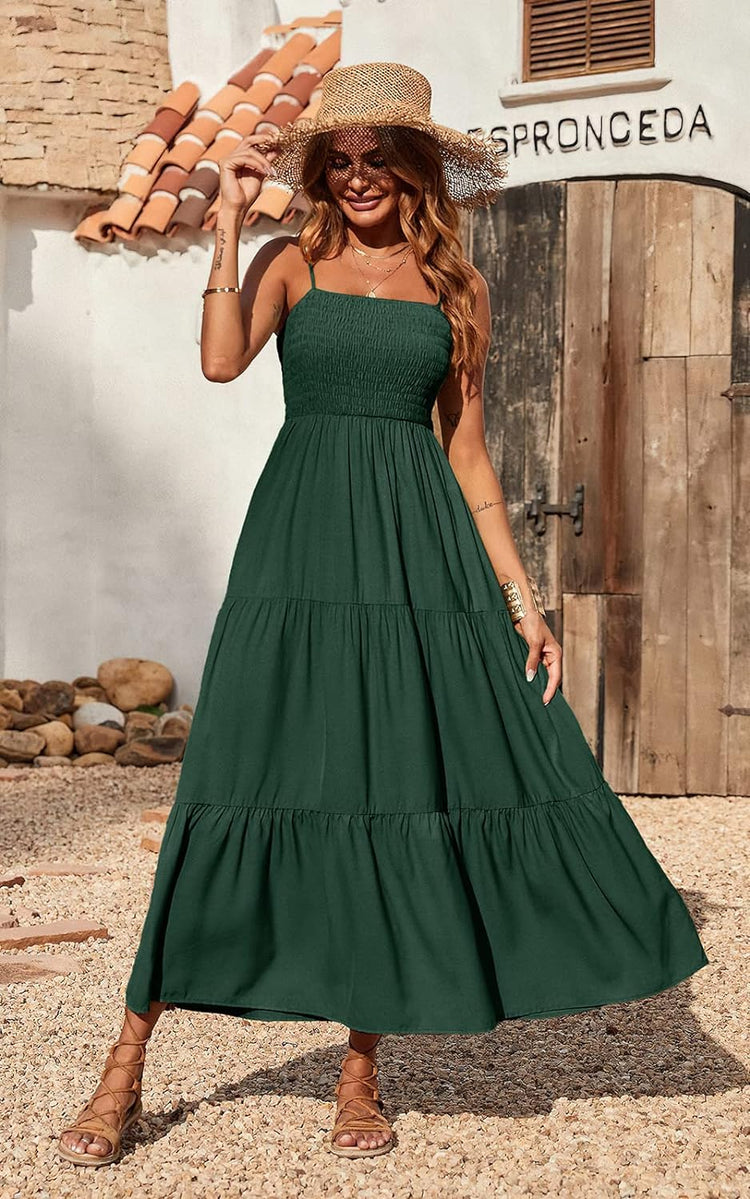PRETTYGARDEN Women's Summer Maxi Dress Casual Boho Sleeveless Spaghetti Strap Smocked Tiered Long Beach Sun Dresses