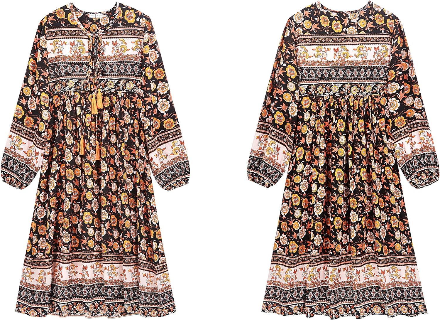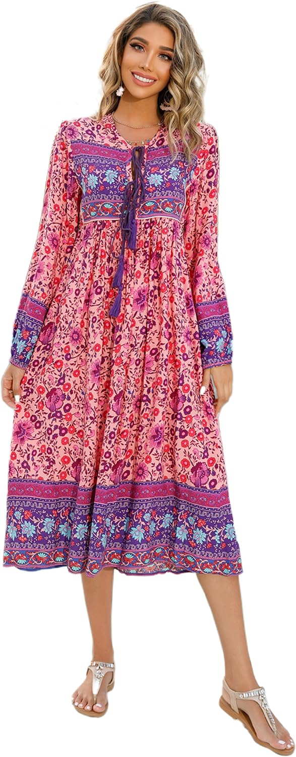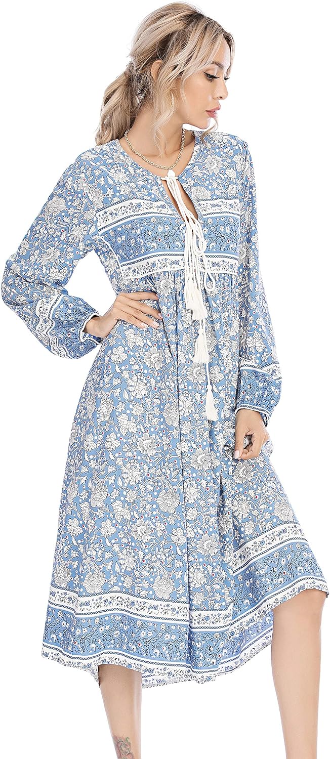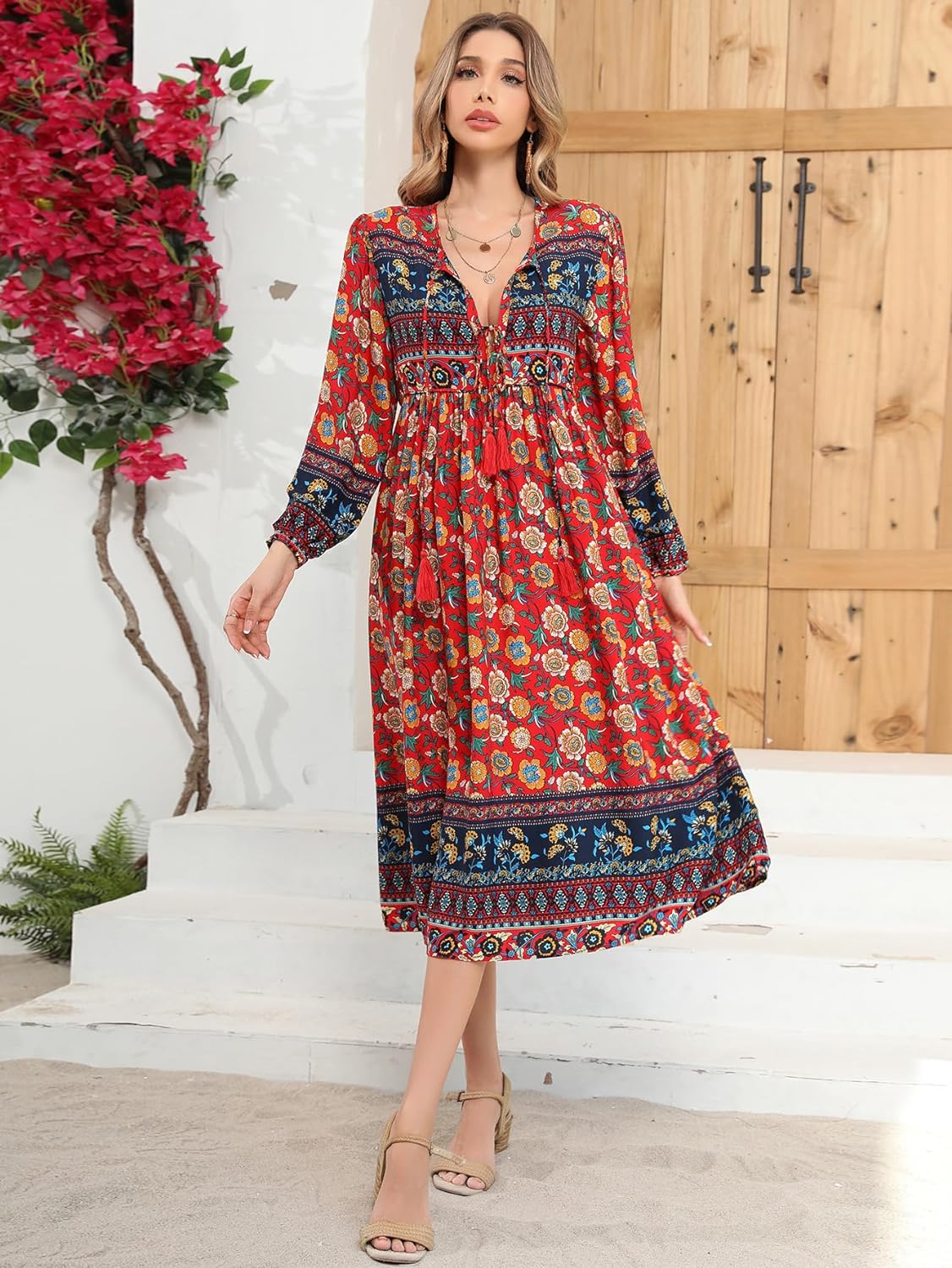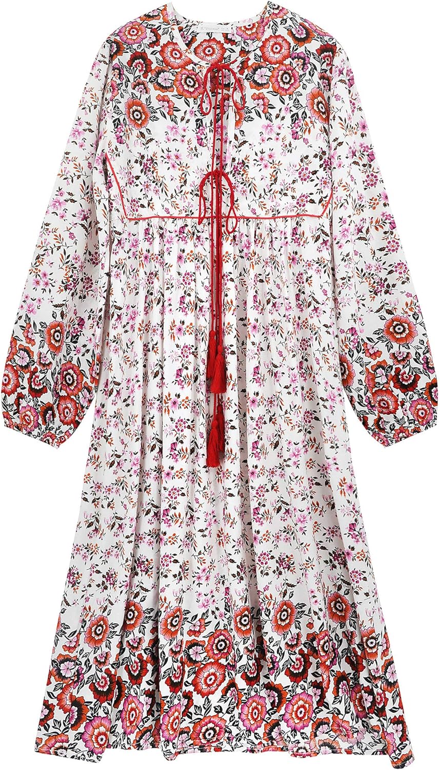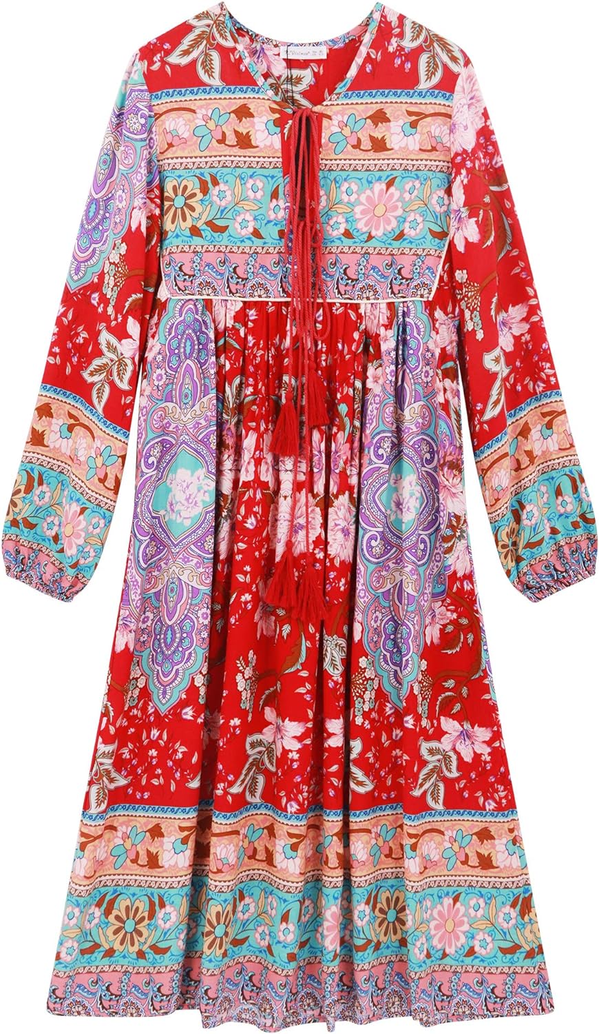R.Vivimos Women's Long Sleeve Floral Print Retro V Neck Tassel Bohemian Midi Dresses