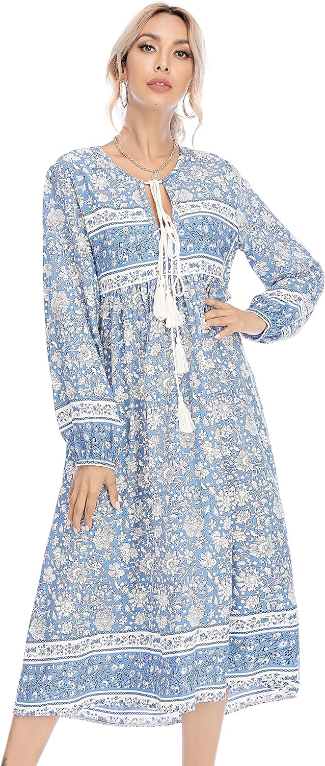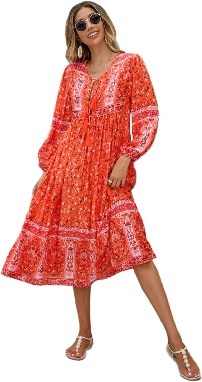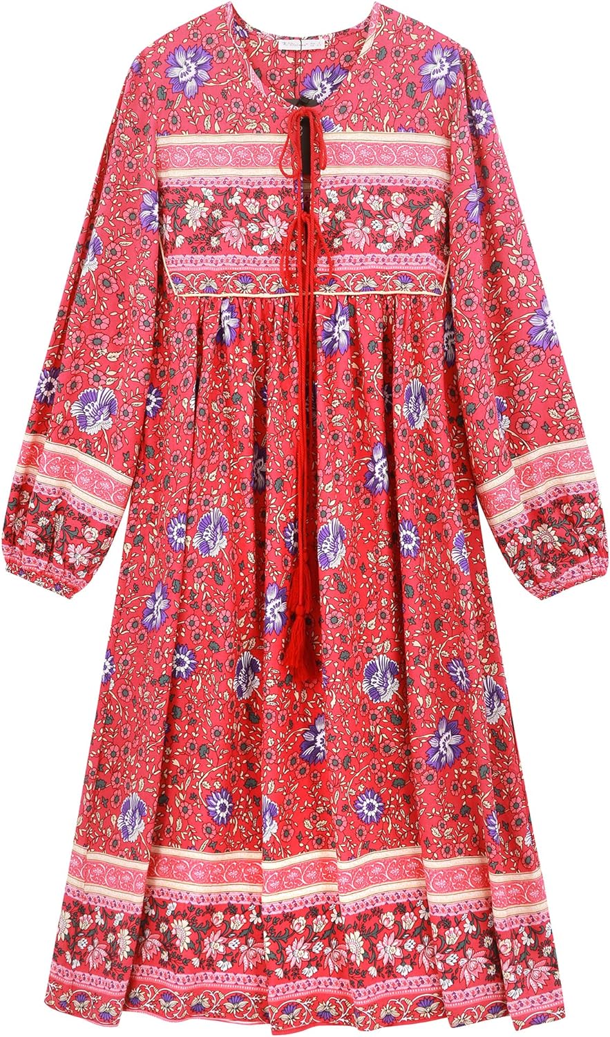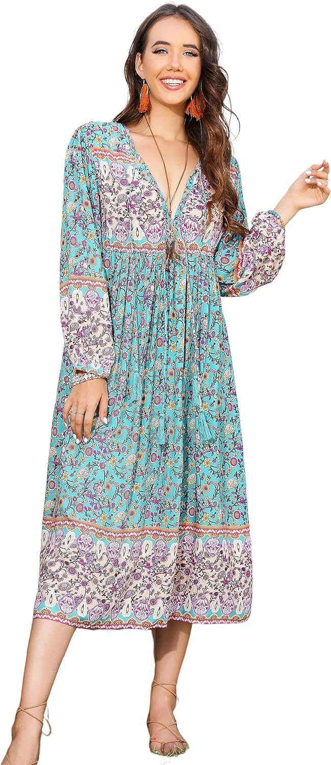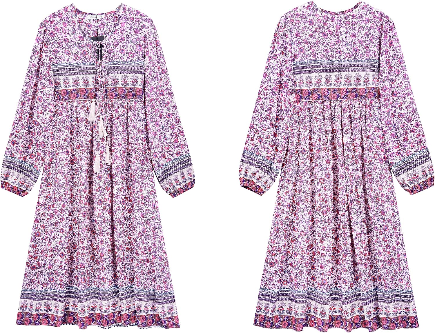 R.Vivimos Women's Long Sleeve Floral Print Retro V Neck Tassel Bohemian Midi Dresses