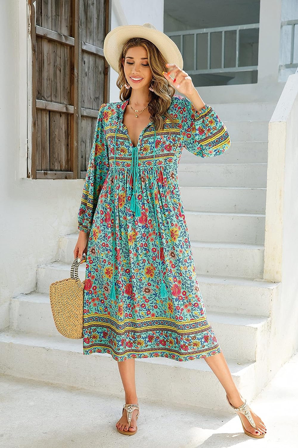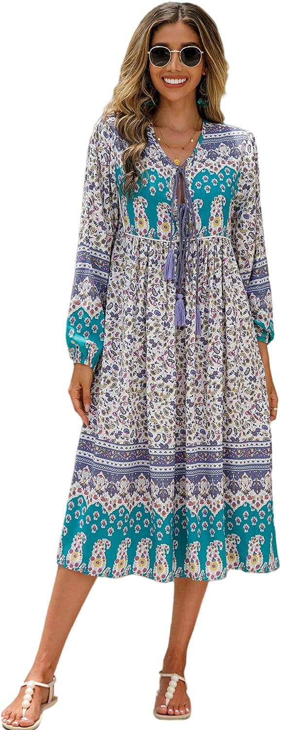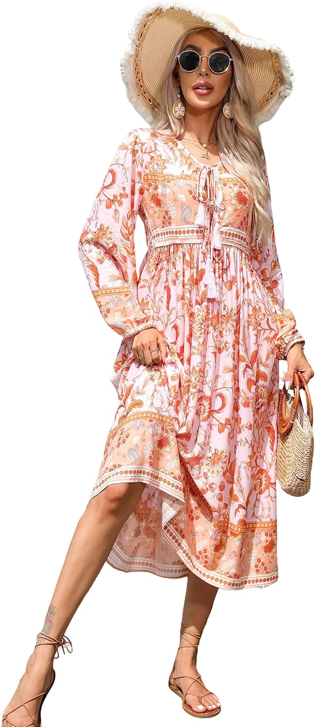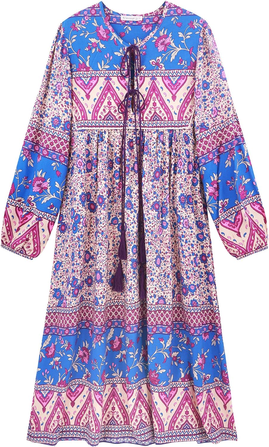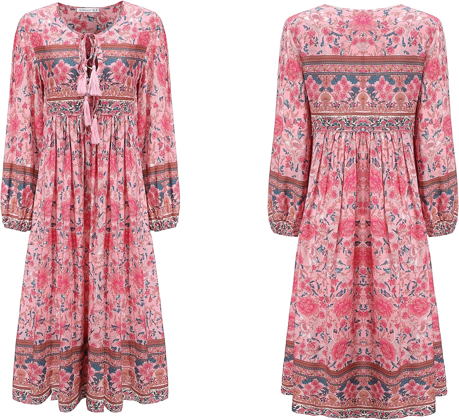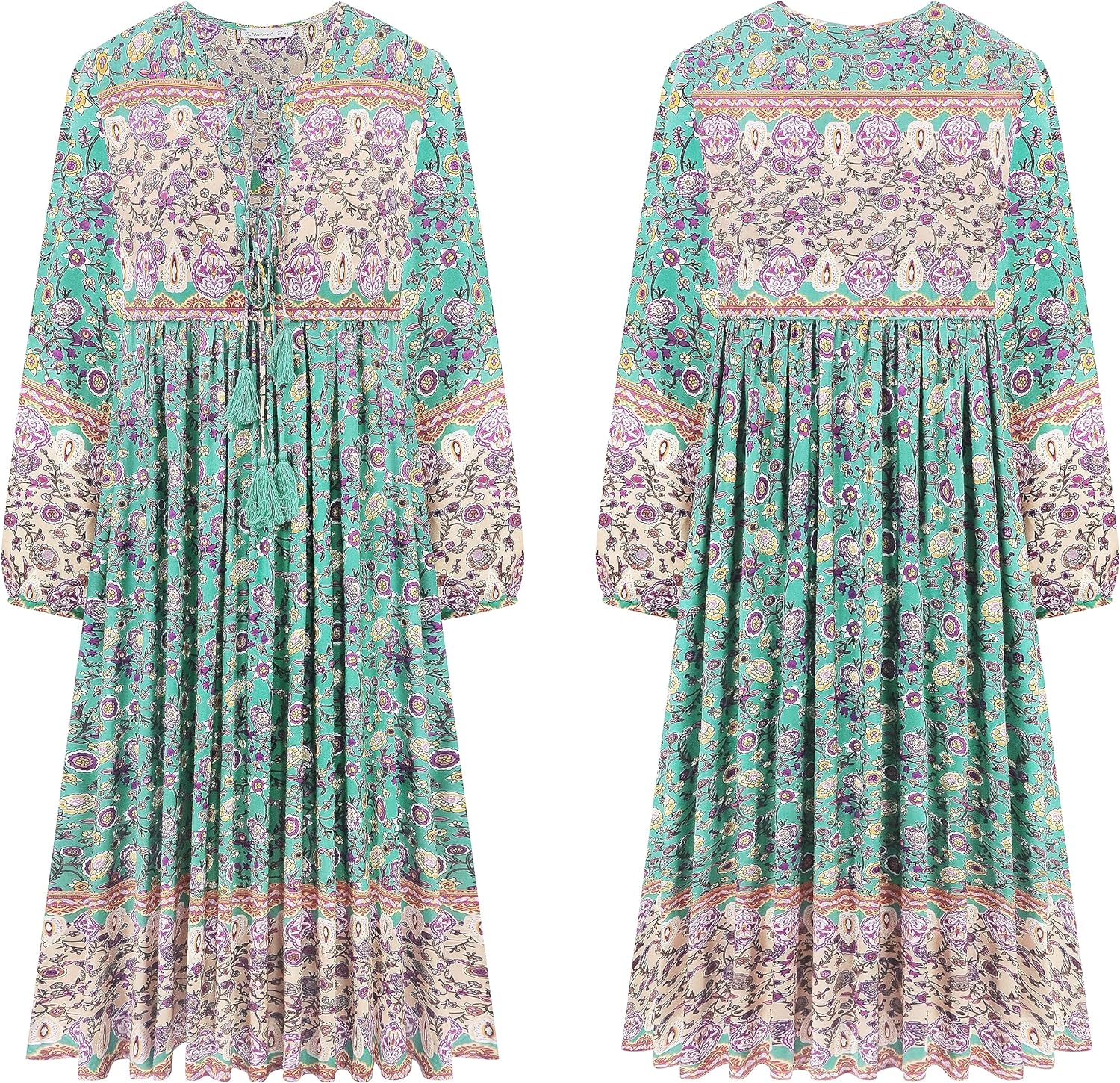 R.Vivimos Women's Long Sleeve Floral Print Retro V Neck Tassel Bohemian Midi Dresses