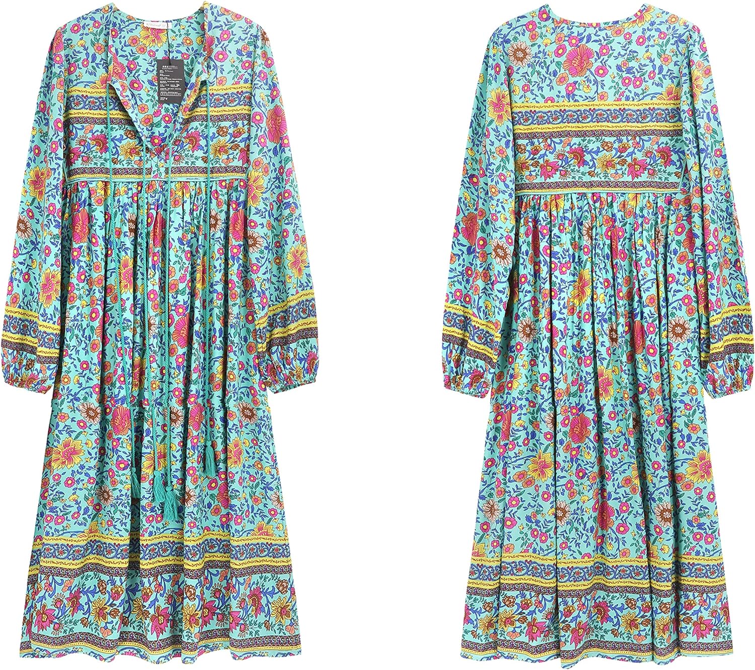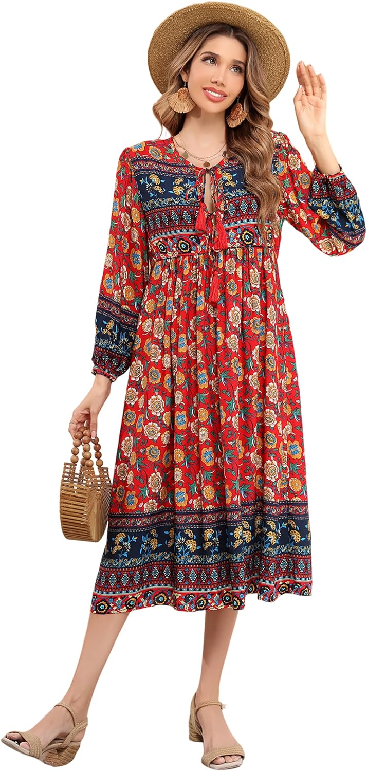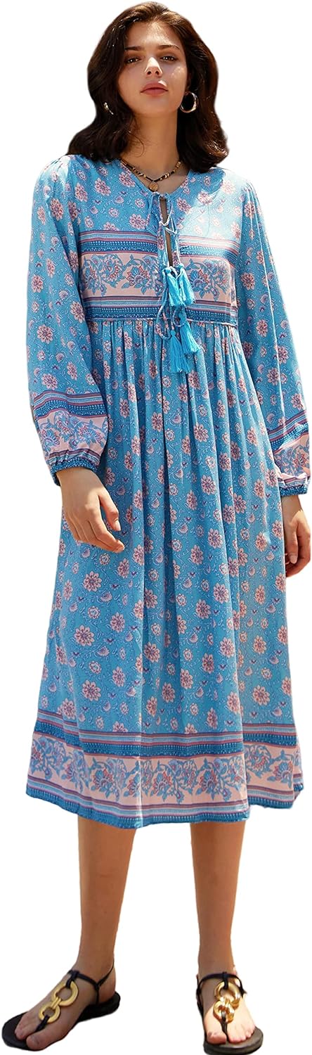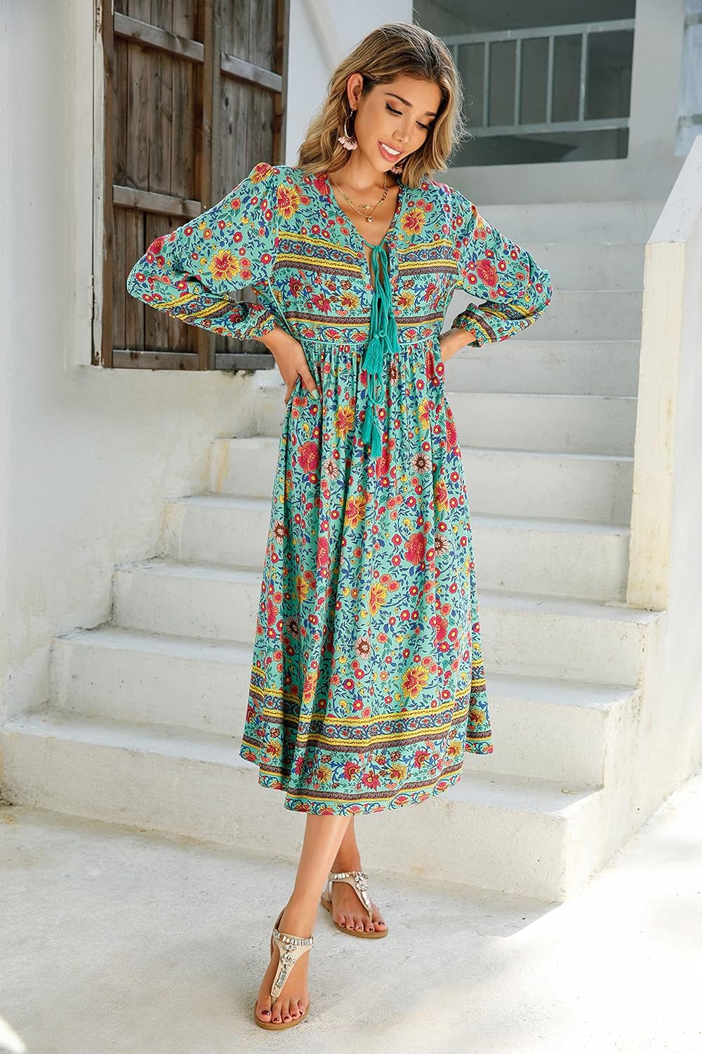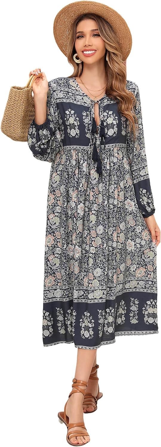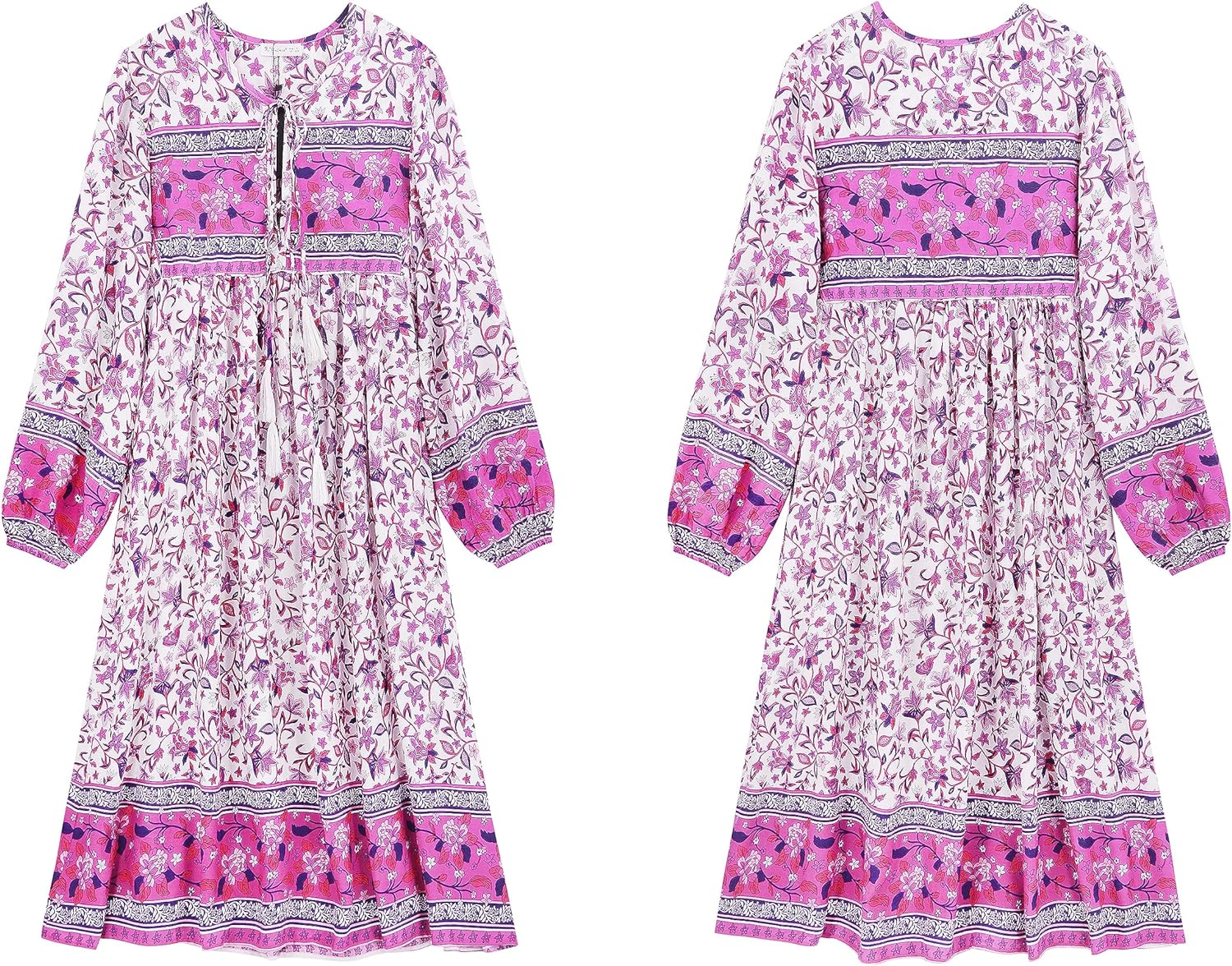 R.Vivimos Women's Long Sleeve Floral Print Retro V Neck Tassel Bohemian Midi Dresses