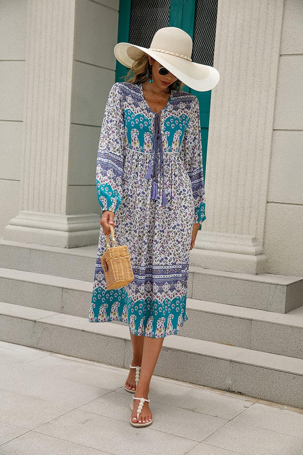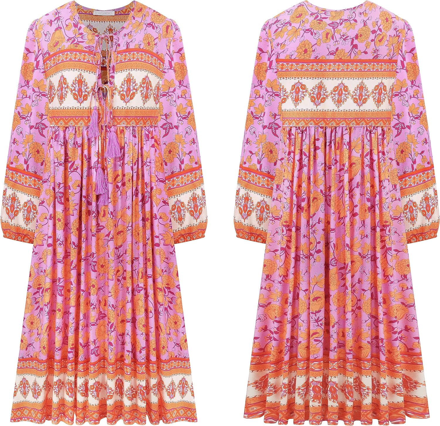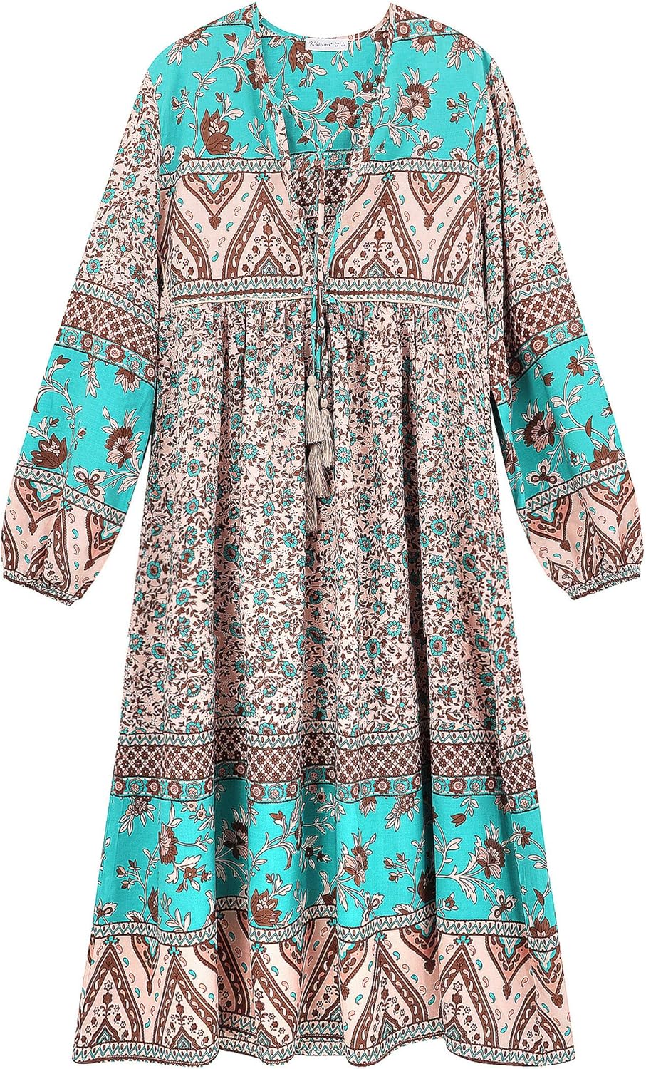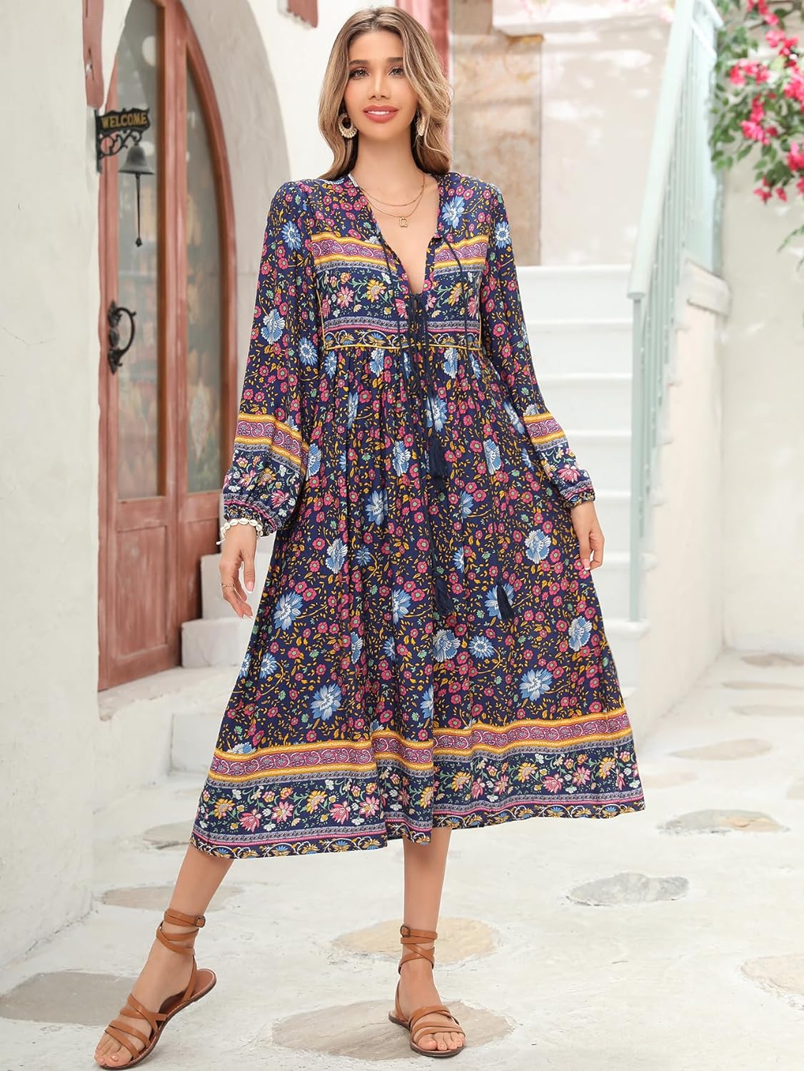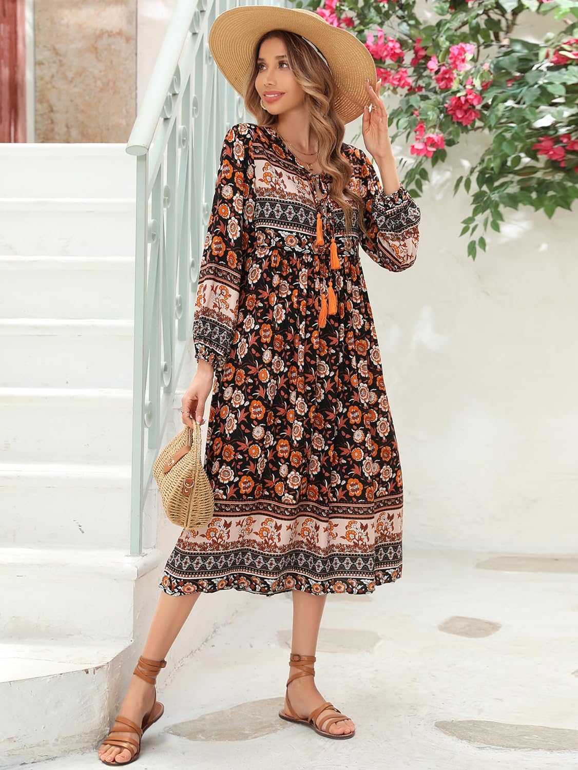 R.Vivimos Women's Long Sleeve Floral Print Retro V Neck Tassel Bohemian Midi Dresses