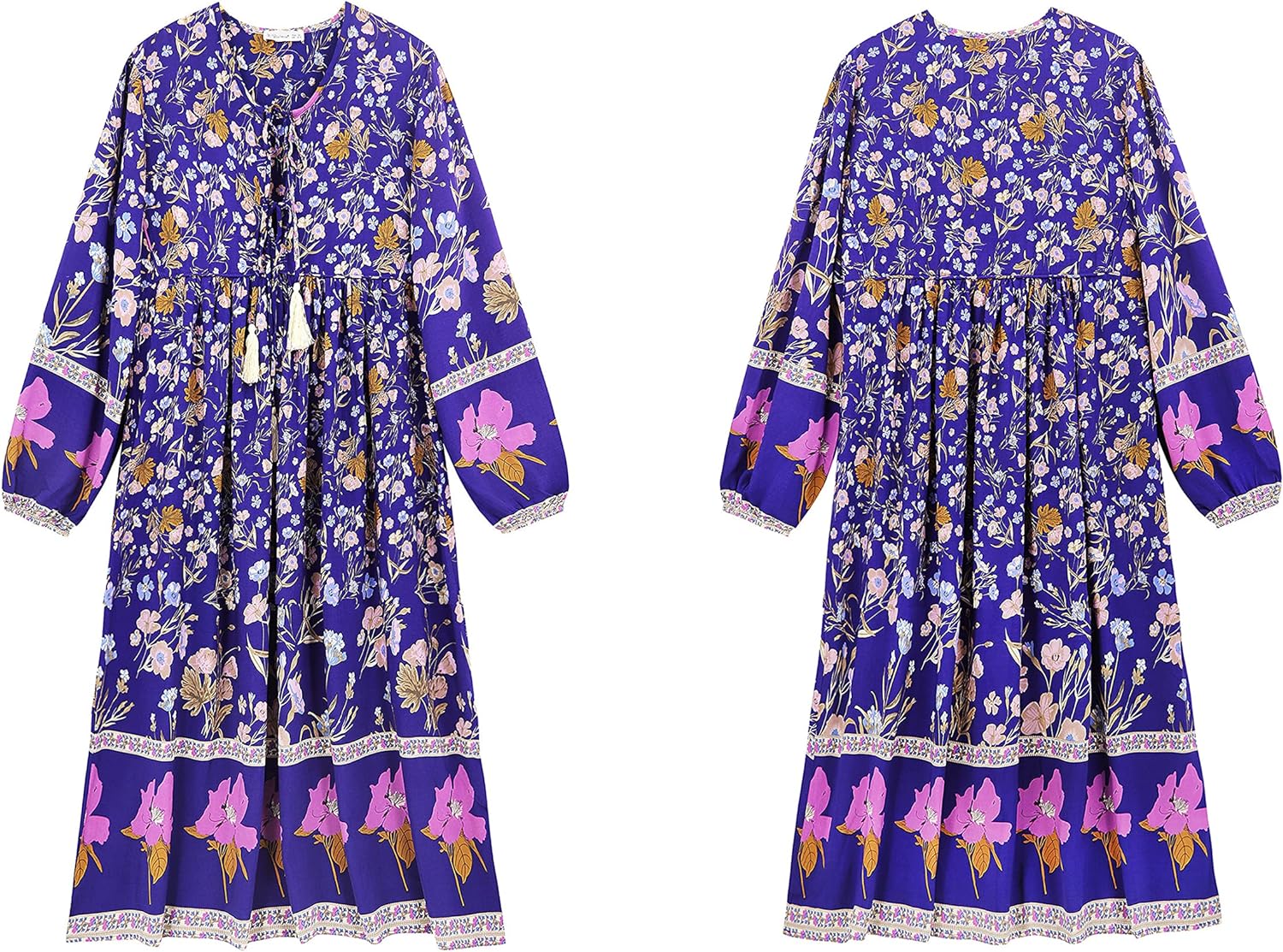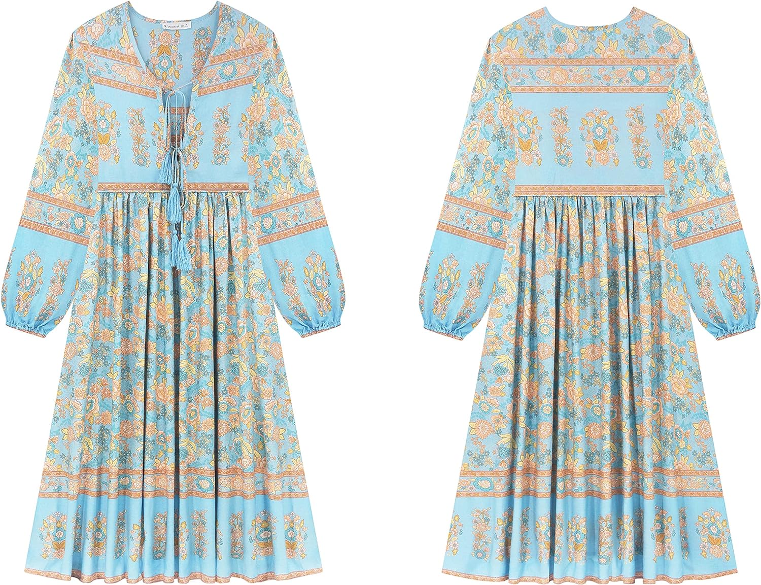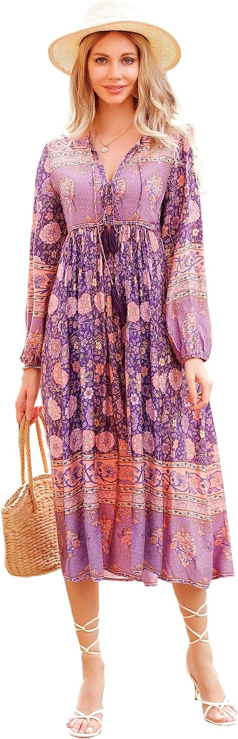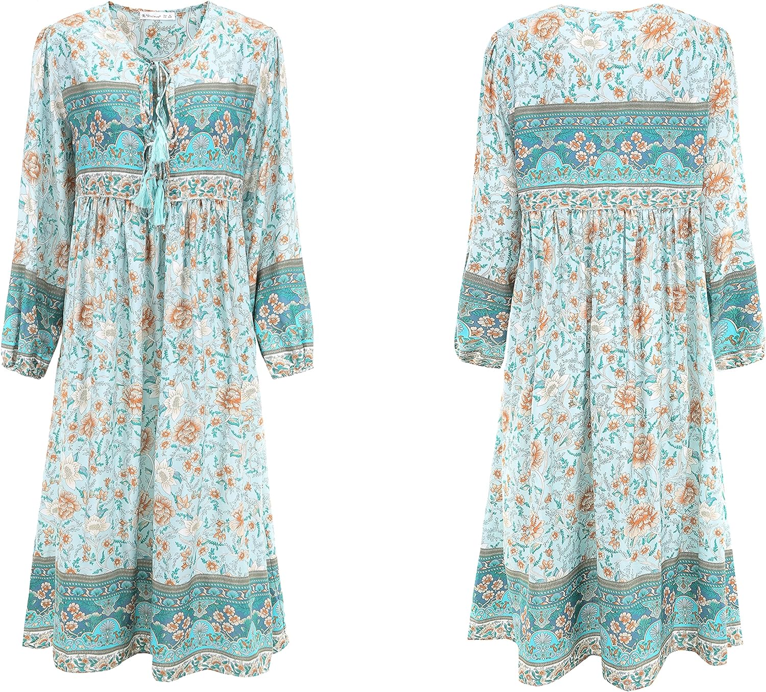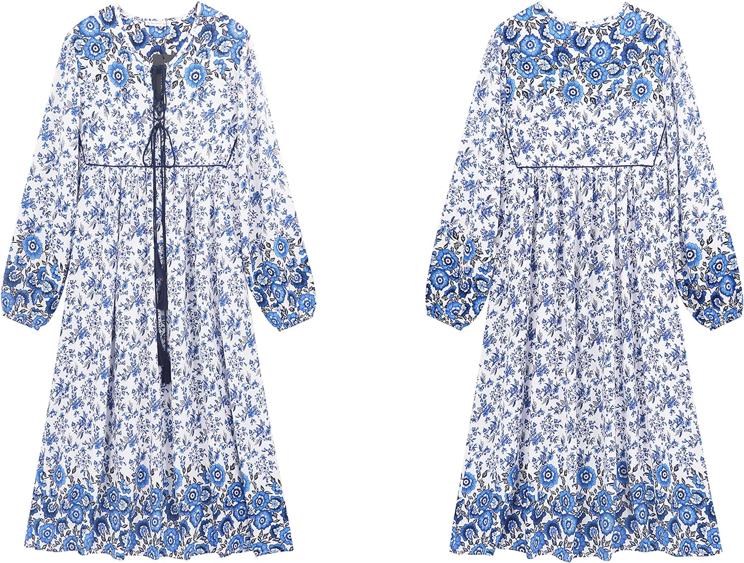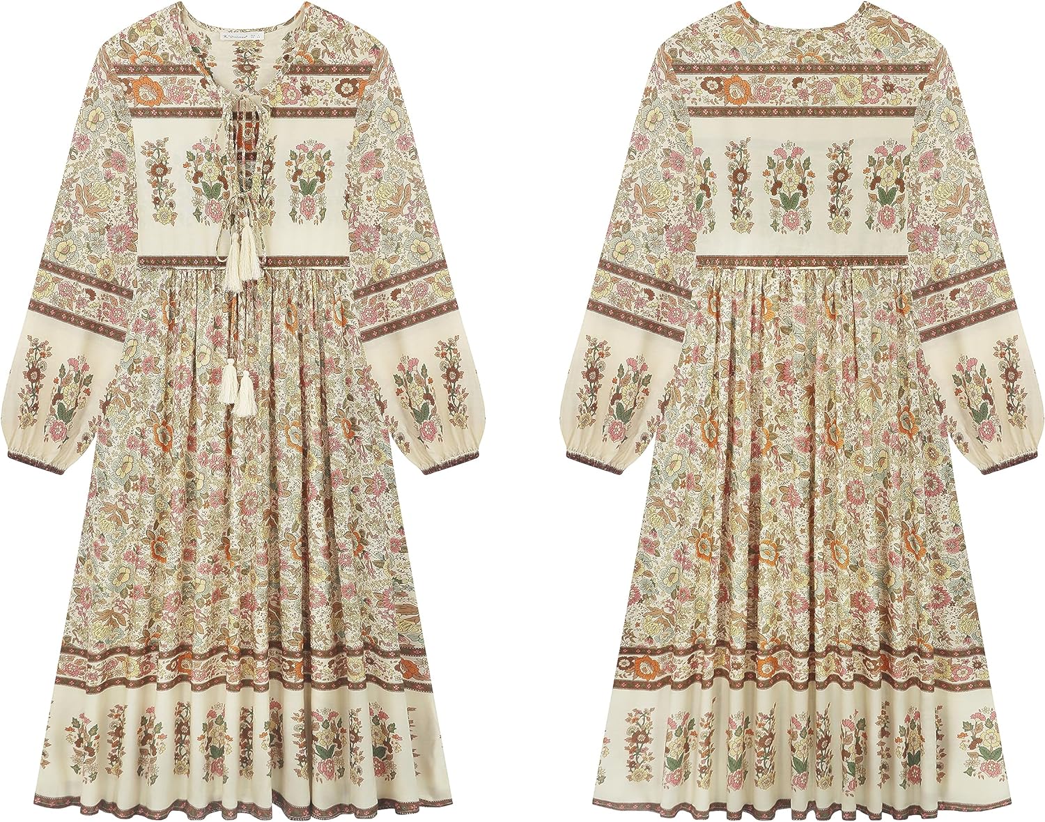 R.Vivimos Women's Long Sleeve Floral Print Retro V Neck Tassel Bohemian Midi Dresses