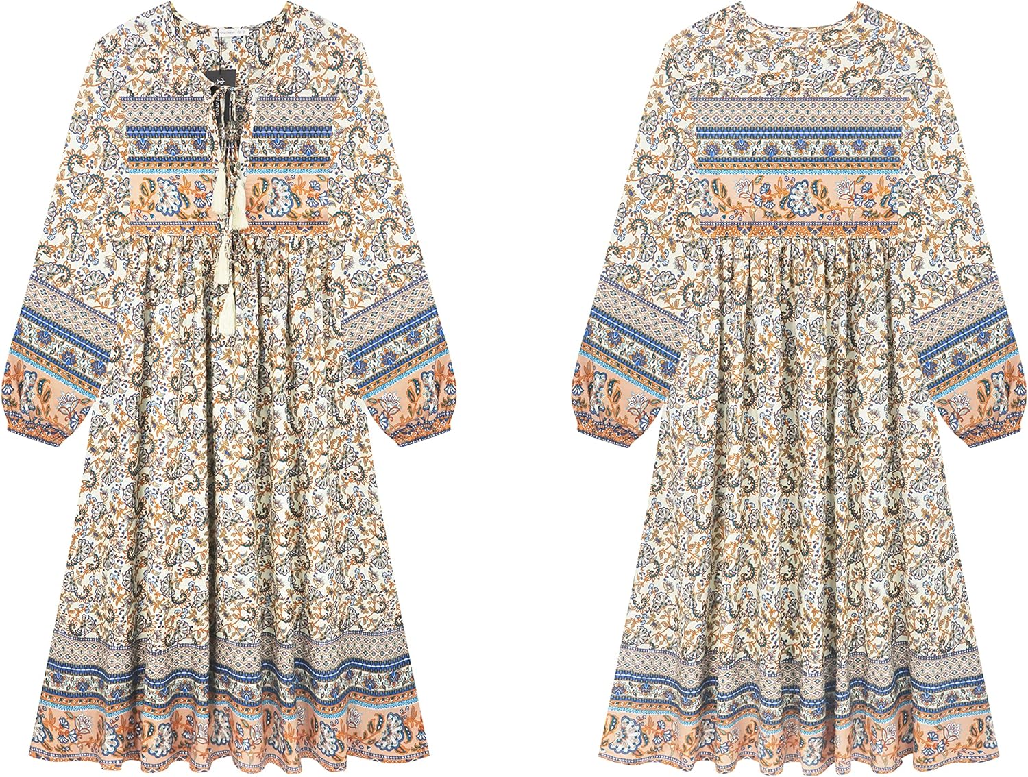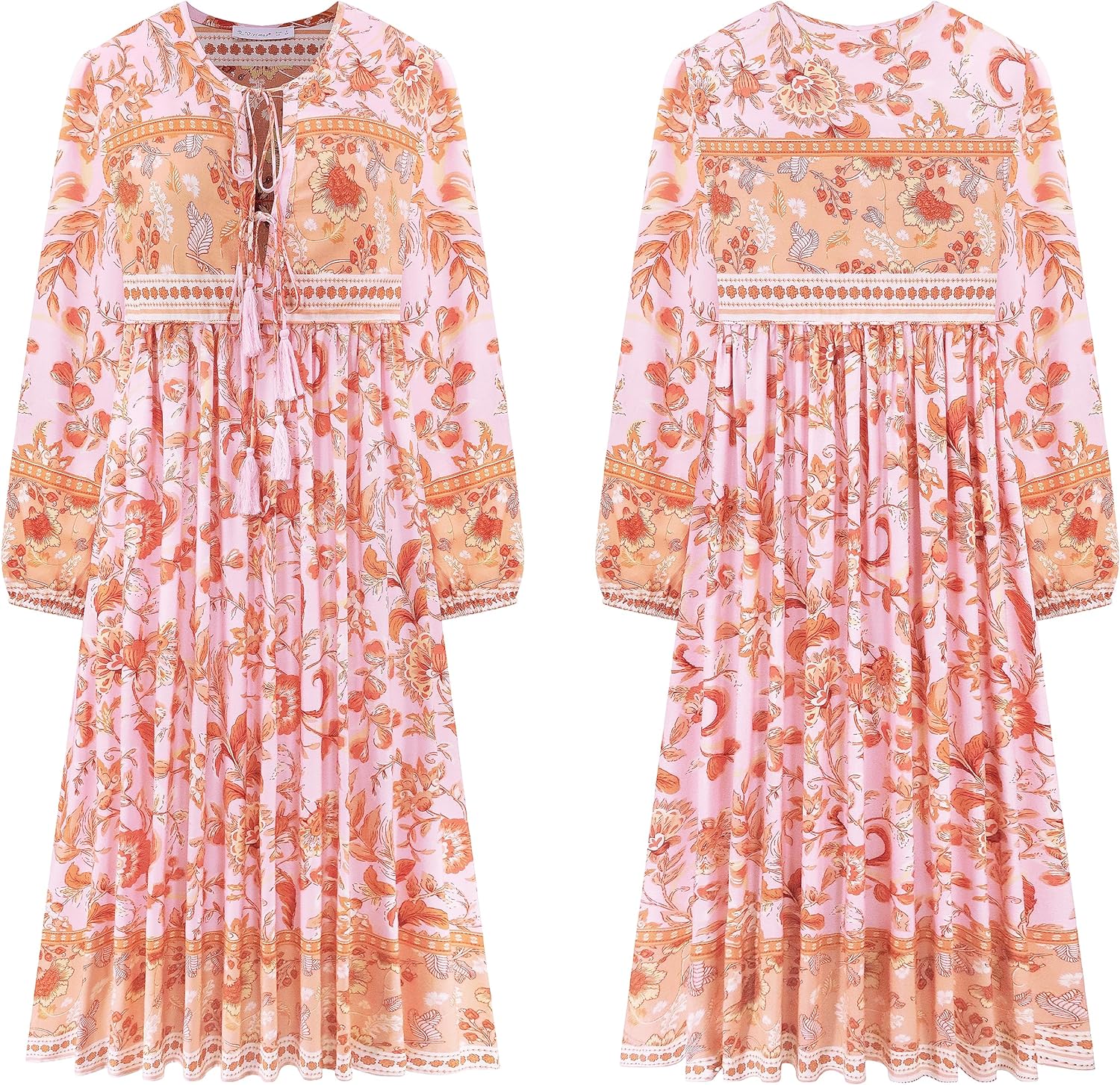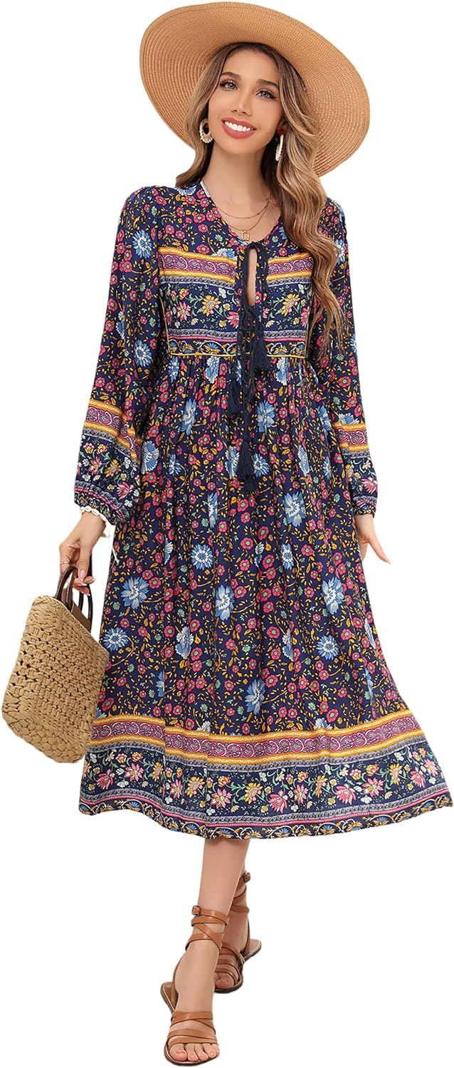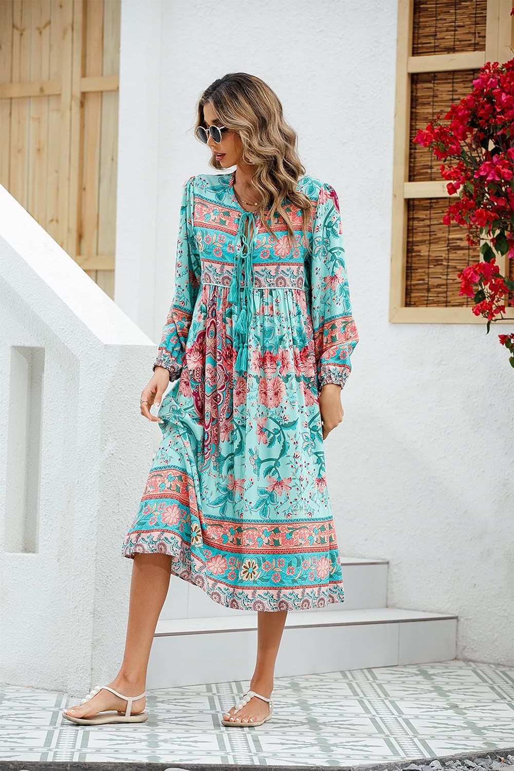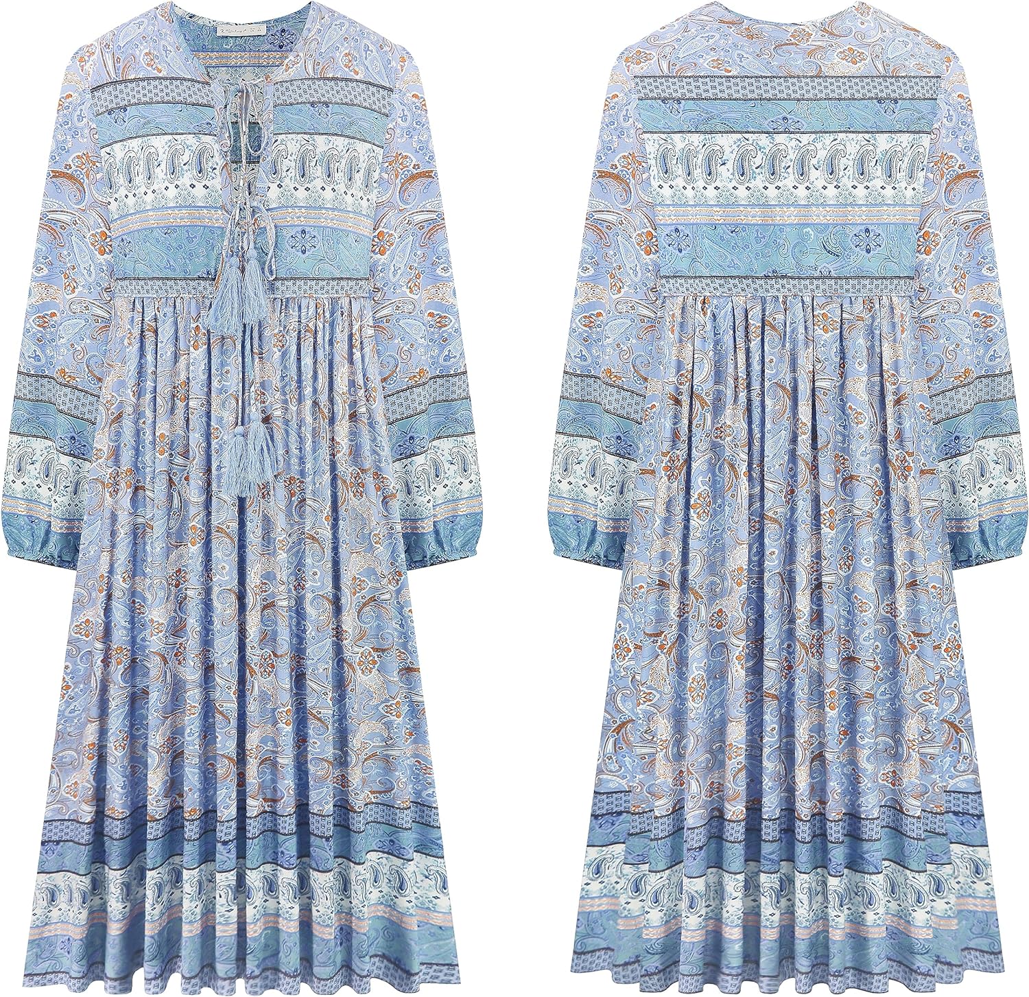 R.Vivimos Women's Long Sleeve Floral Print Retro V Neck Tassel Bohemian Midi Dresses