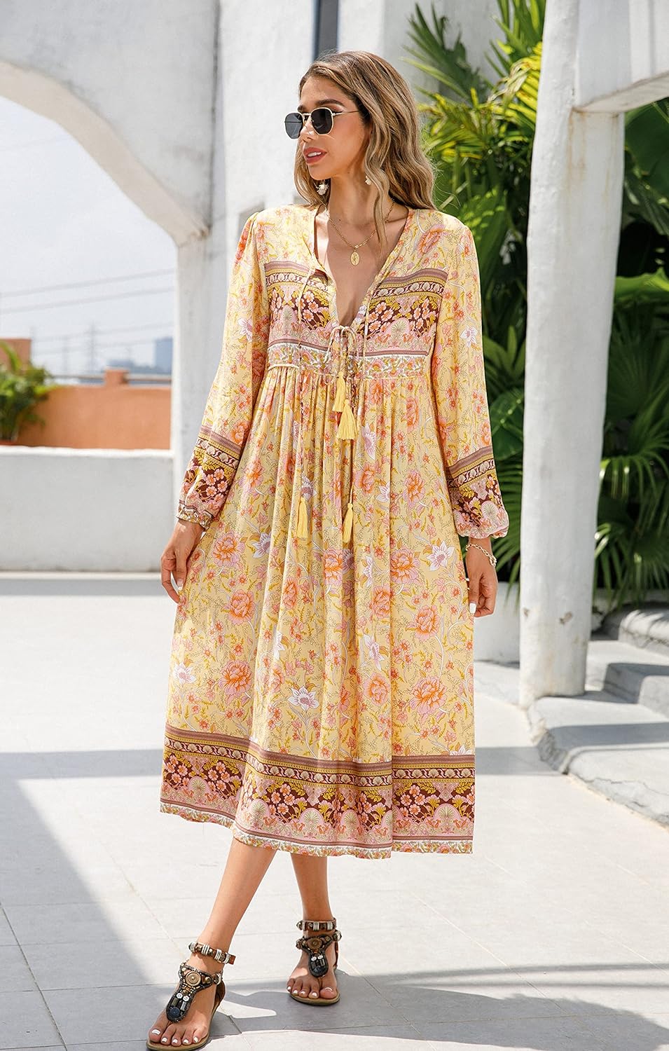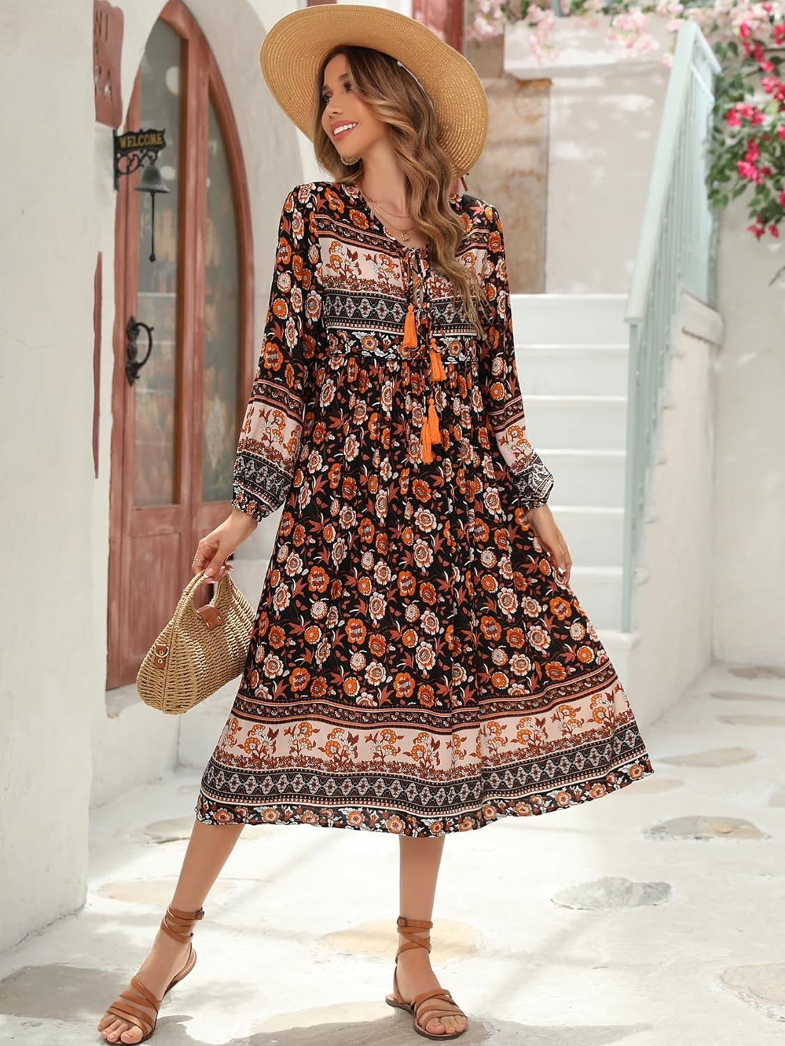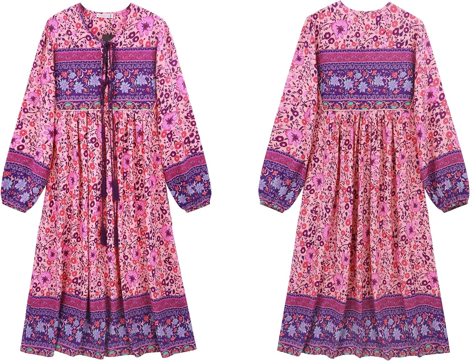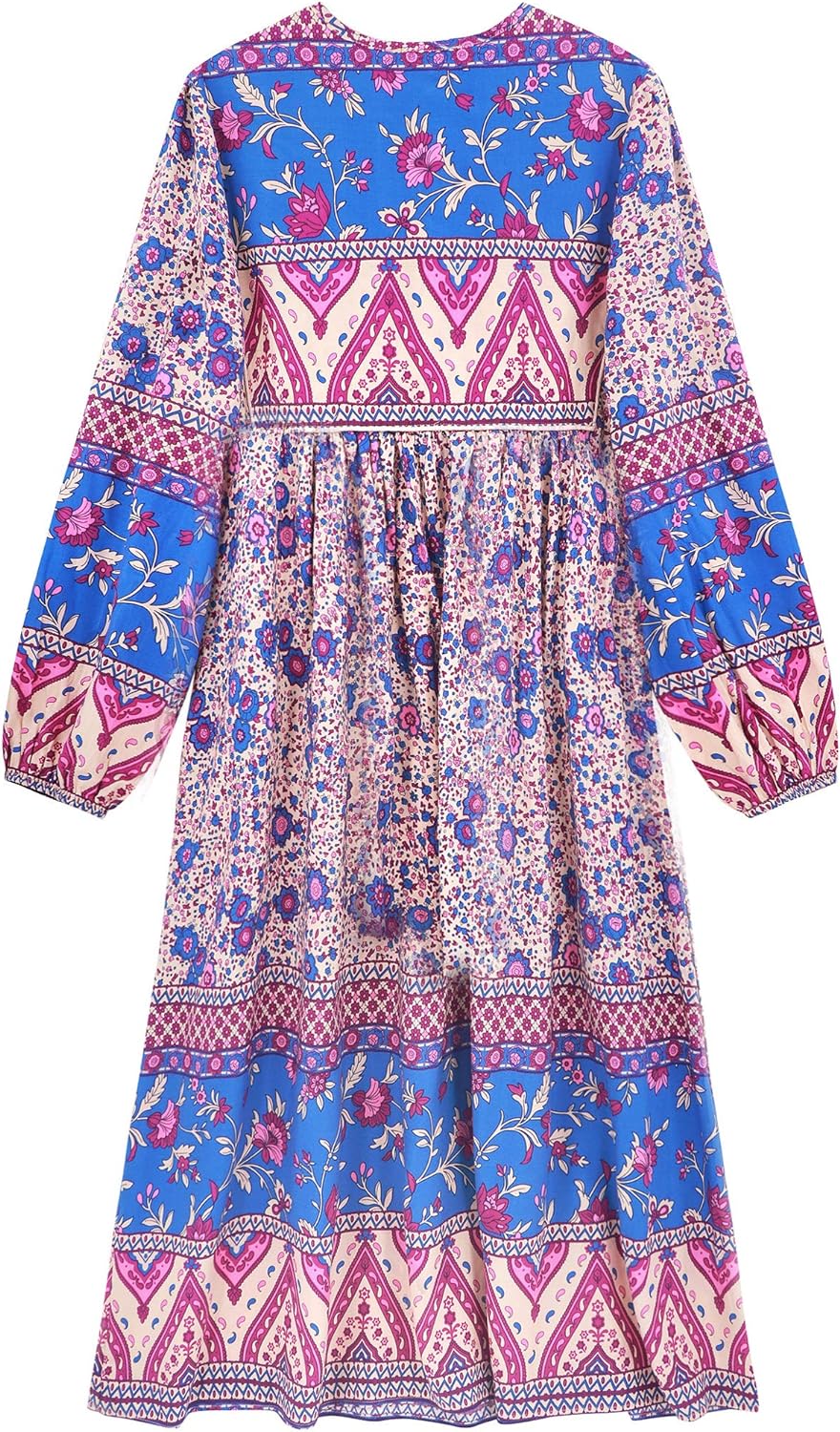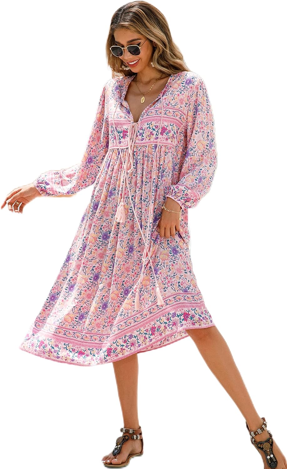 R.Vivimos Women's Long Sleeve Floral Print Retro V Neck Tassel Bohemian Midi Dresses