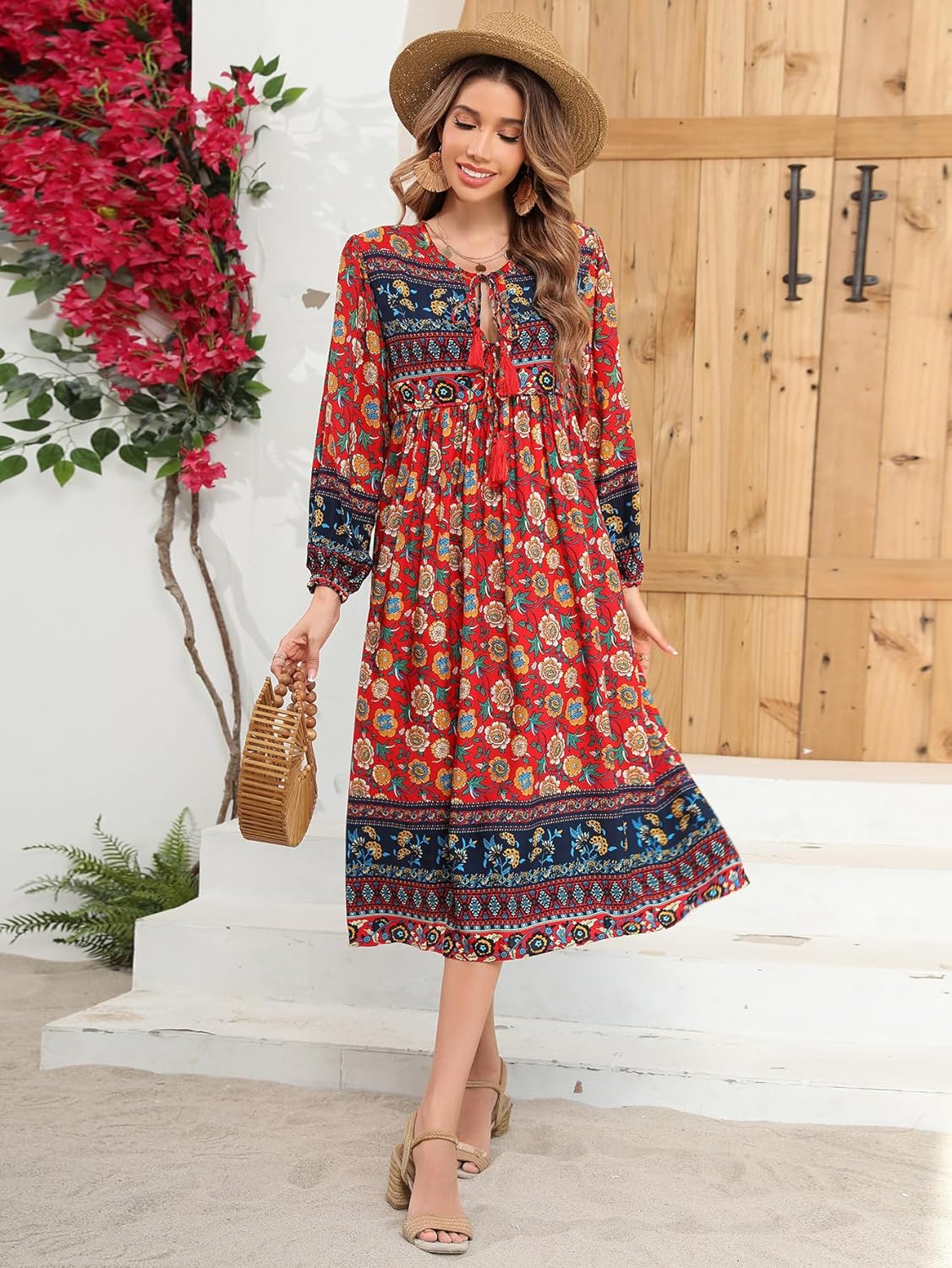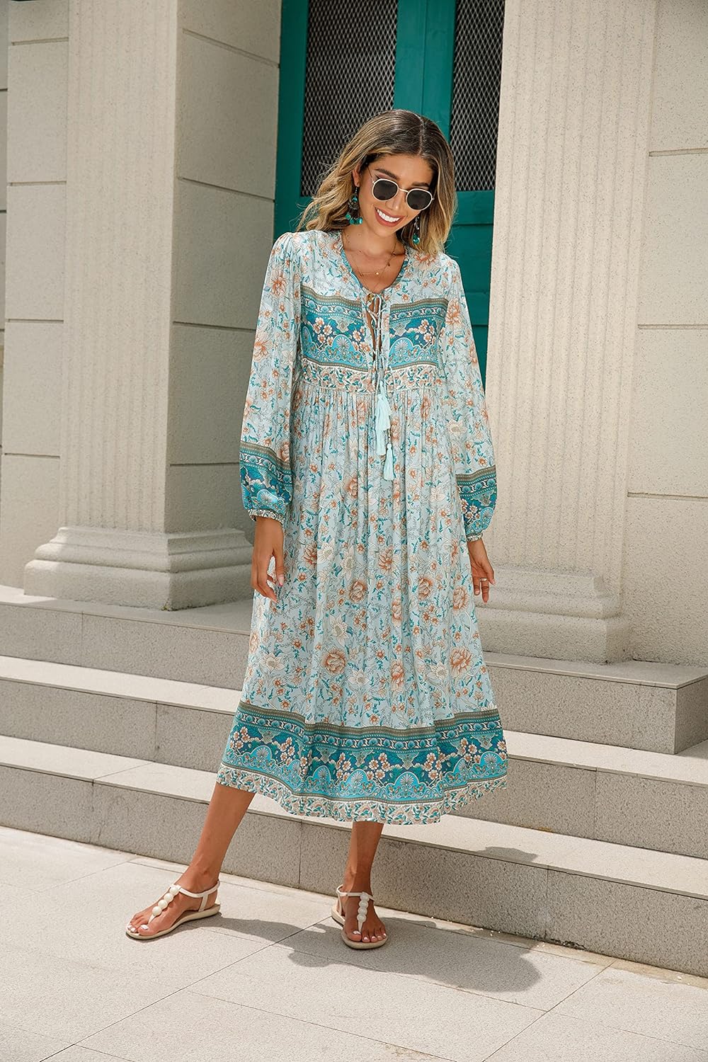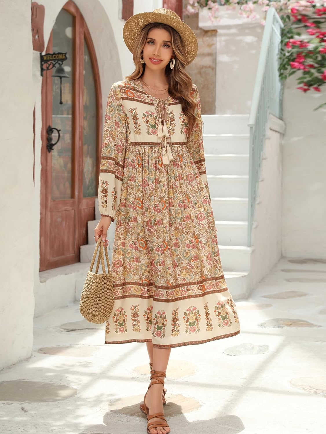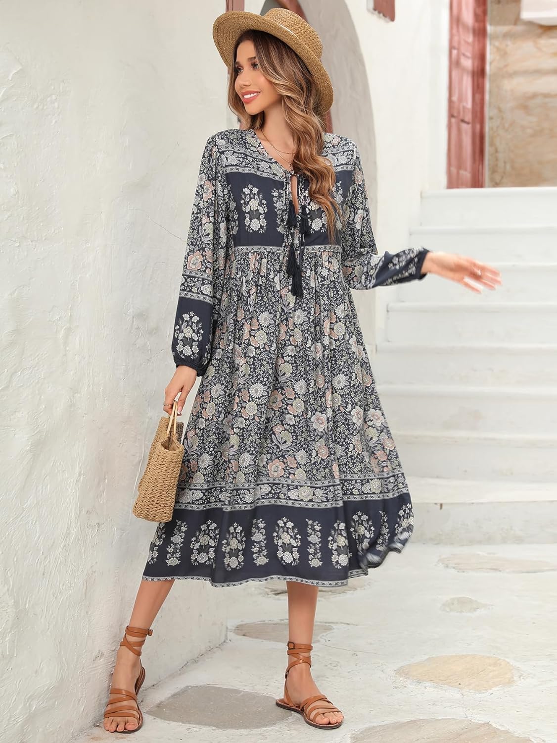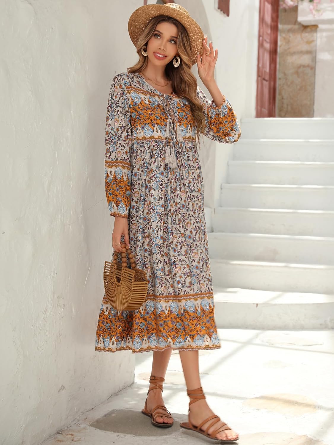 R.Vivimos Women's Long Sleeve Floral Print Retro V Neck Tassel Bohemian Midi Dresses