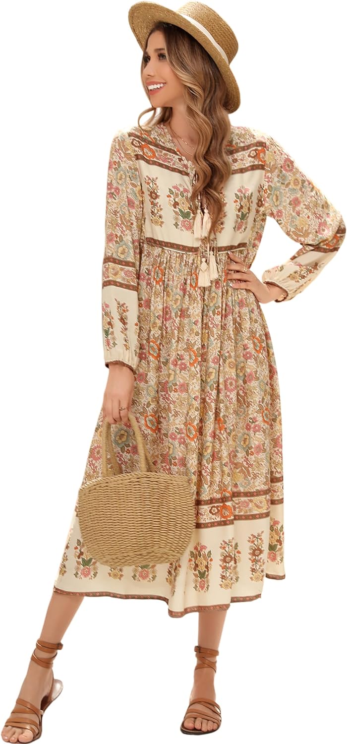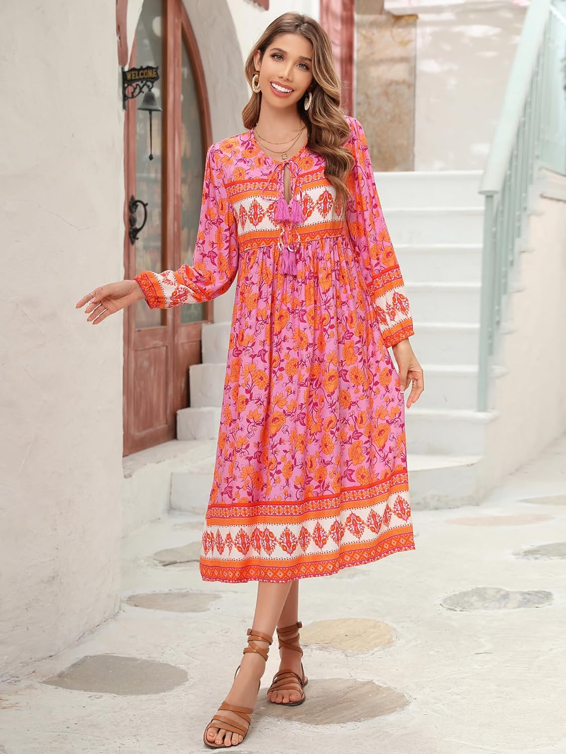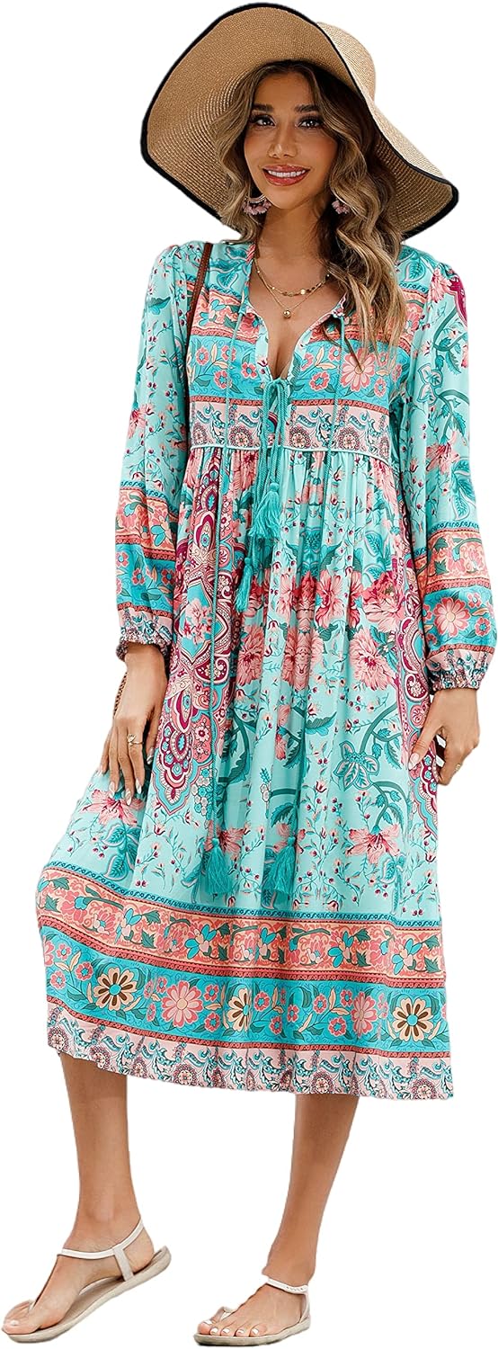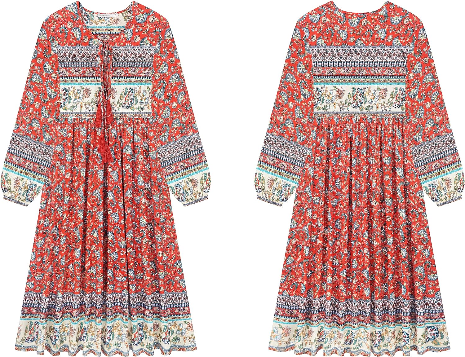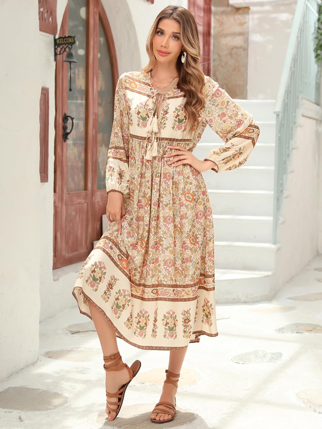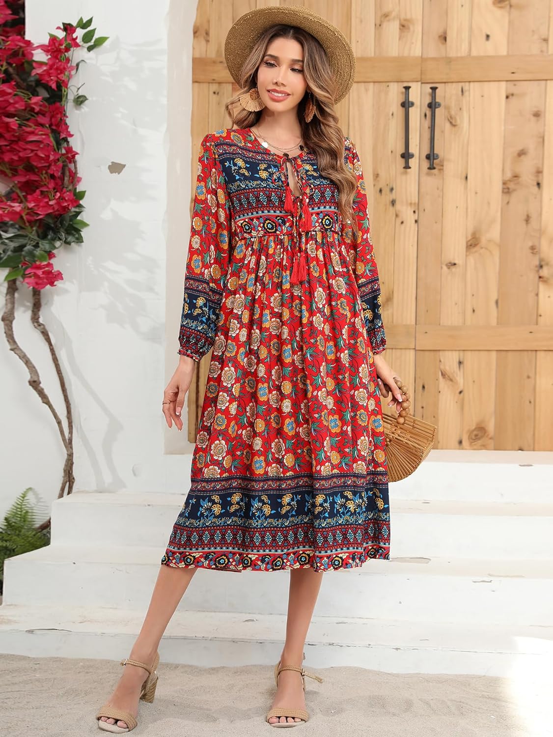 R.Vivimos Women's Long Sleeve Floral Print Retro V Neck Tassel Bohemian Midi Dresses