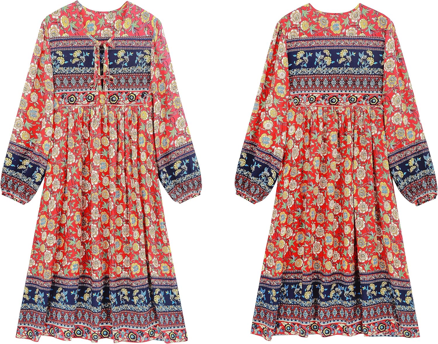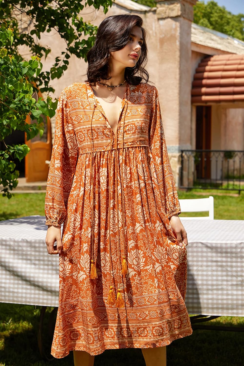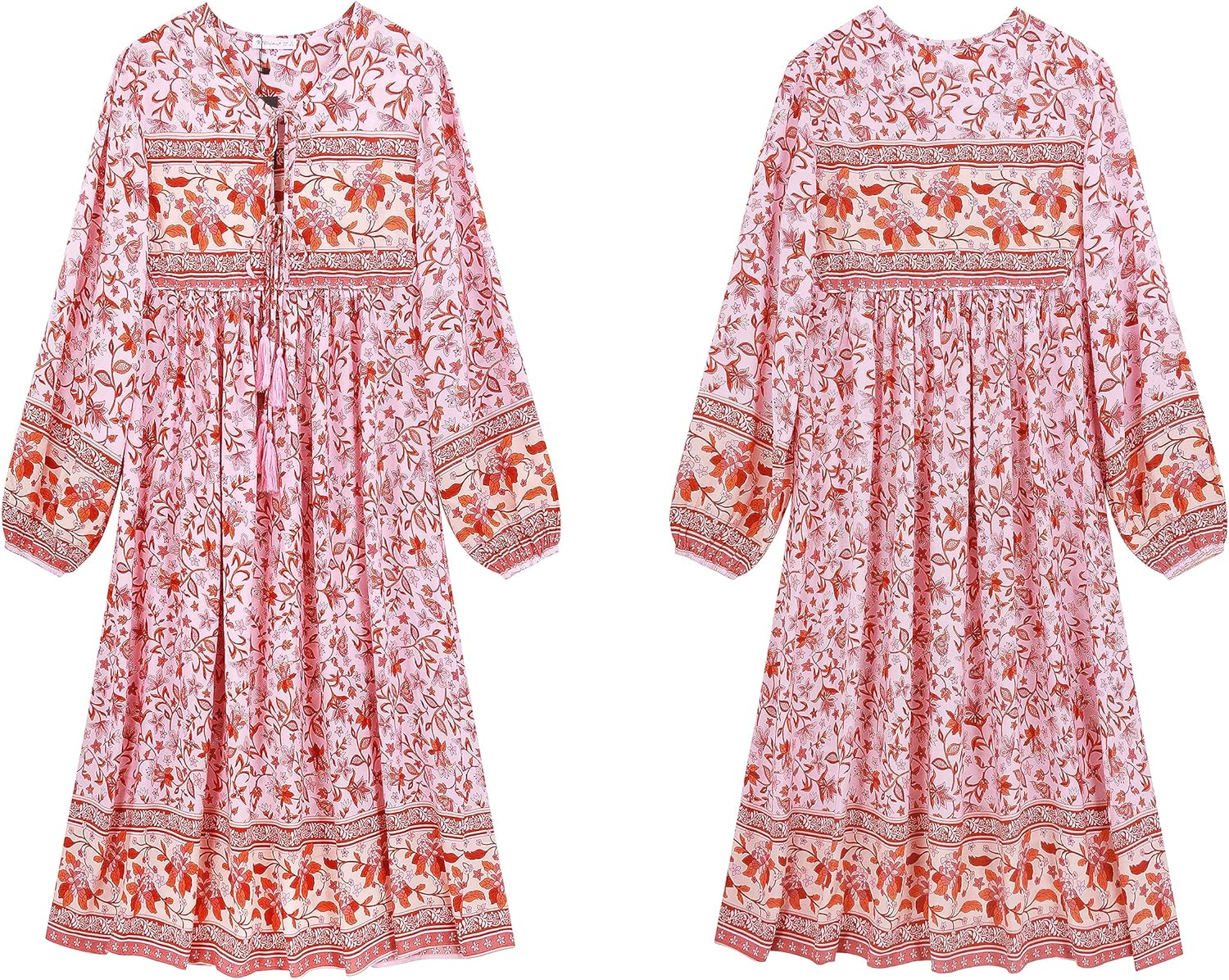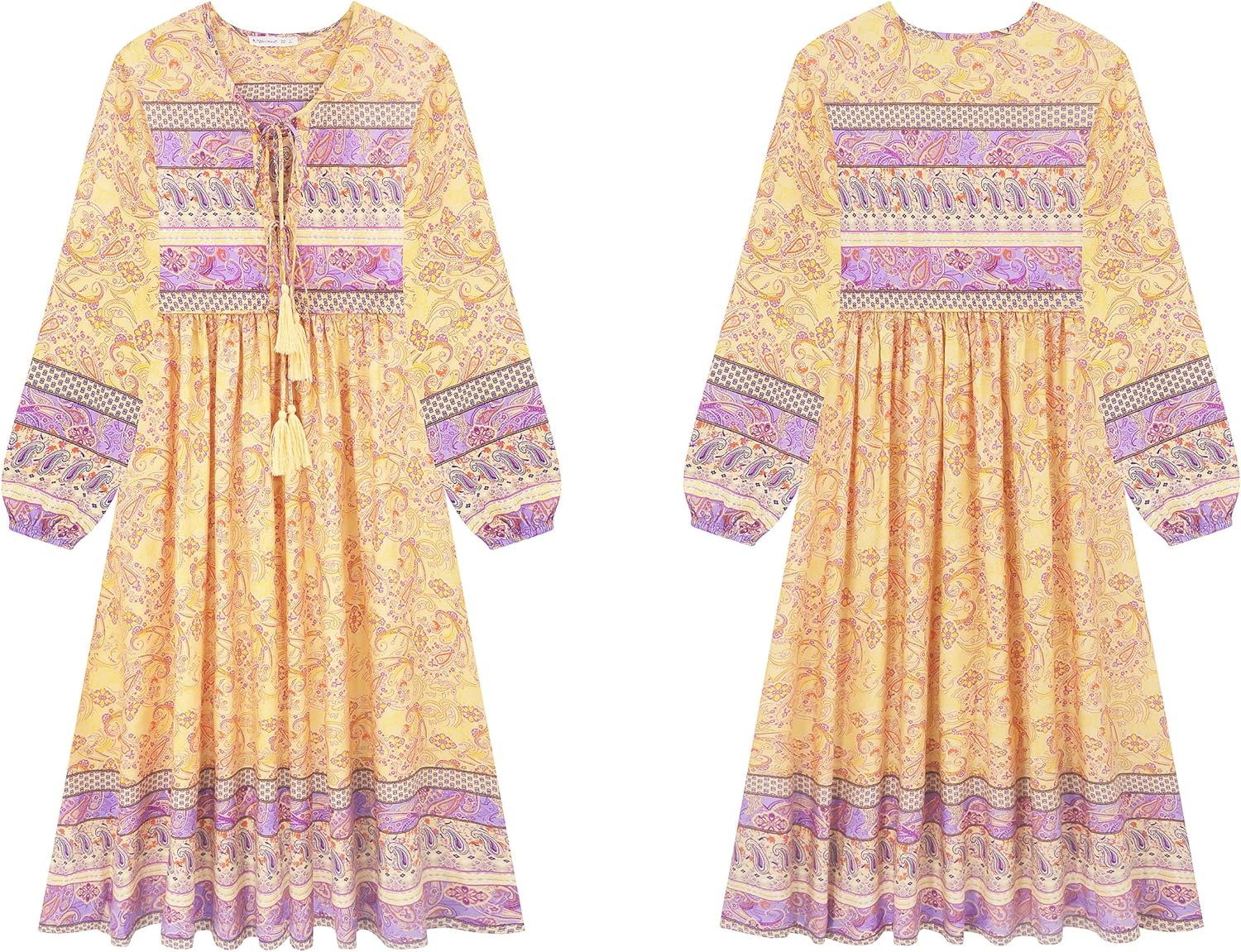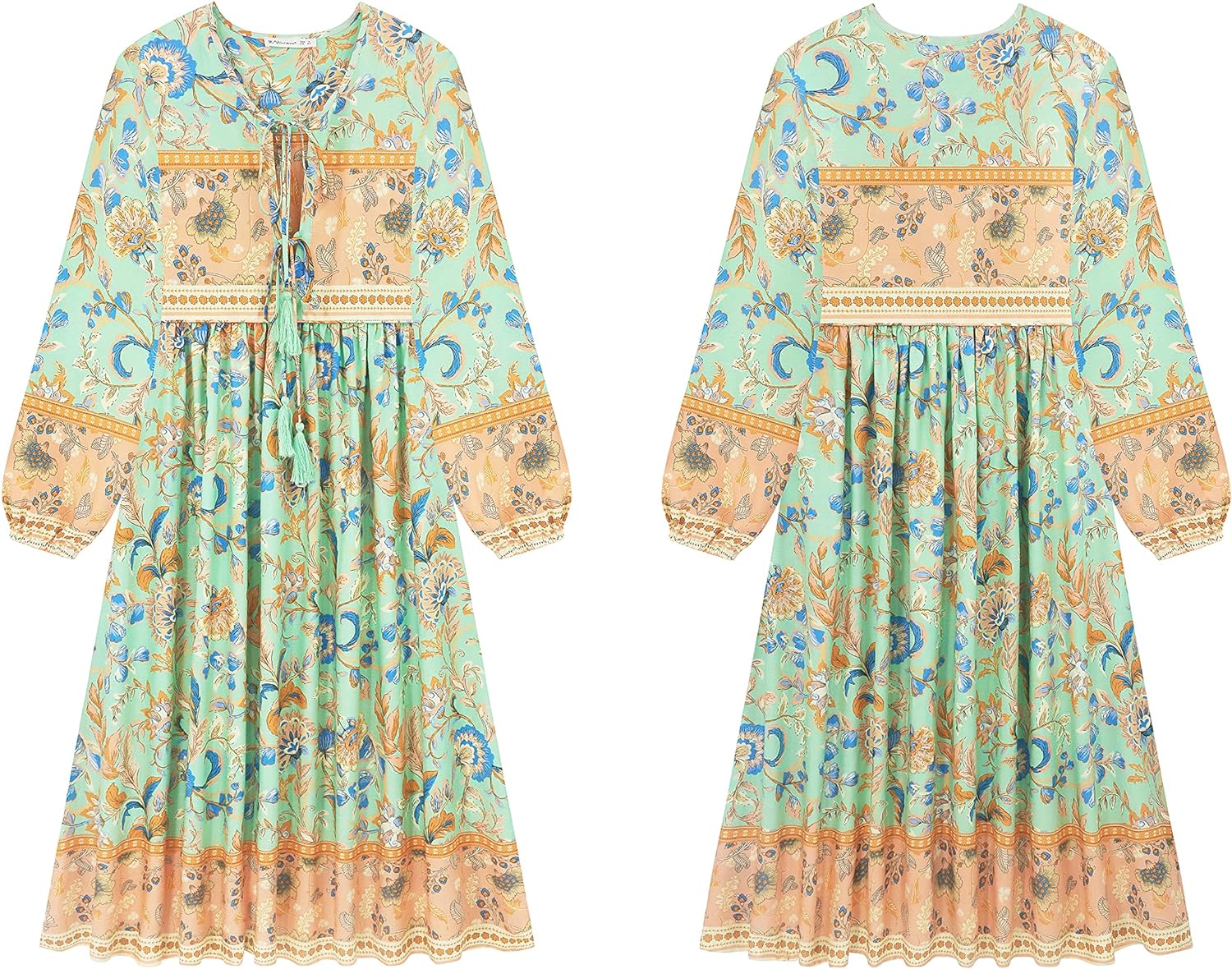 R.Vivimos Women's Long Sleeve Floral Print Retro V Neck Tassel Bohemian Midi Dresses