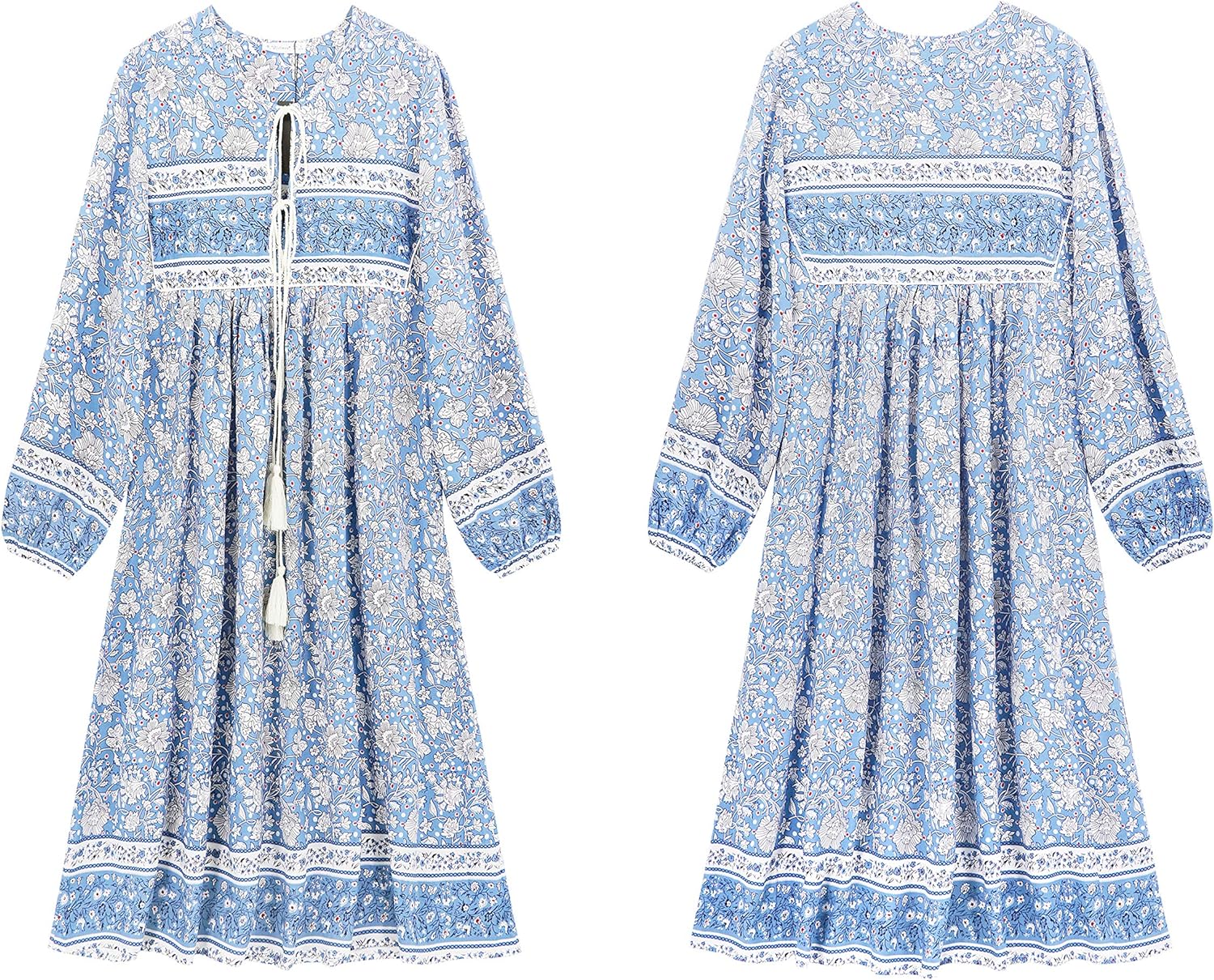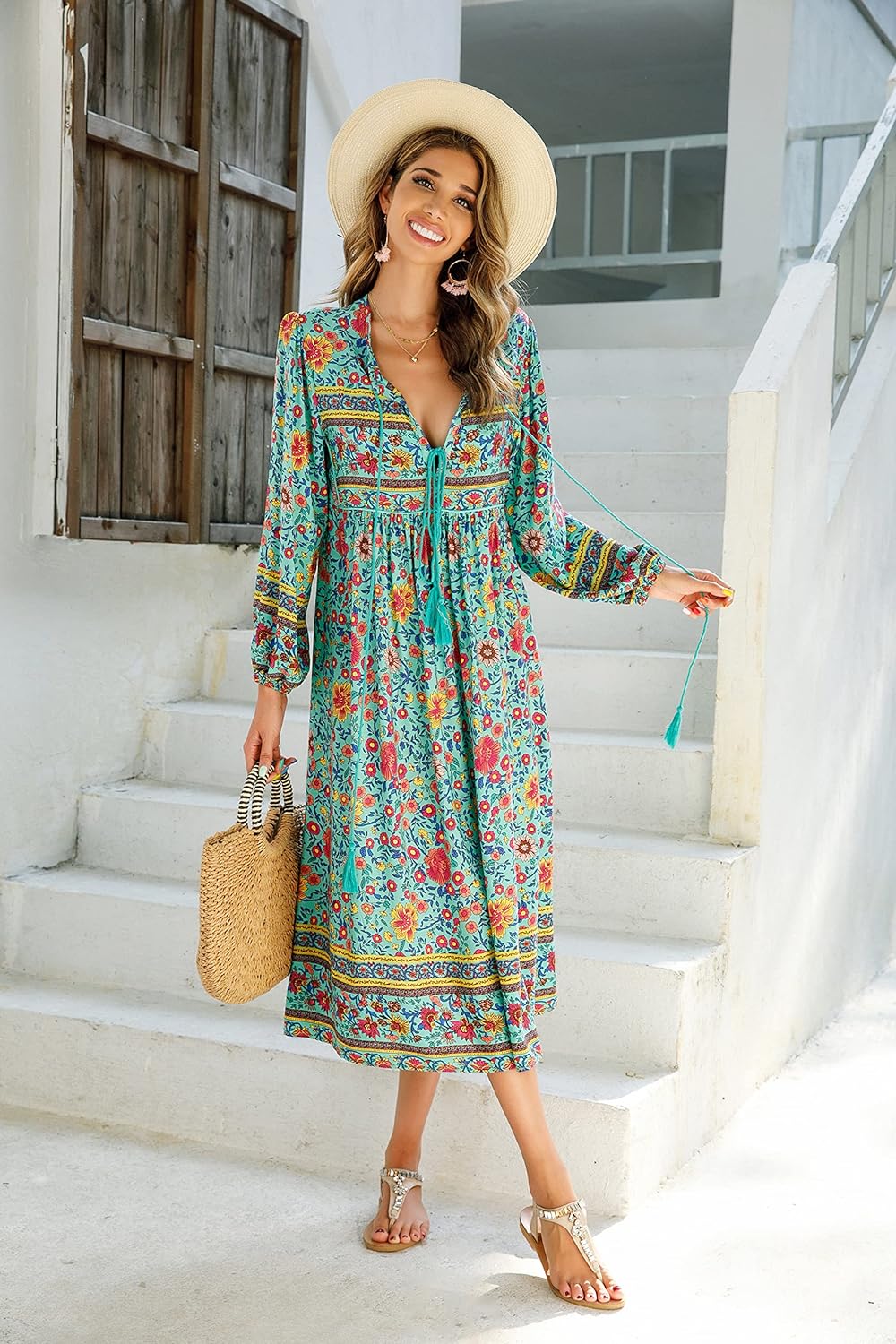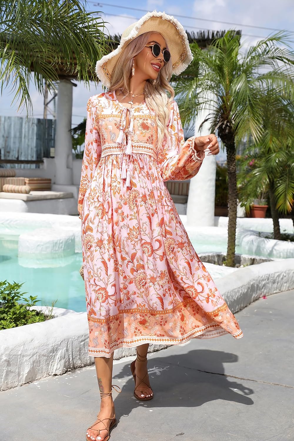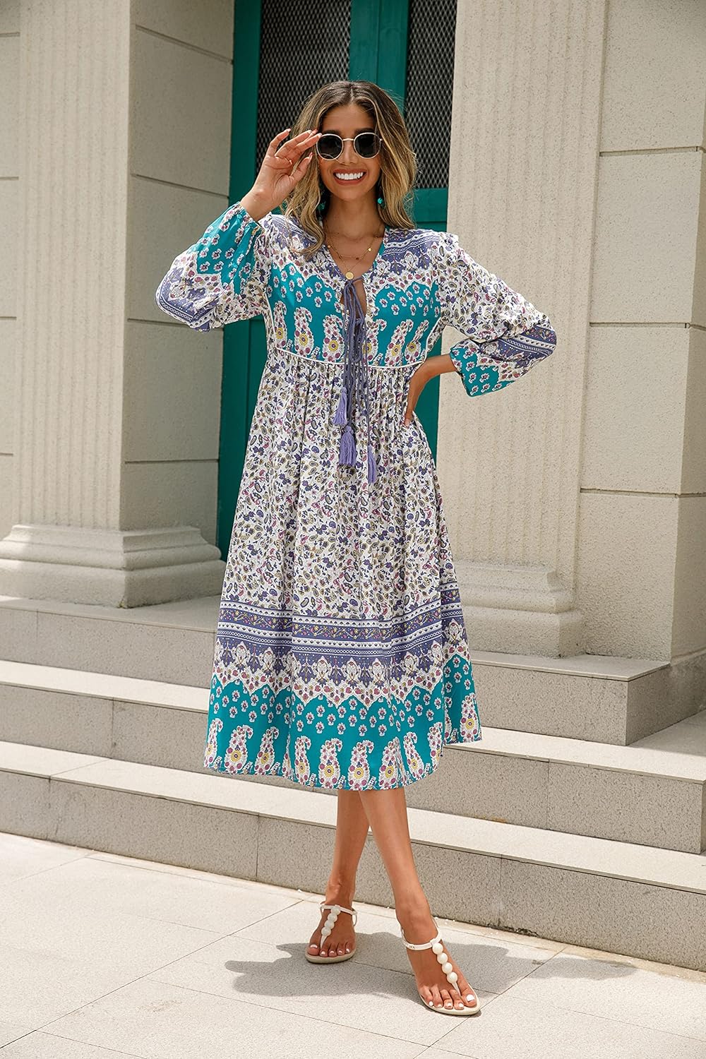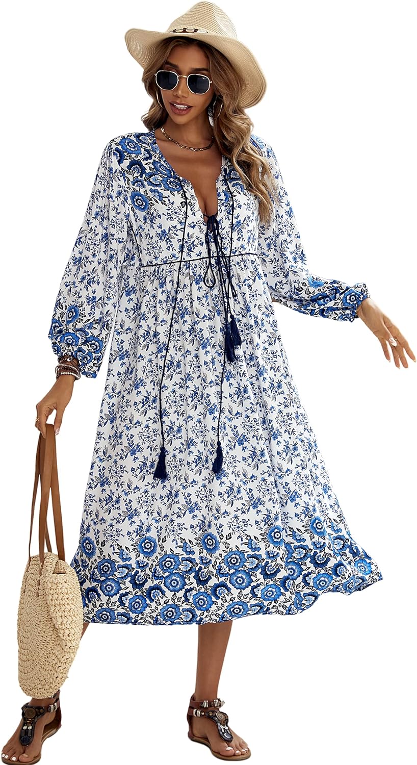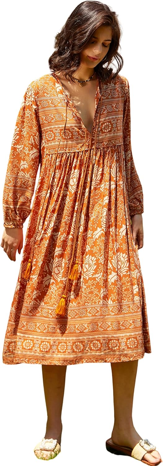 R.Vivimos Women's Long Sleeve Floral Print Retro V Neck Tassel Bohemian Midi Dresses