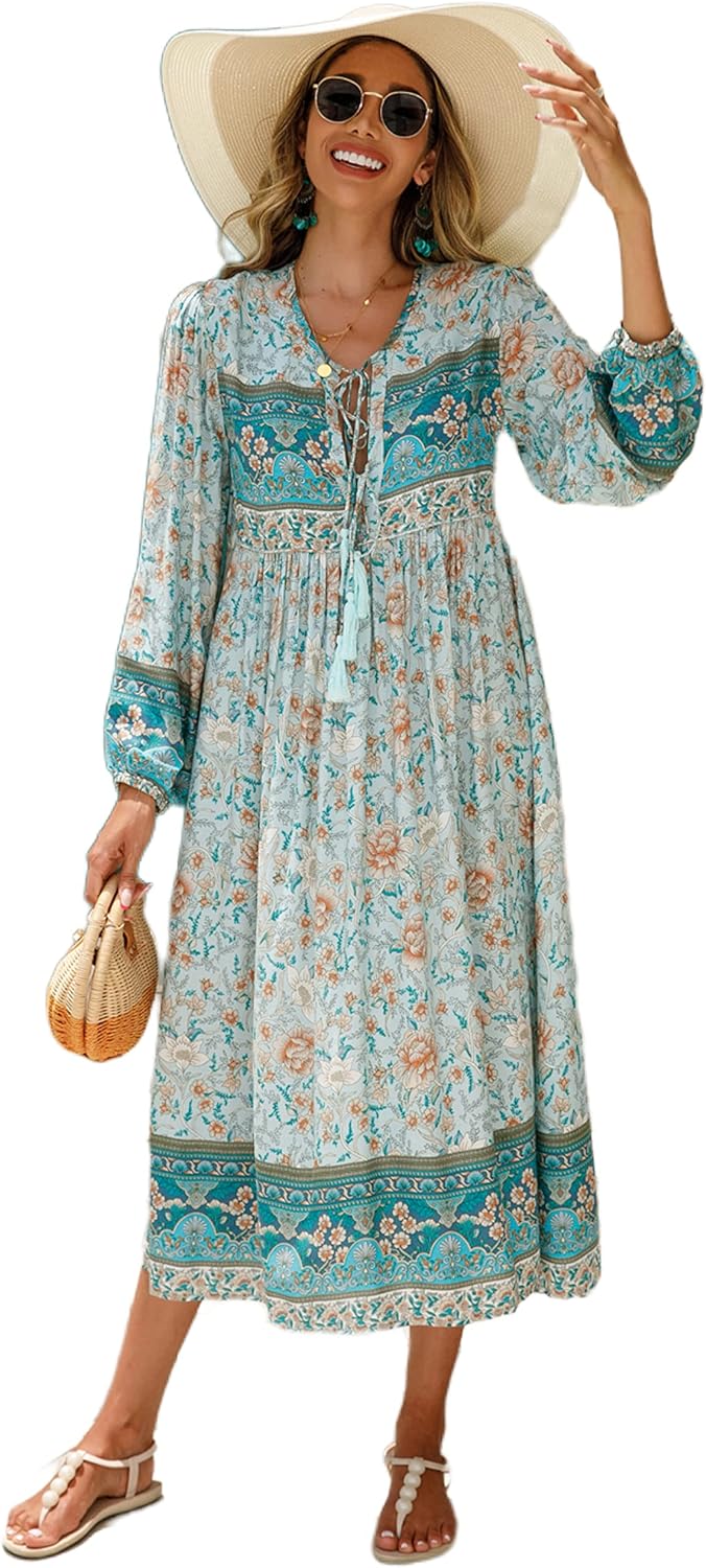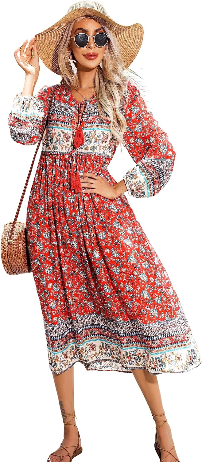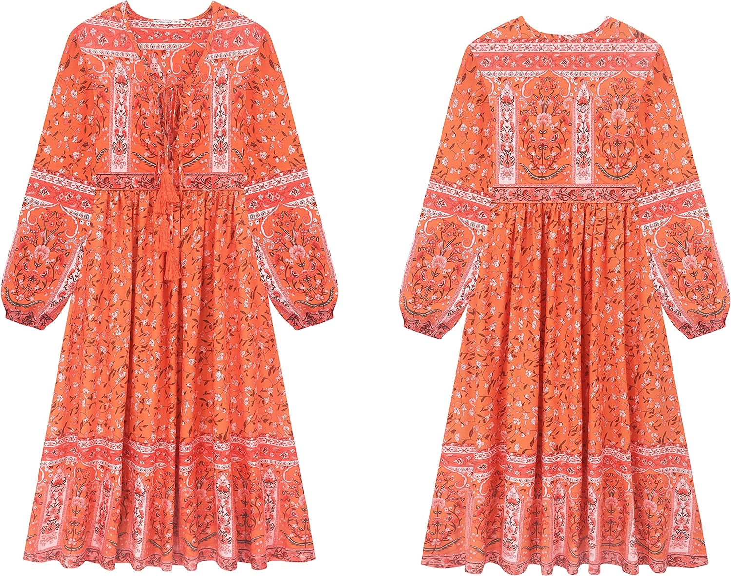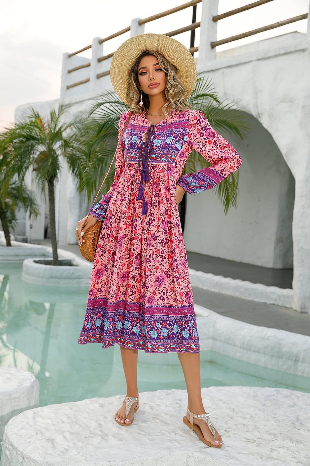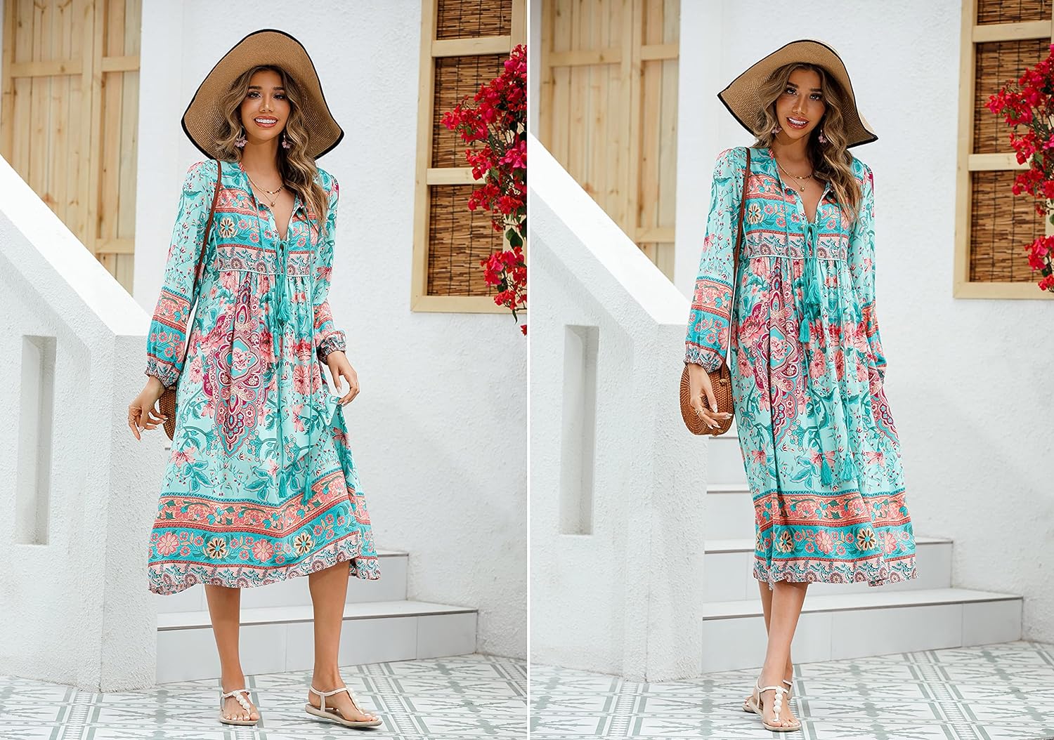 R.Vivimos Women's Long Sleeve Floral Print Retro V Neck Tassel Bohemian Midi Dresses