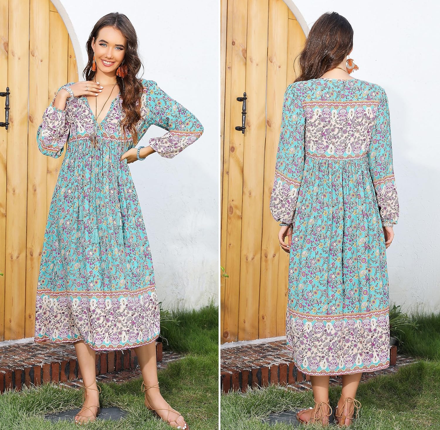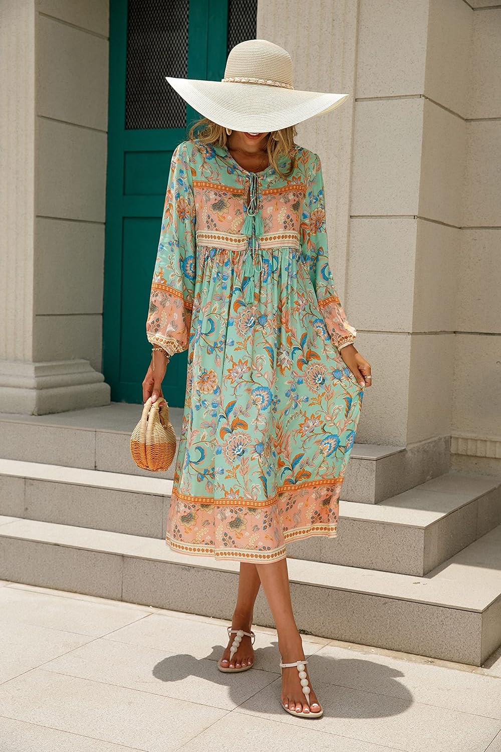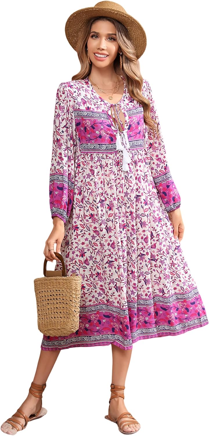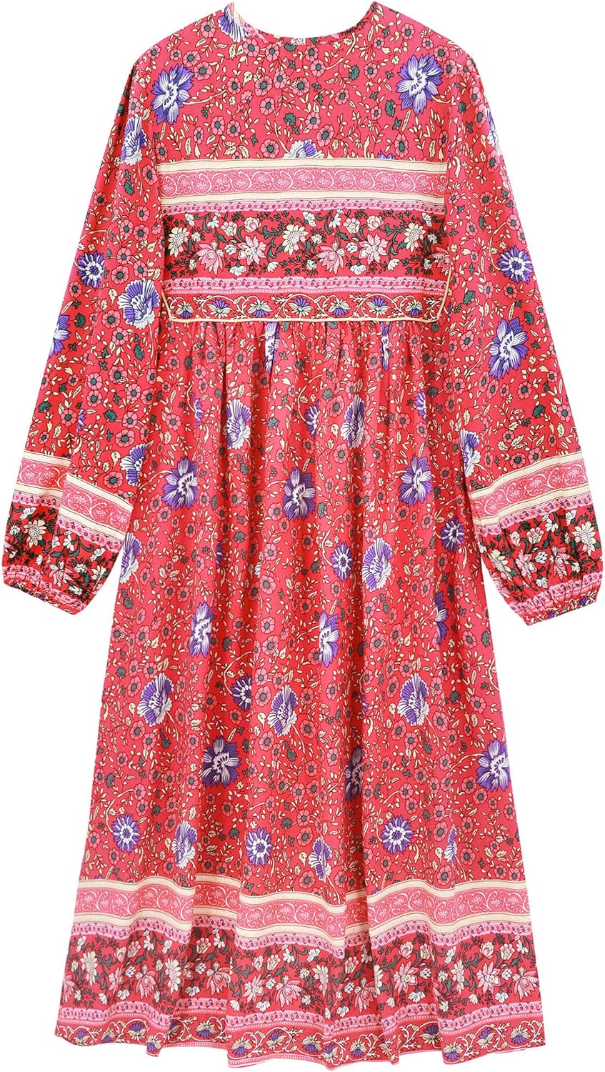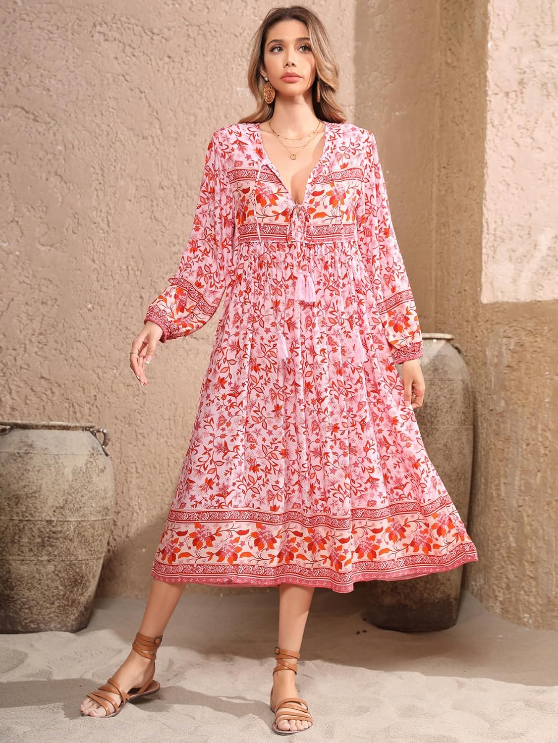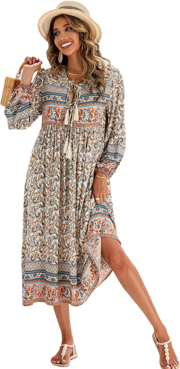 R.Vivimos Women's Long Sleeve Floral Print Retro V Neck Tassel Bohemian Midi Dresses