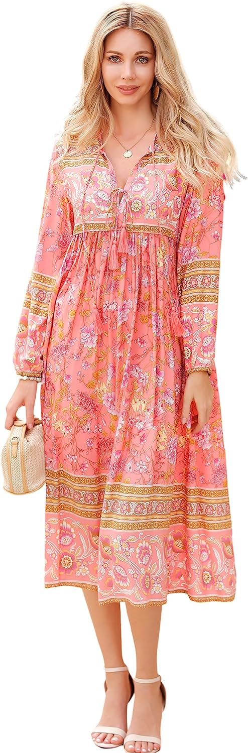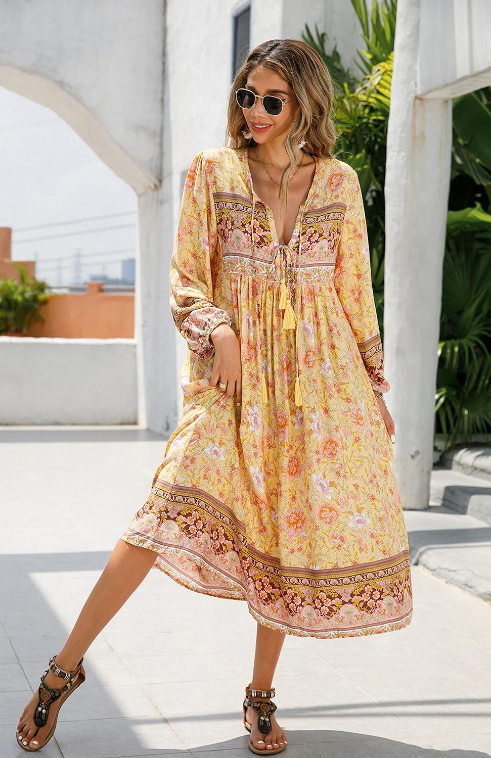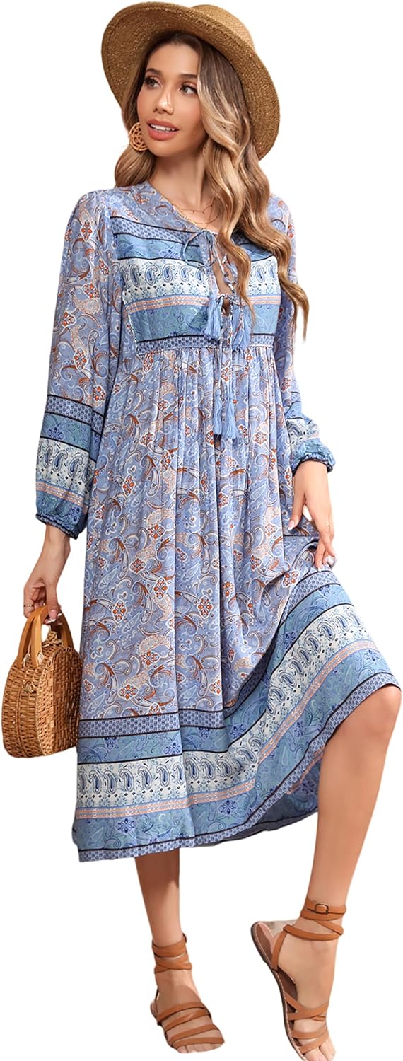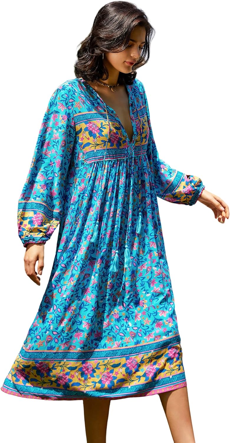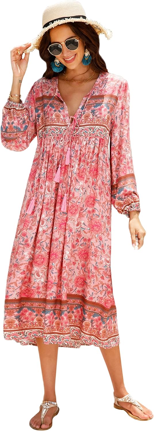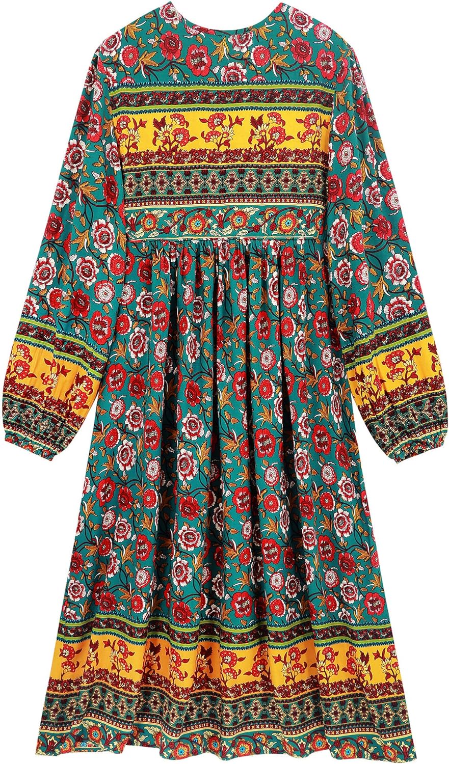 R.Vivimos Women's Long Sleeve Floral Print Retro V Neck Tassel Bohemian Midi Dresses