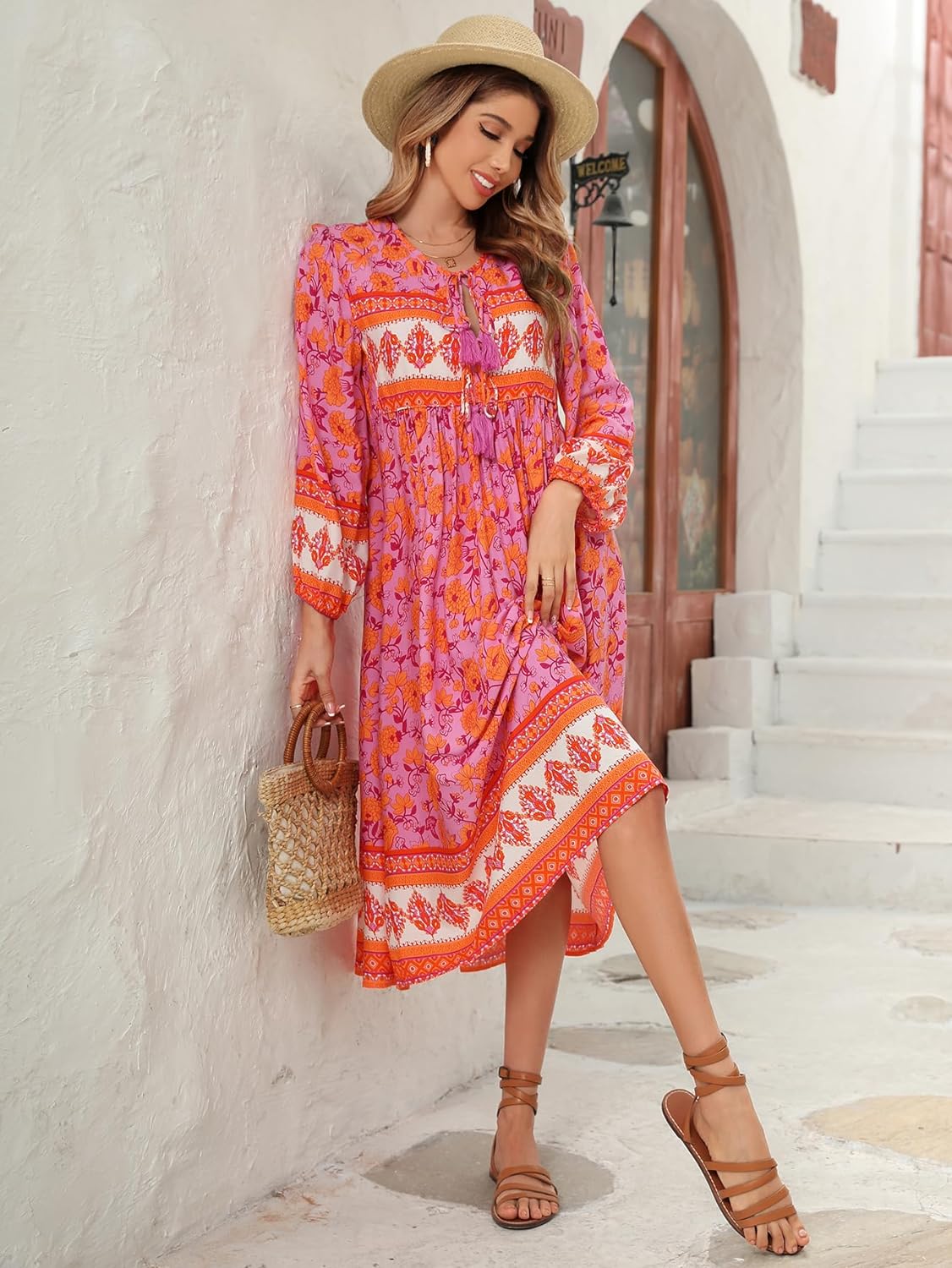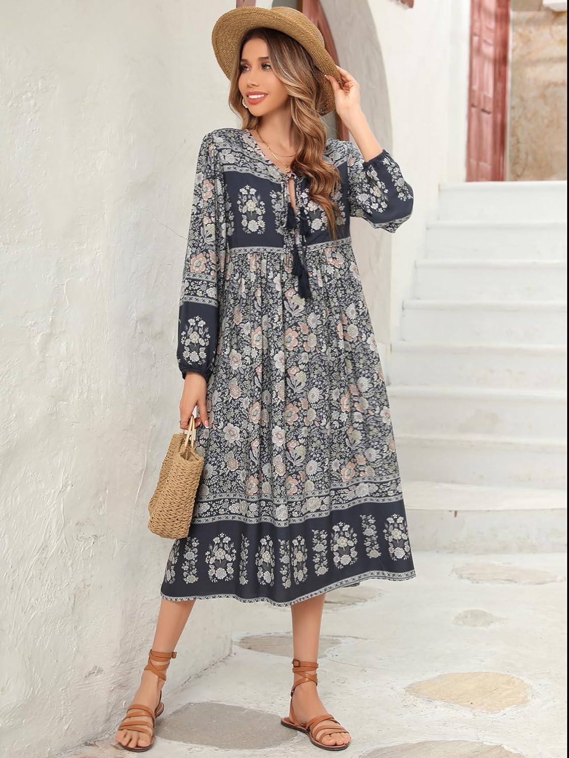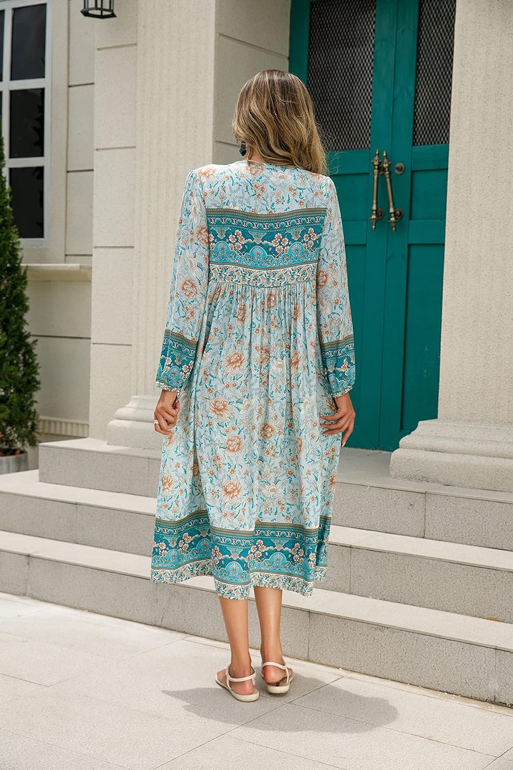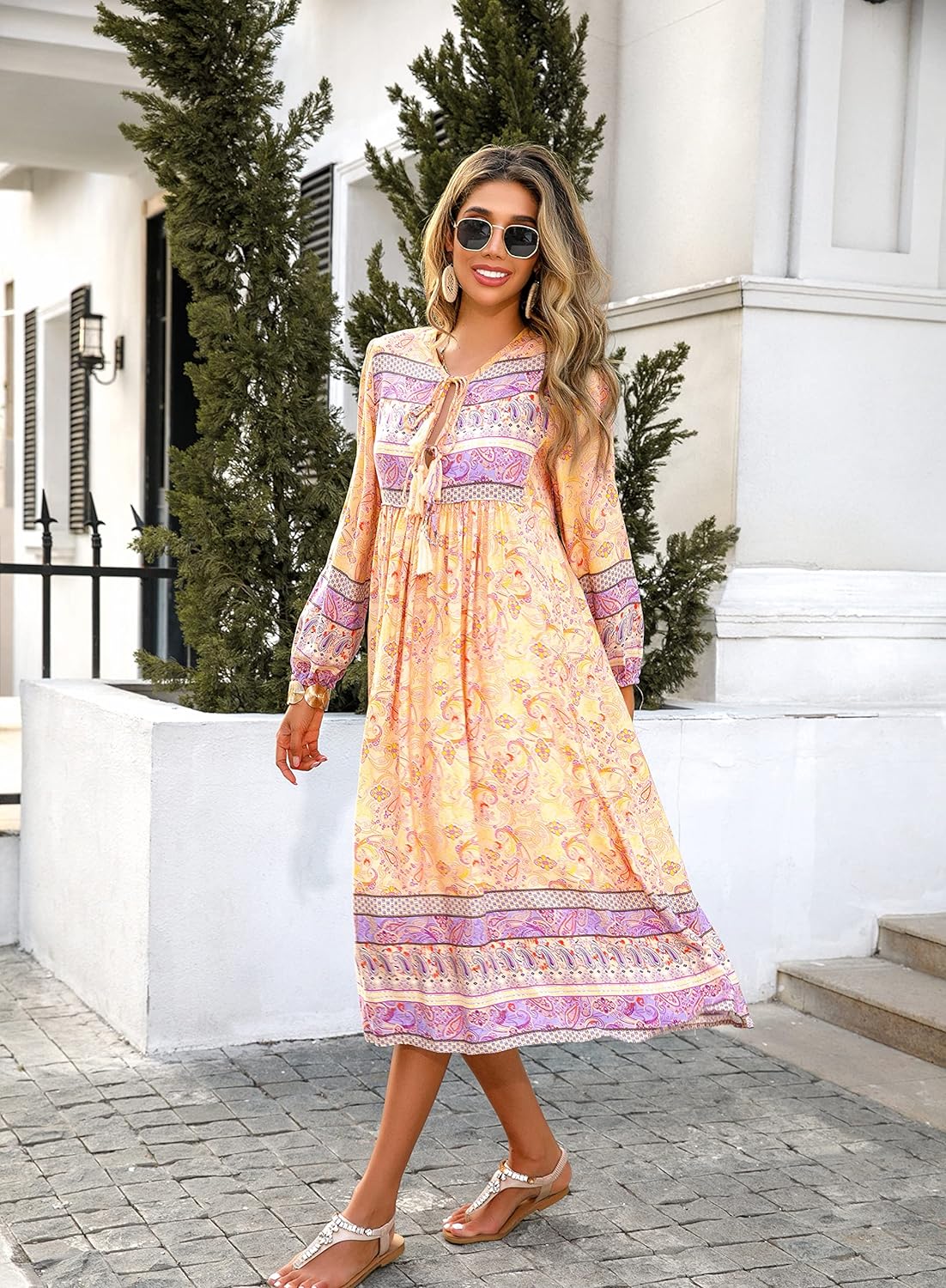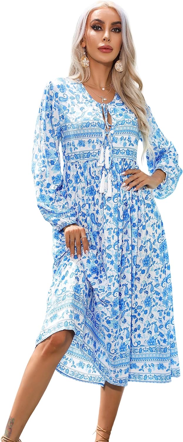 R.Vivimos Women's Long Sleeve Floral Print Retro V Neck Tassel Bohemian Midi Dresses