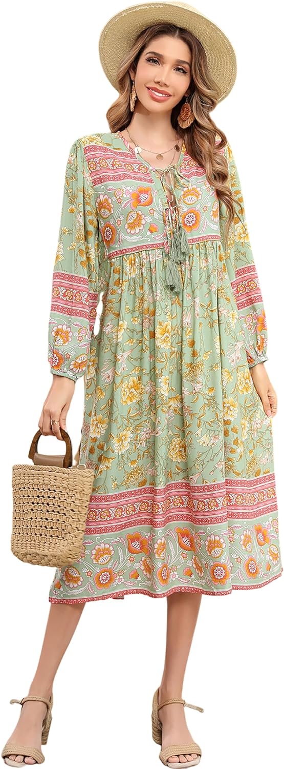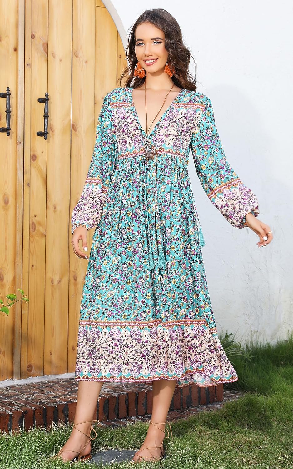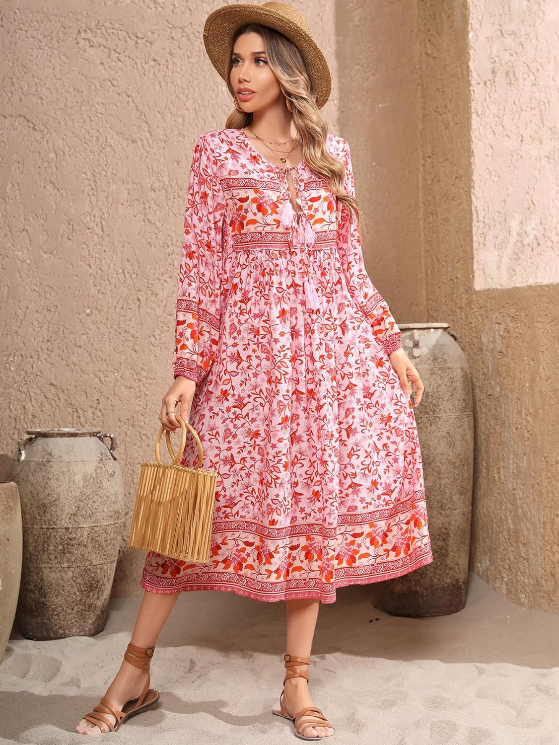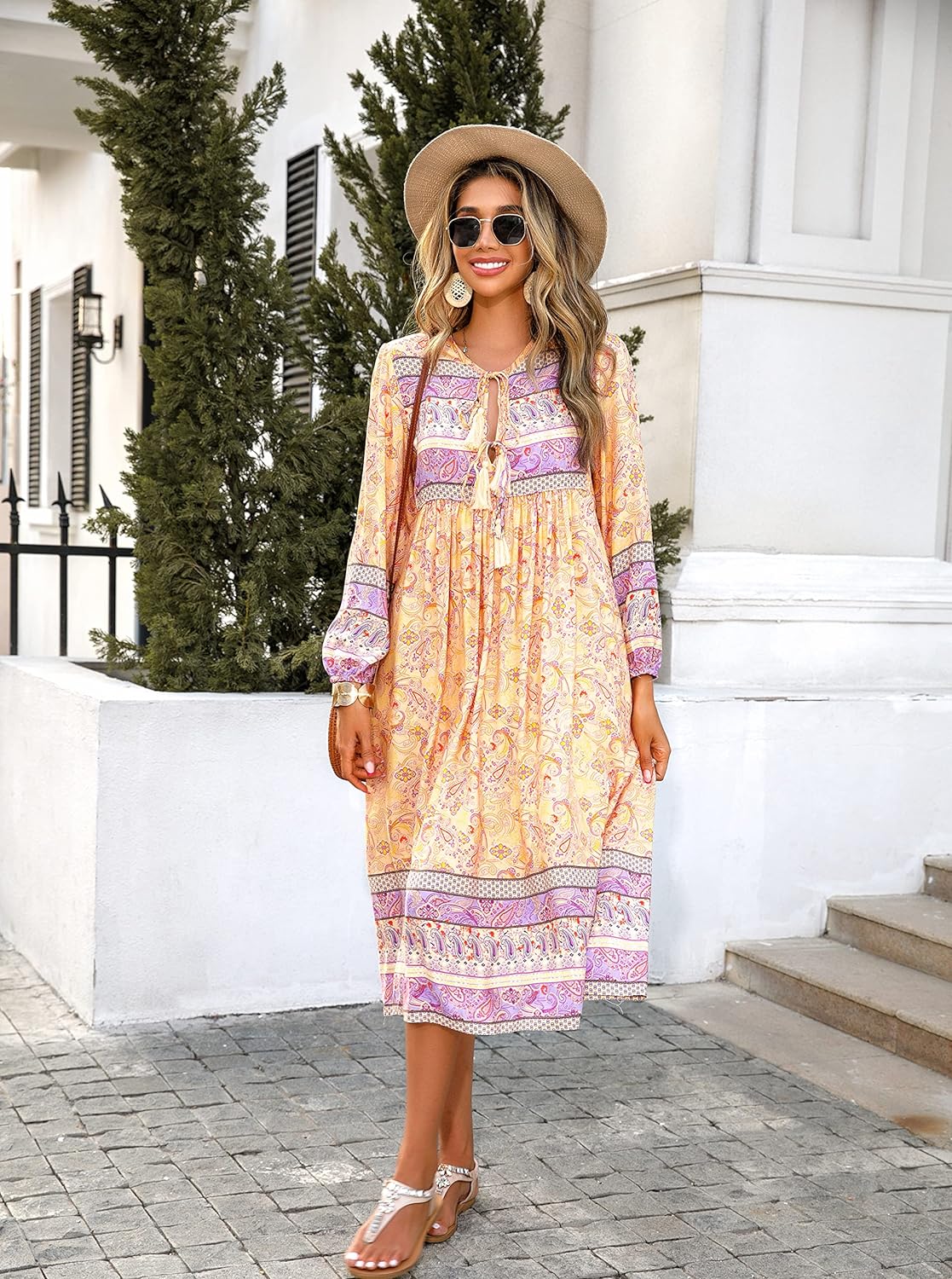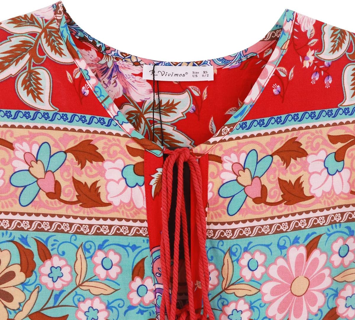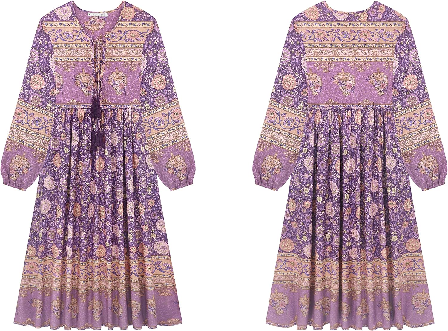 R.Vivimos Women's Long Sleeve Floral Print Retro V Neck Tassel Bohemian Midi Dresses