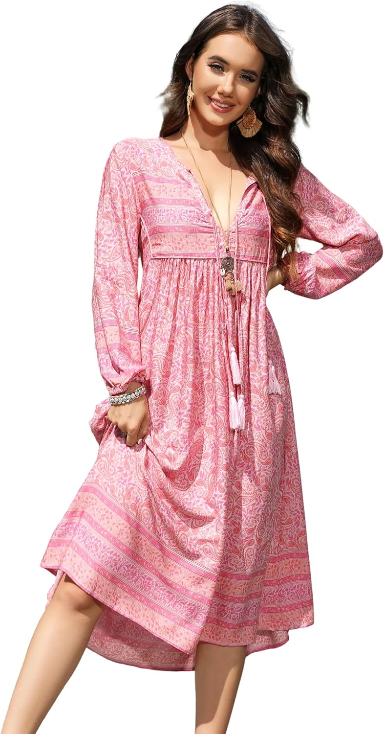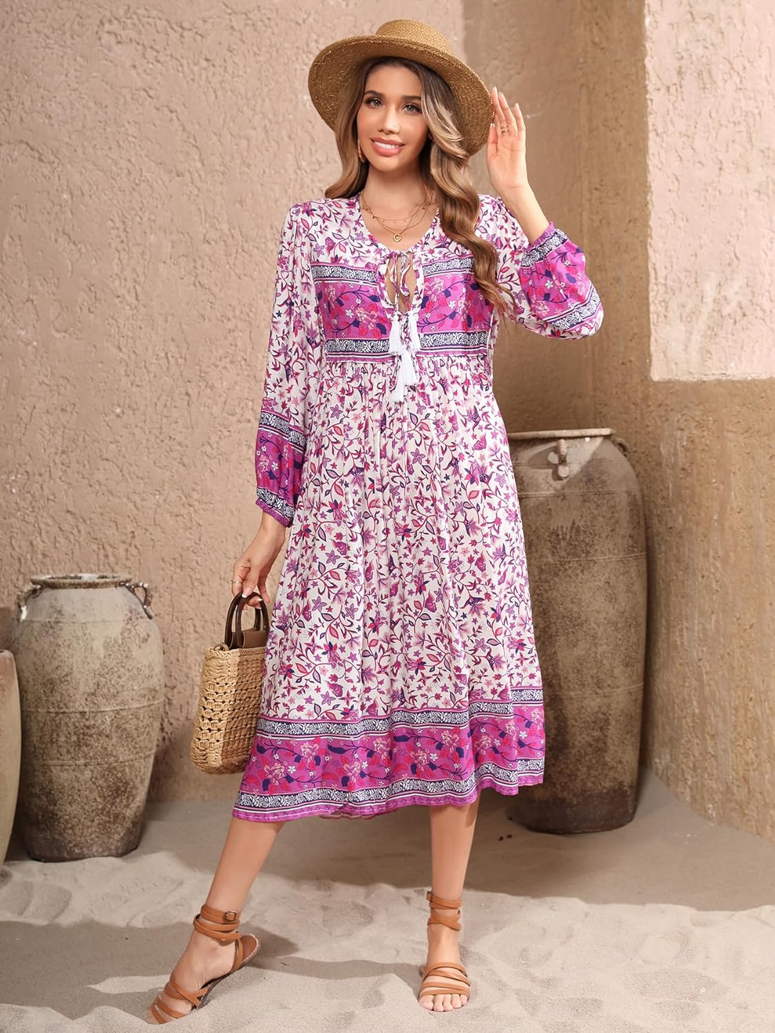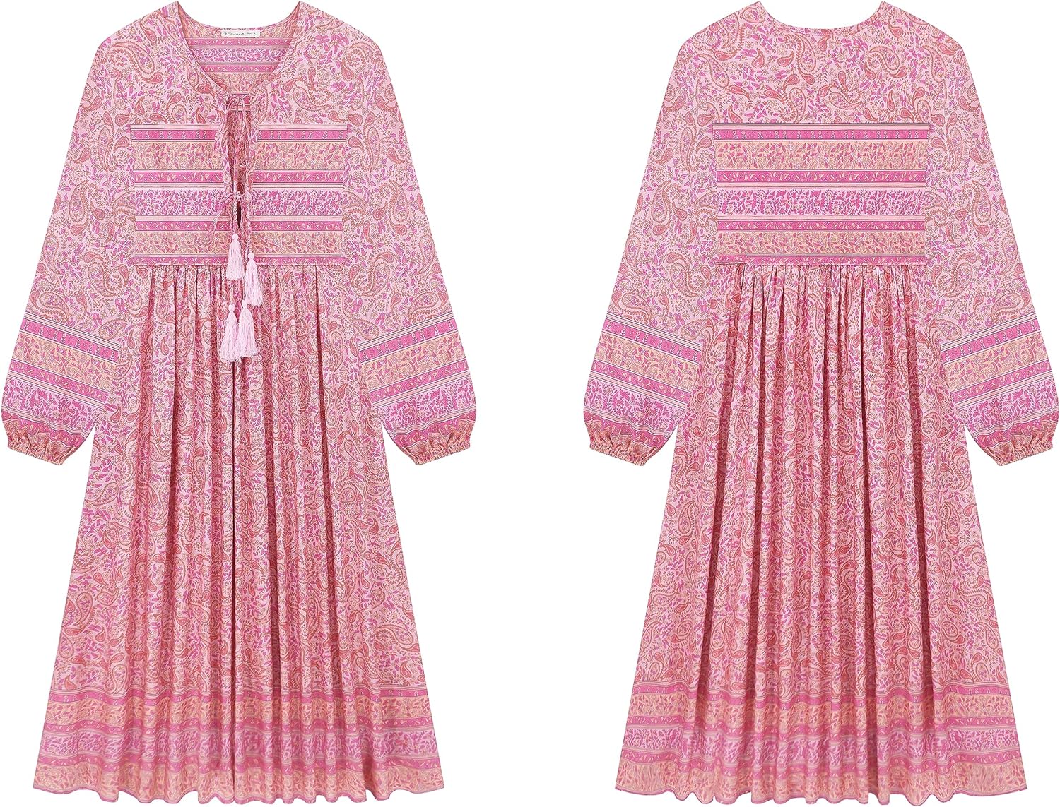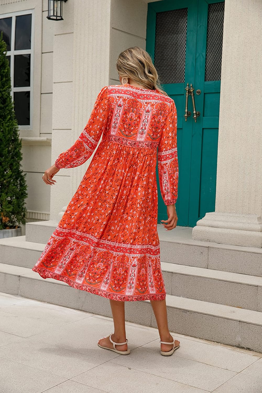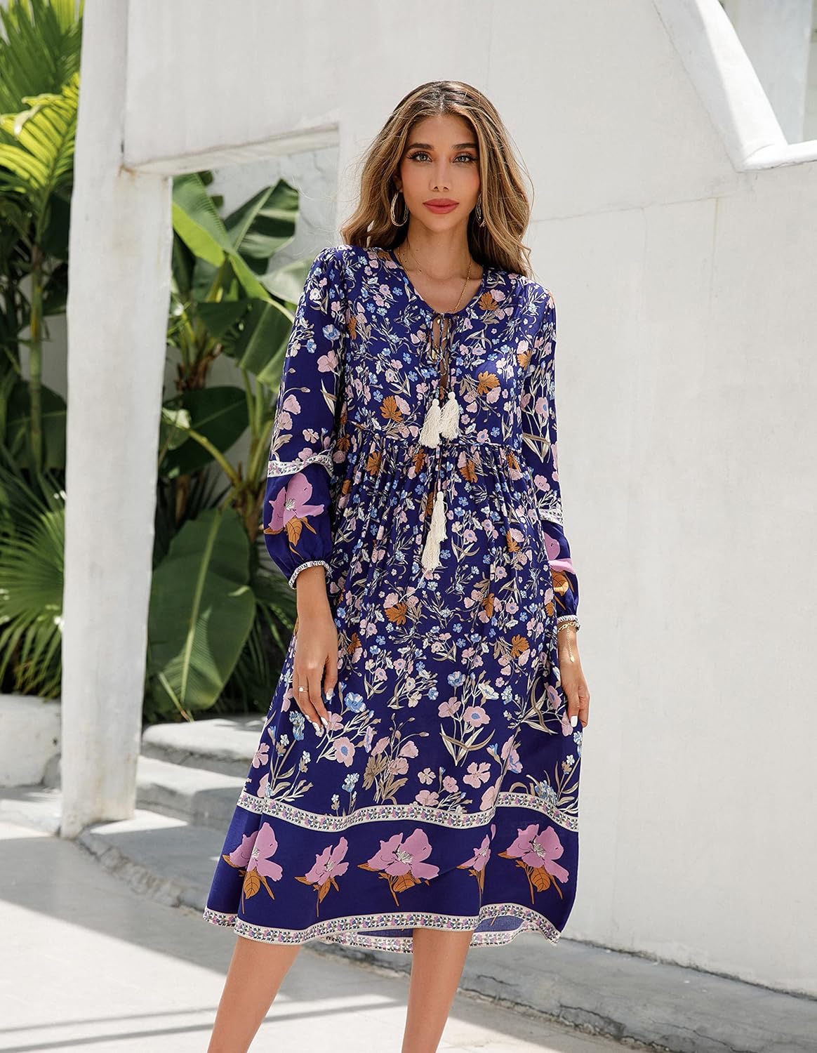 R.Vivimos Women's Long Sleeve Floral Print Retro V Neck Tassel Bohemian Midi Dresses