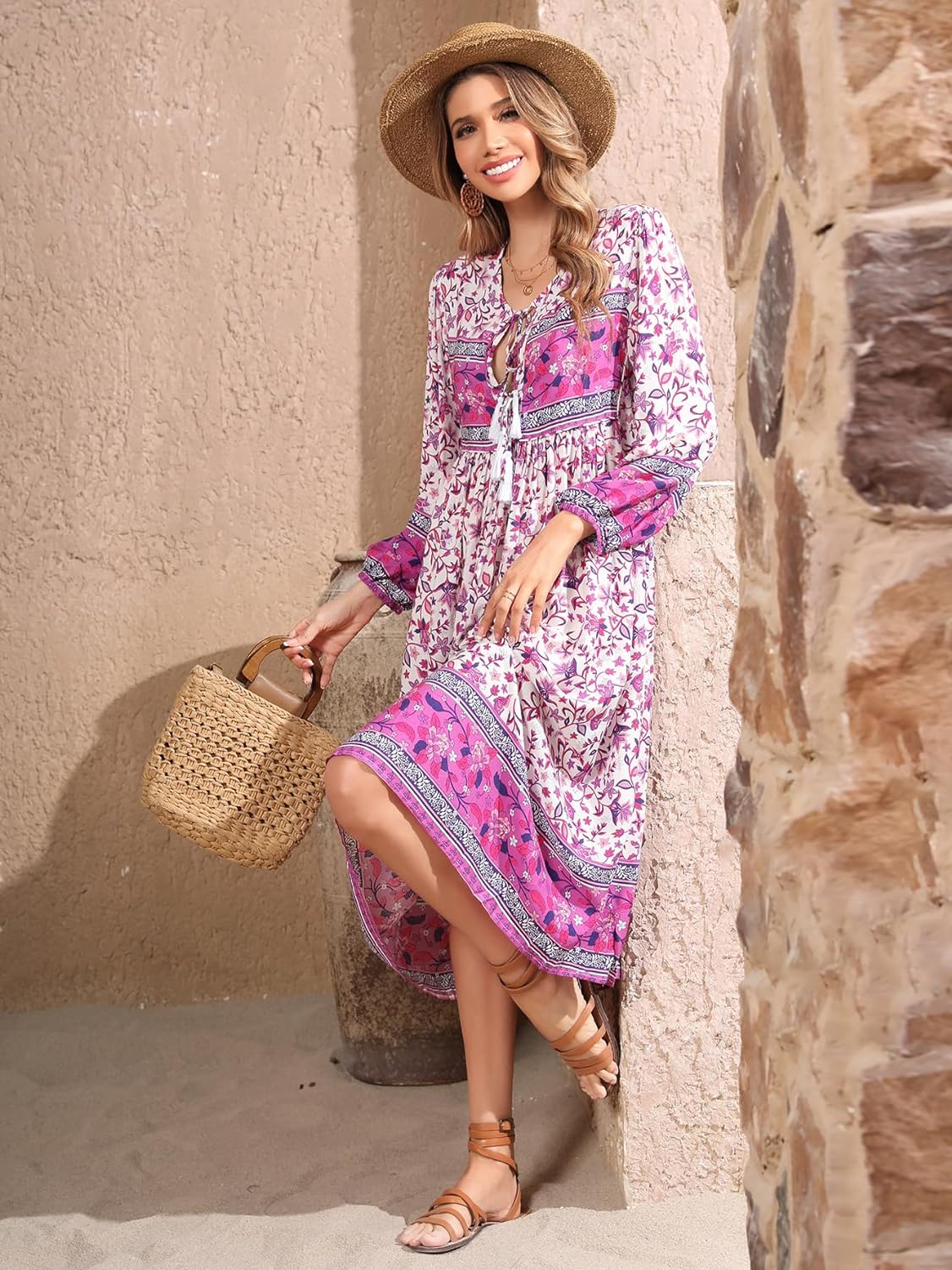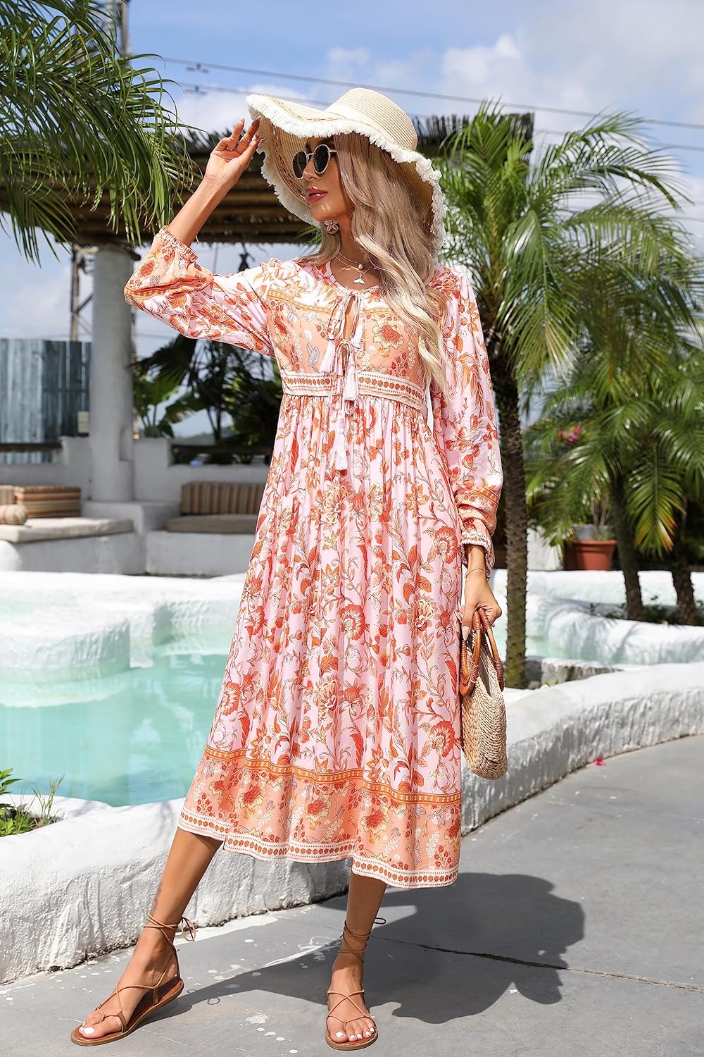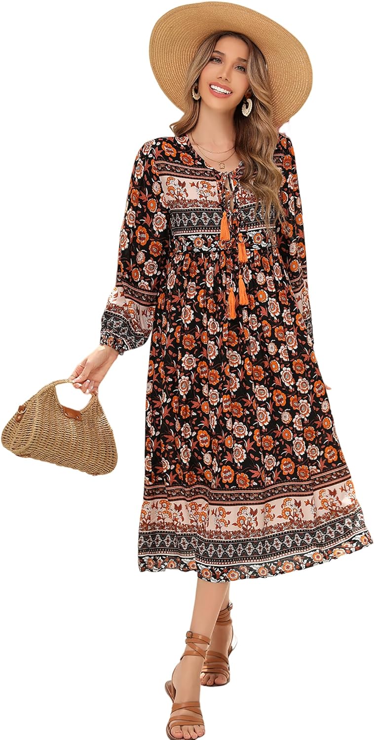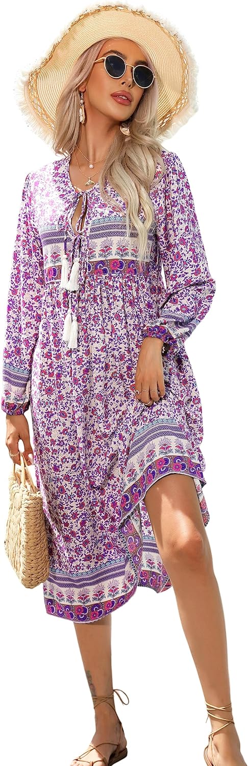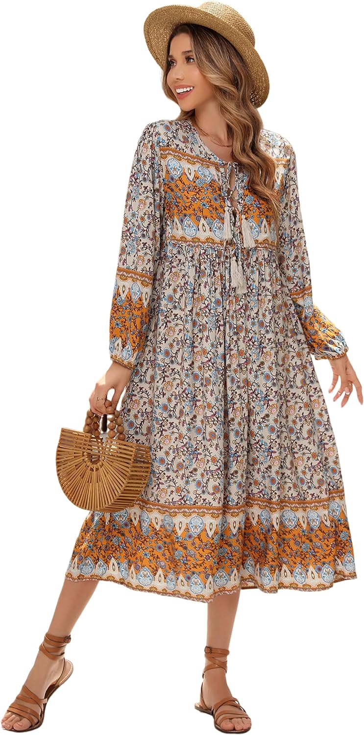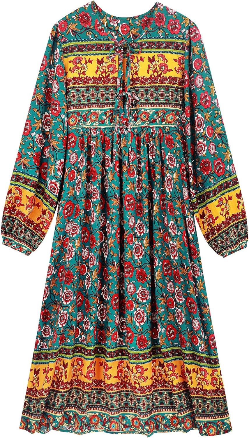 R.Vivimos Women's Long Sleeve Floral Print Retro V Neck Tassel Bohemian Midi Dresses