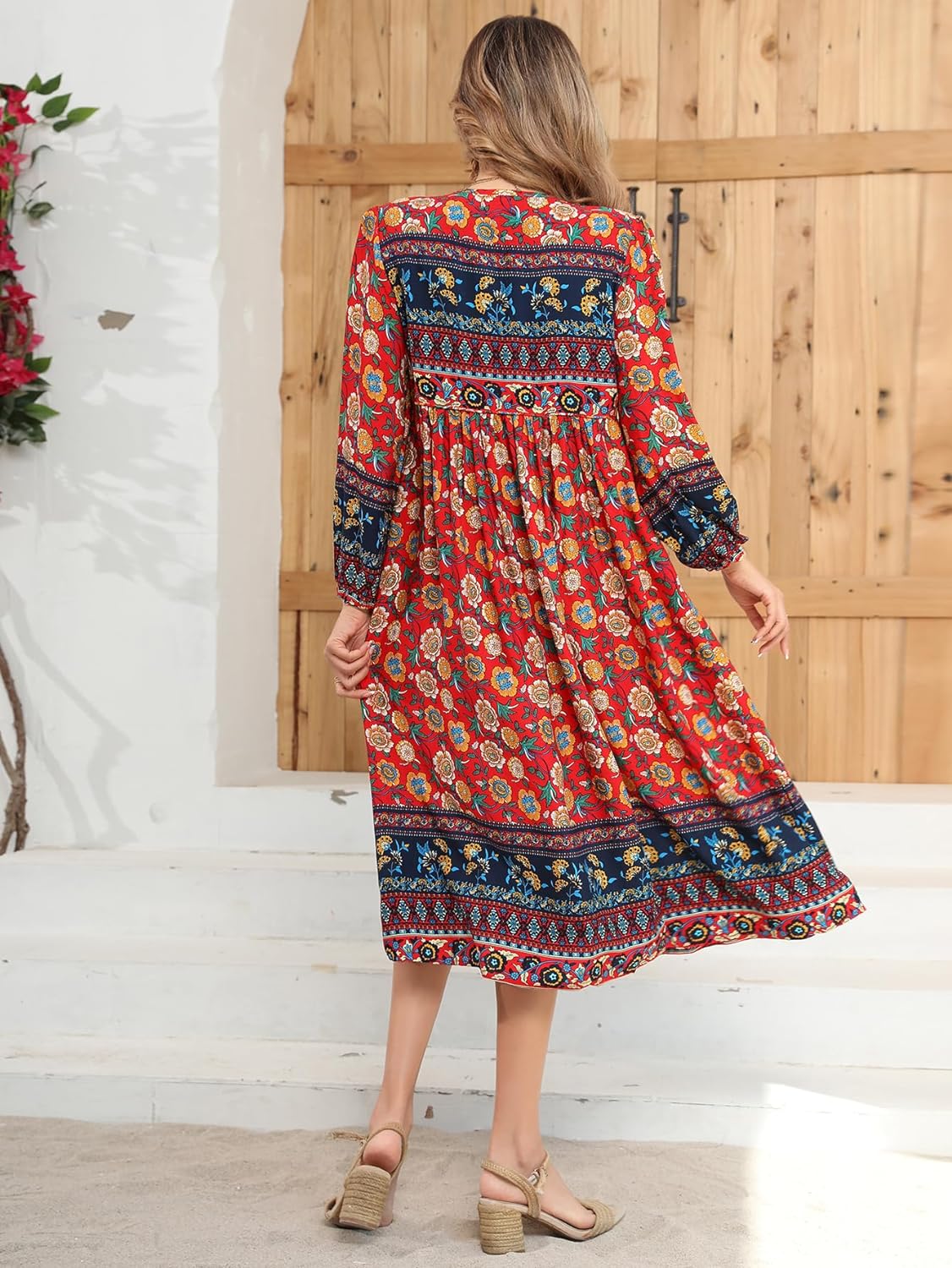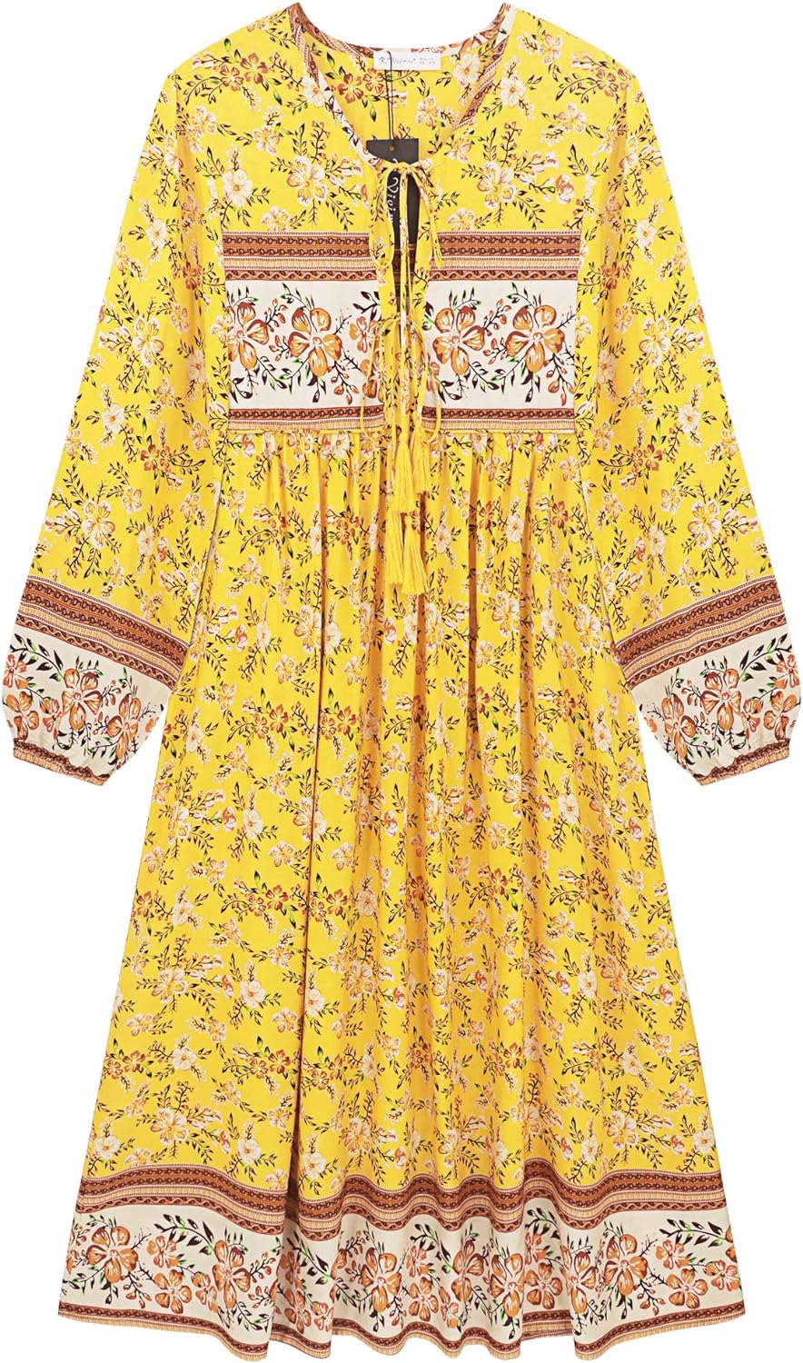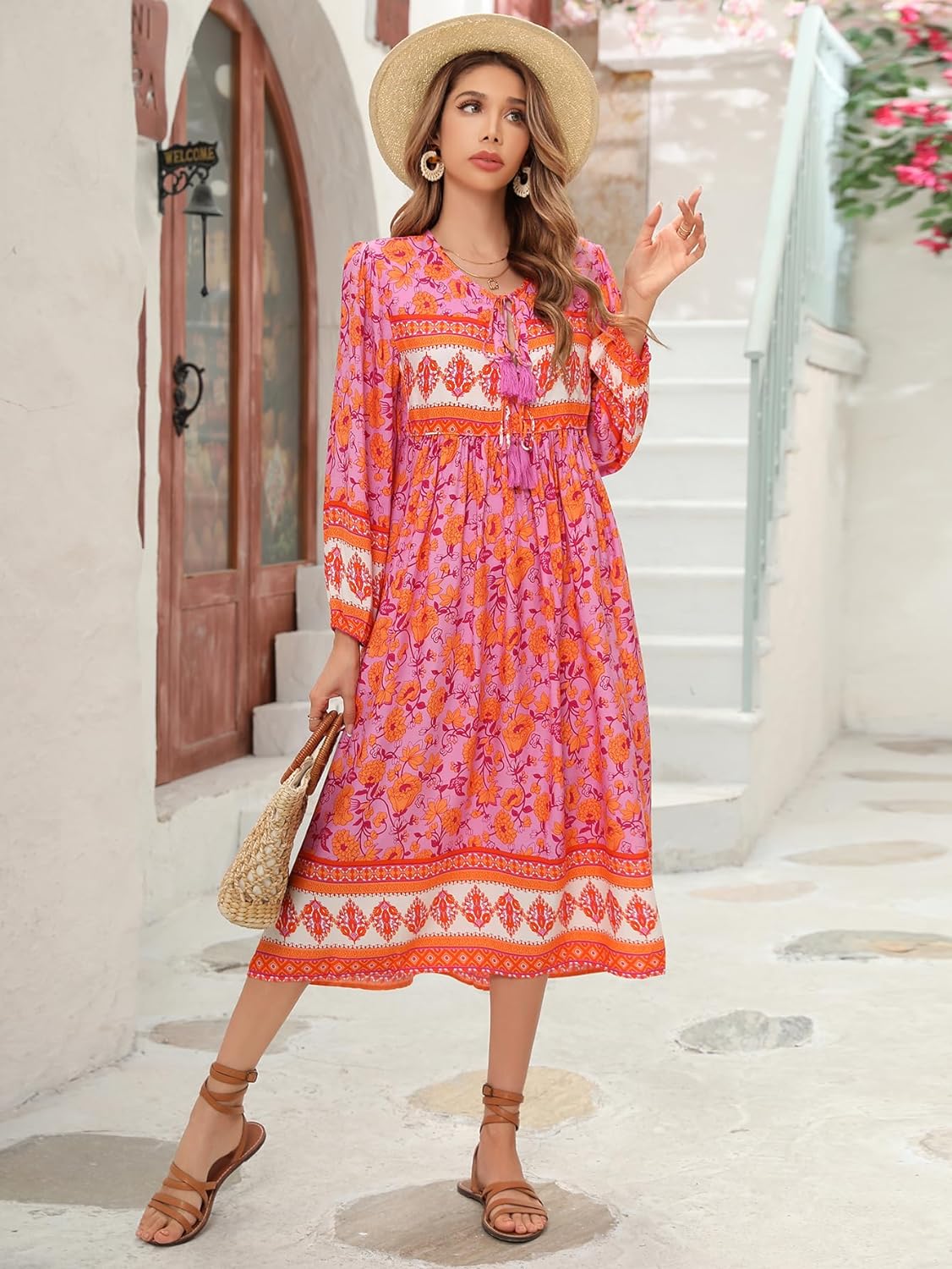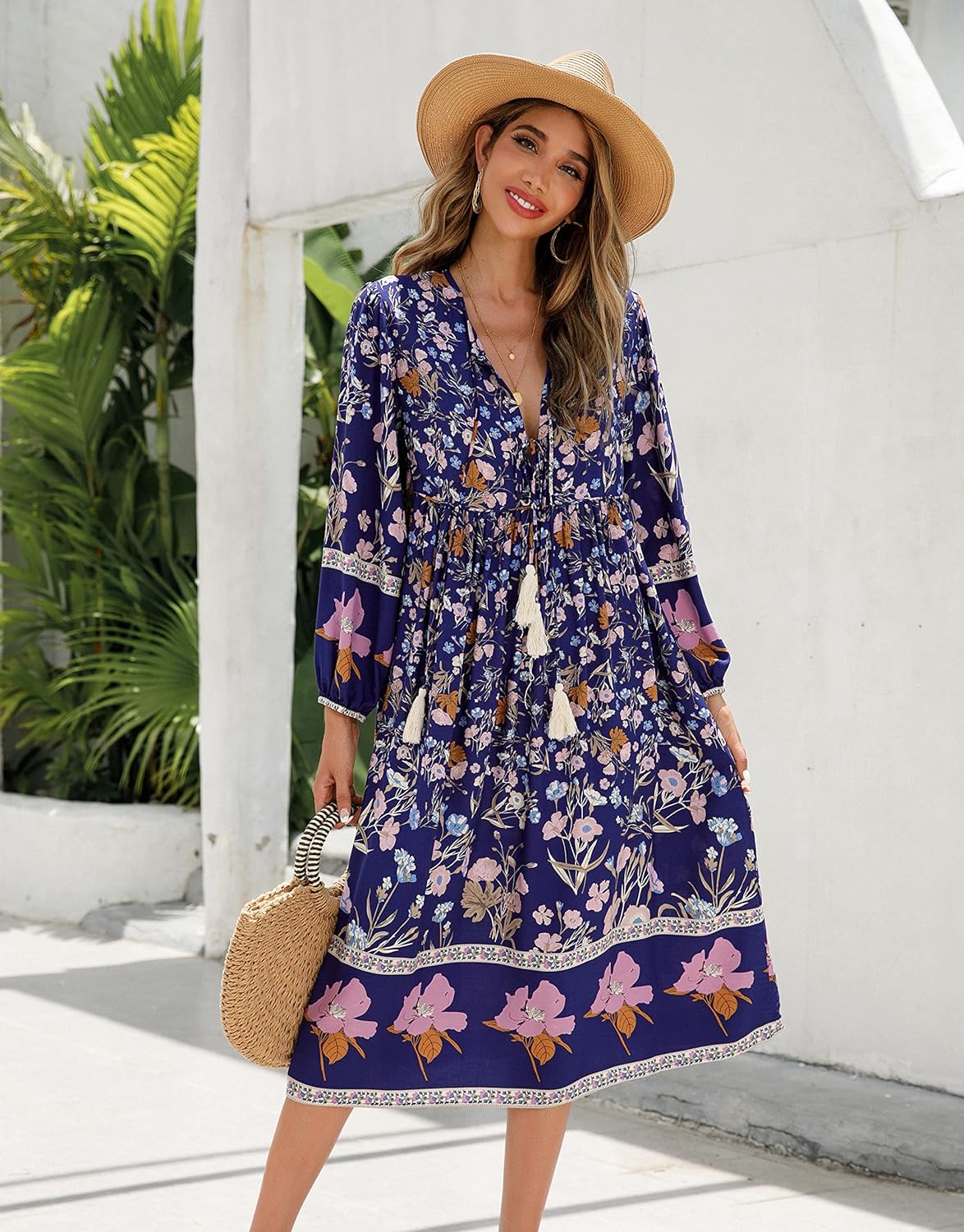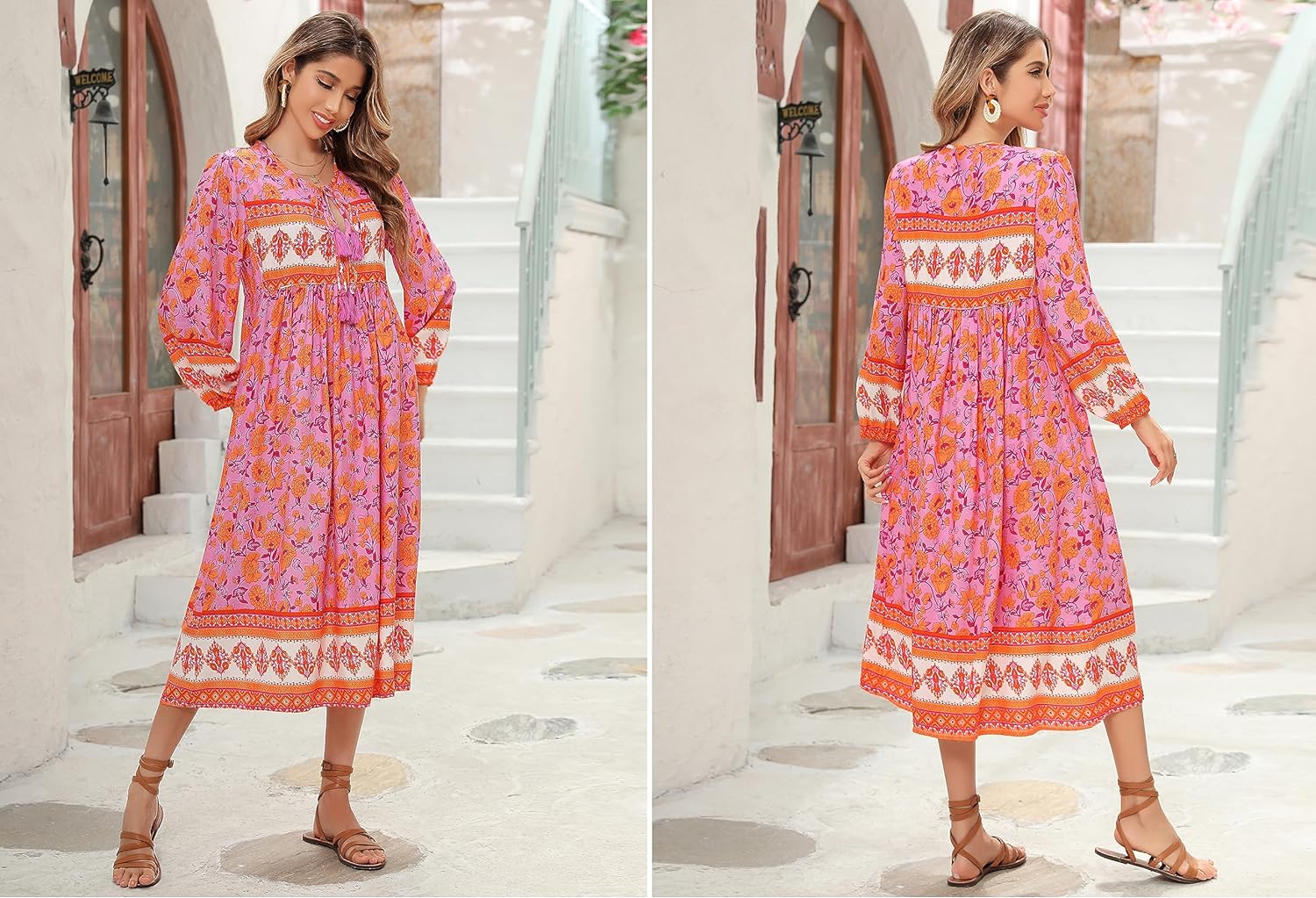 R.Vivimos Women's Long Sleeve Floral Print Retro V Neck Tassel Bohemian Midi Dresses
