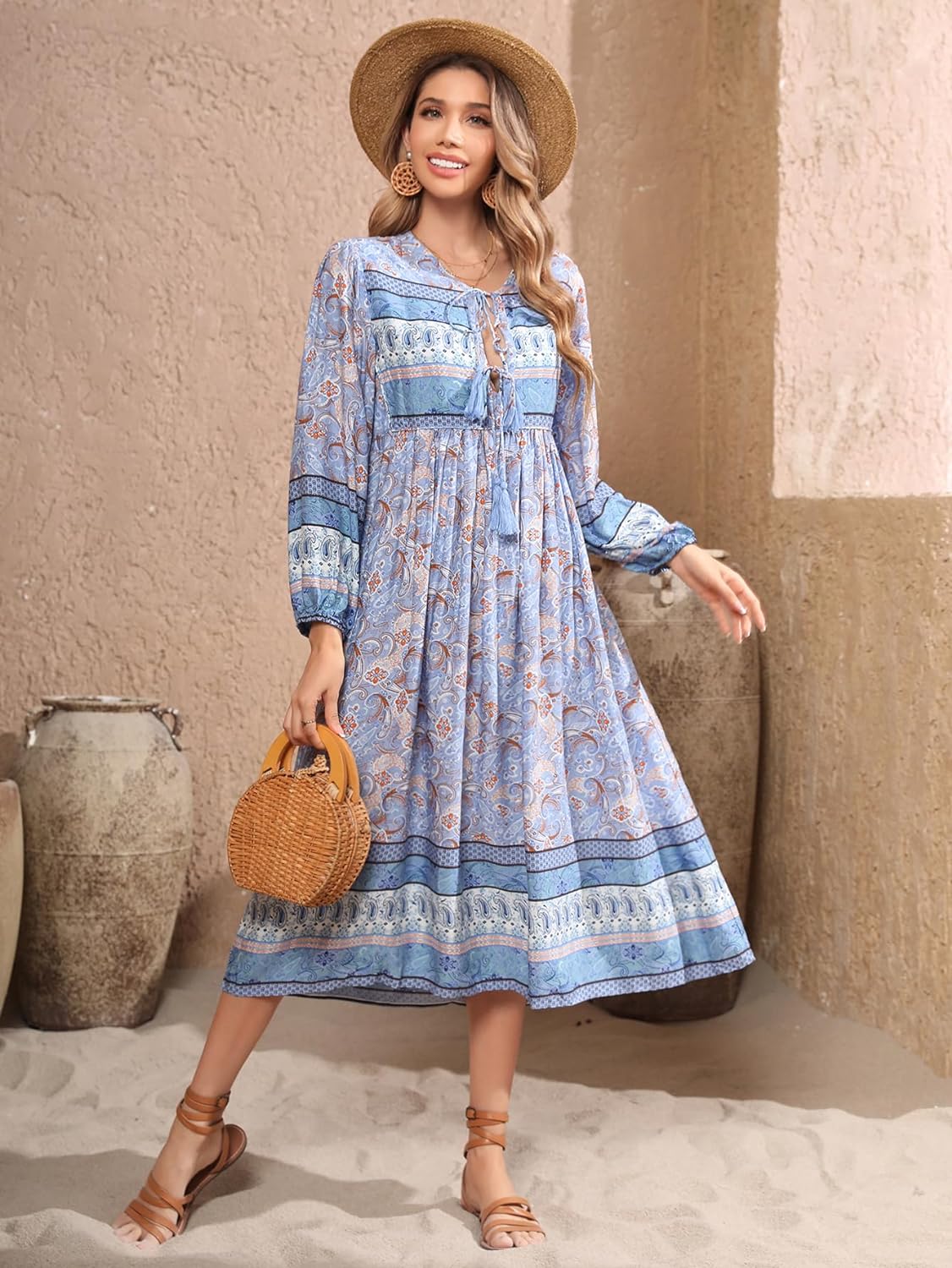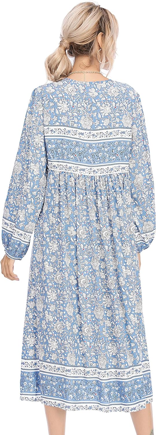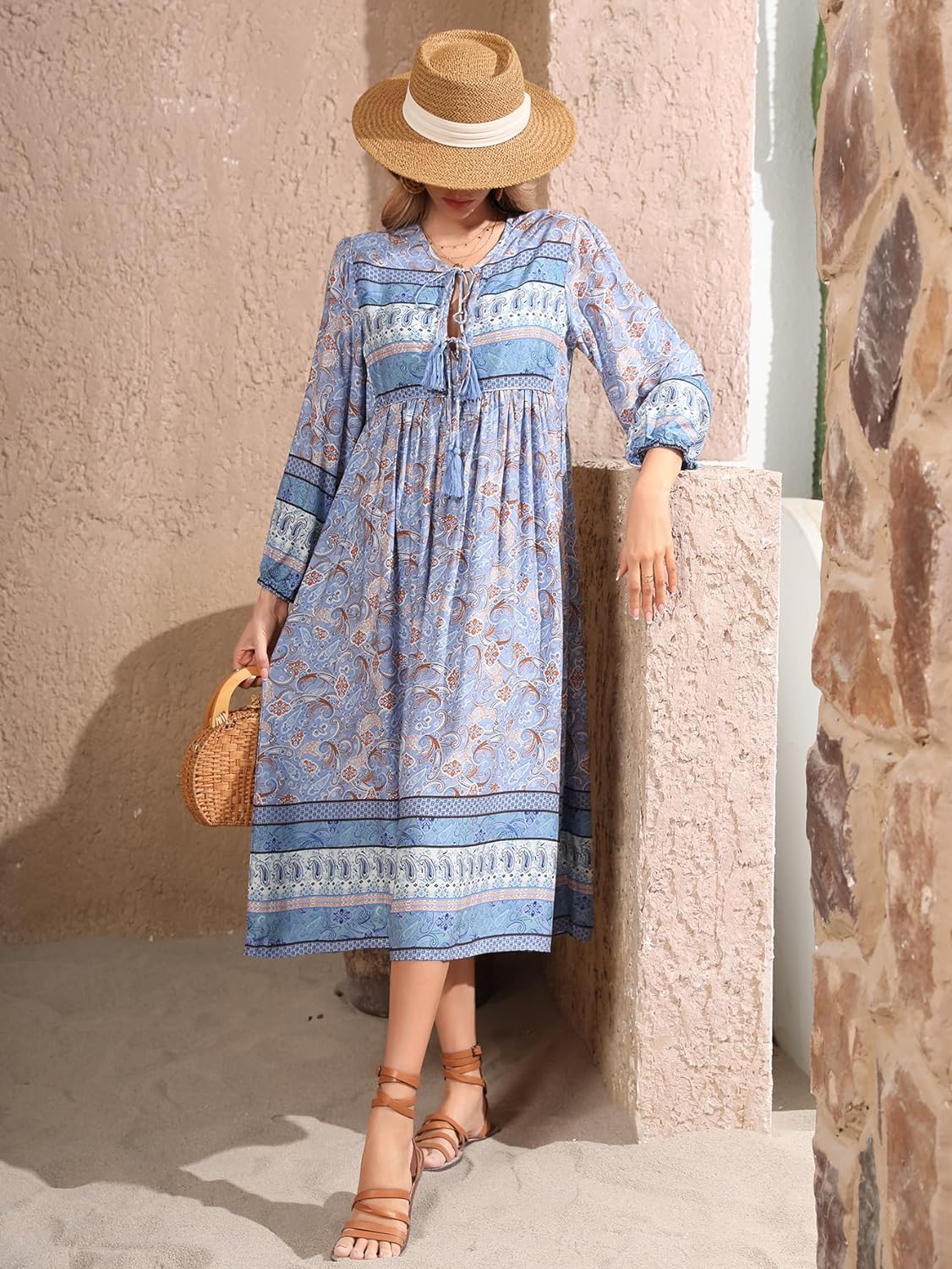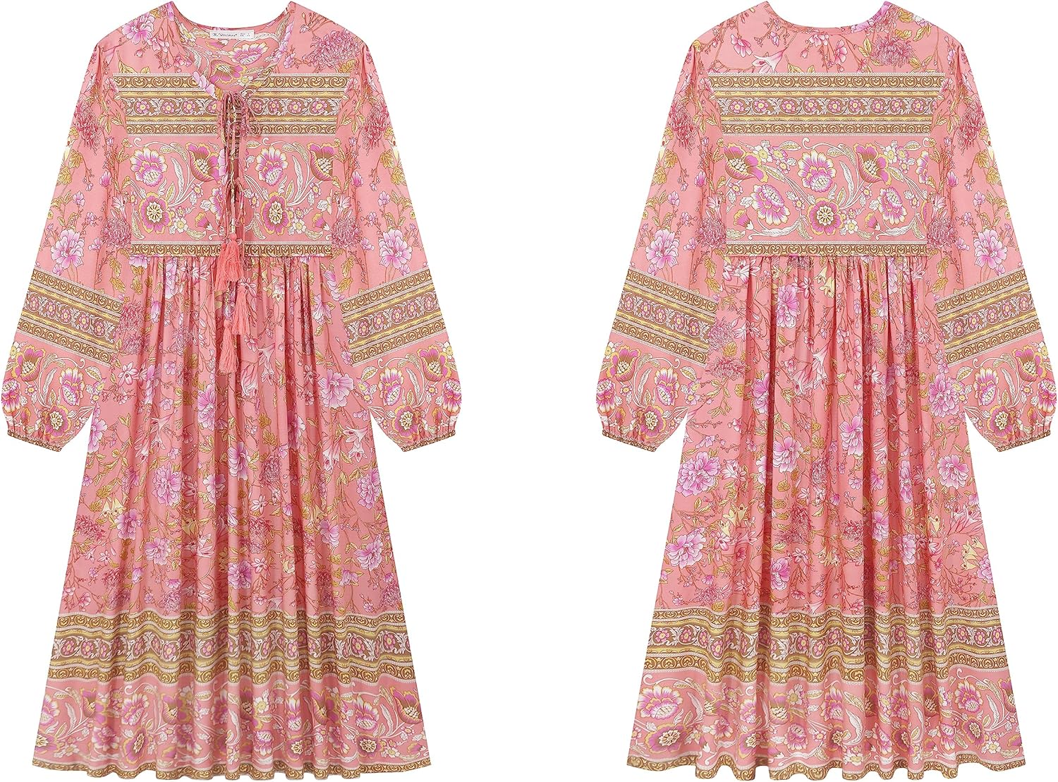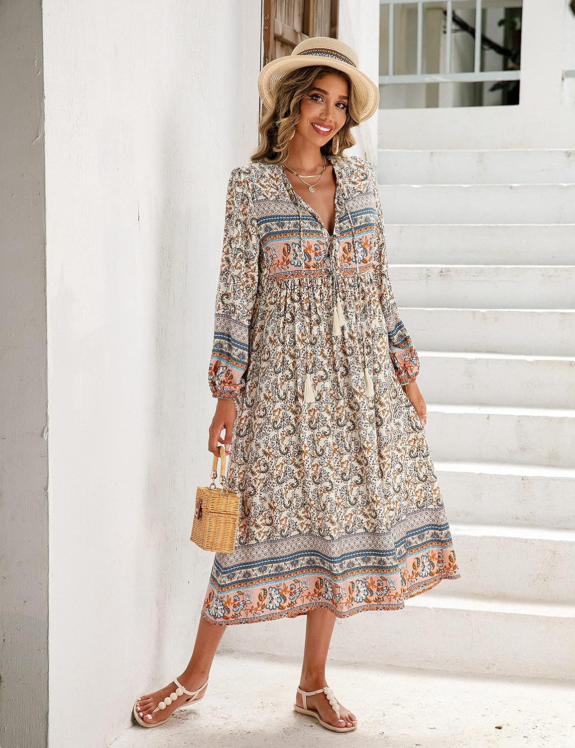 R.Vivimos Women's Long Sleeve Floral Print Retro V Neck Tassel Bohemian Midi Dresses