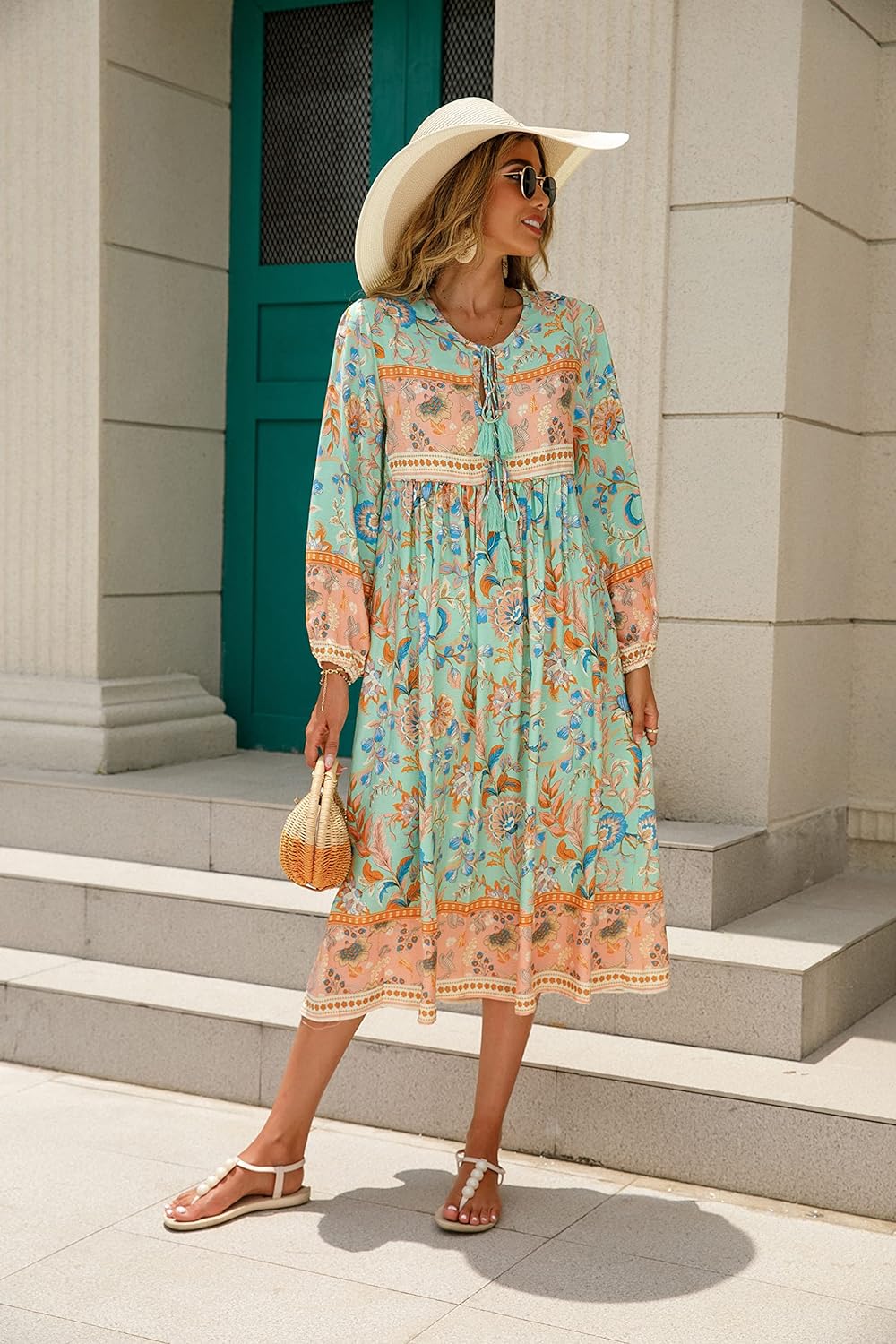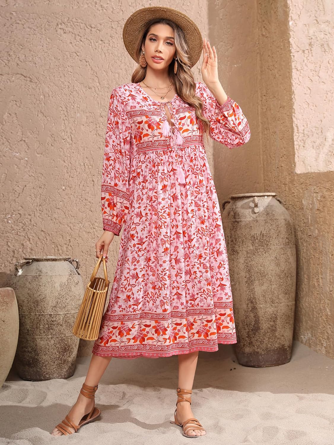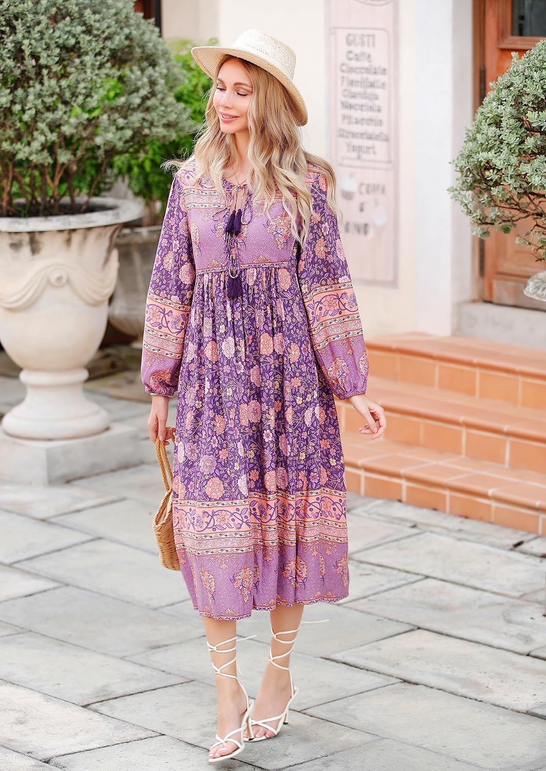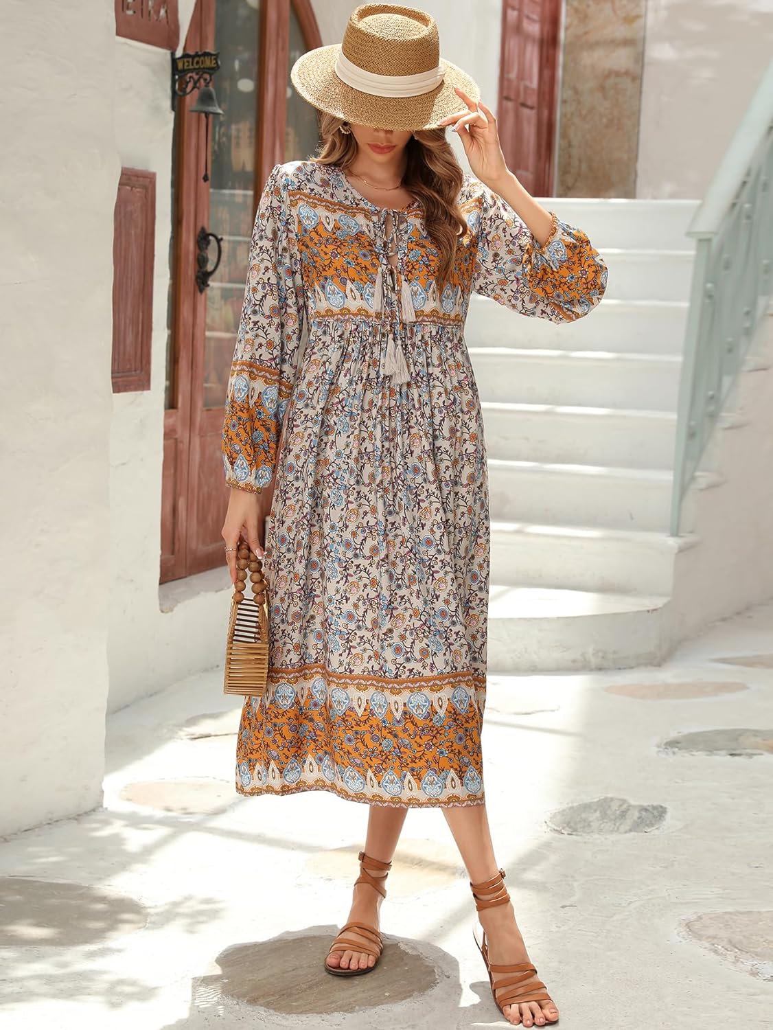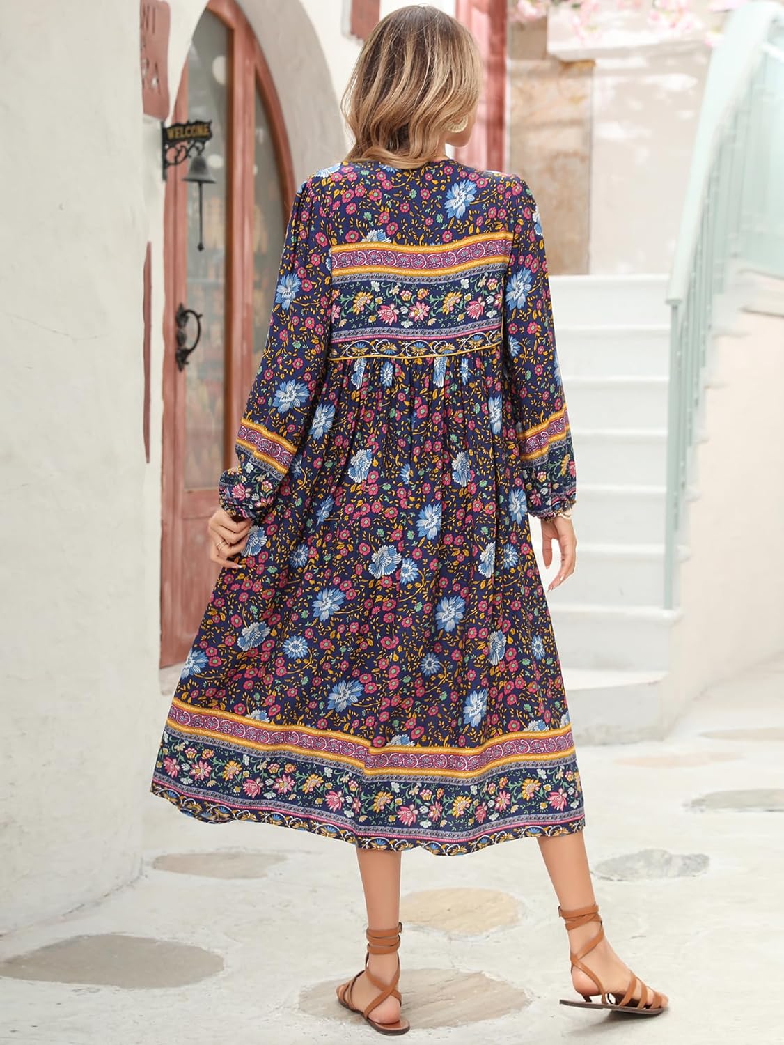 R.Vivimos Women's Long Sleeve Floral Print Retro V Neck Tassel Bohemian Midi Dresses