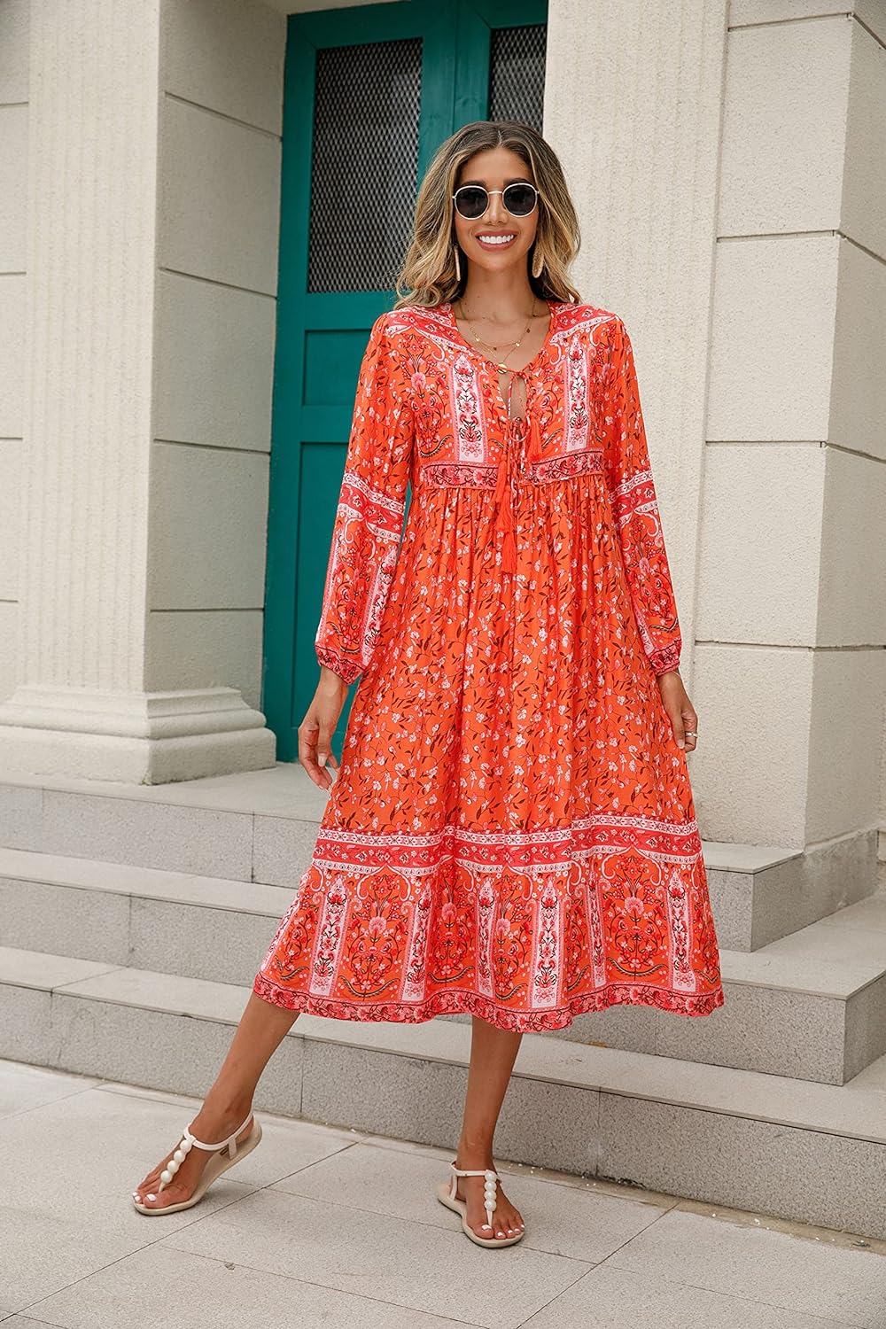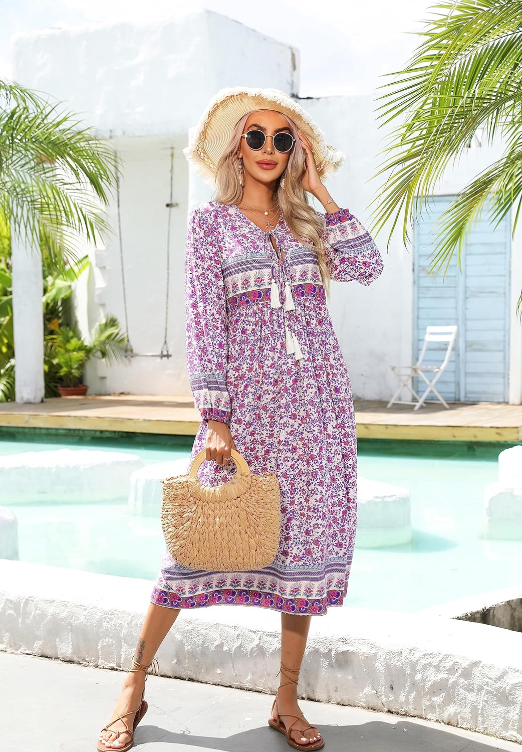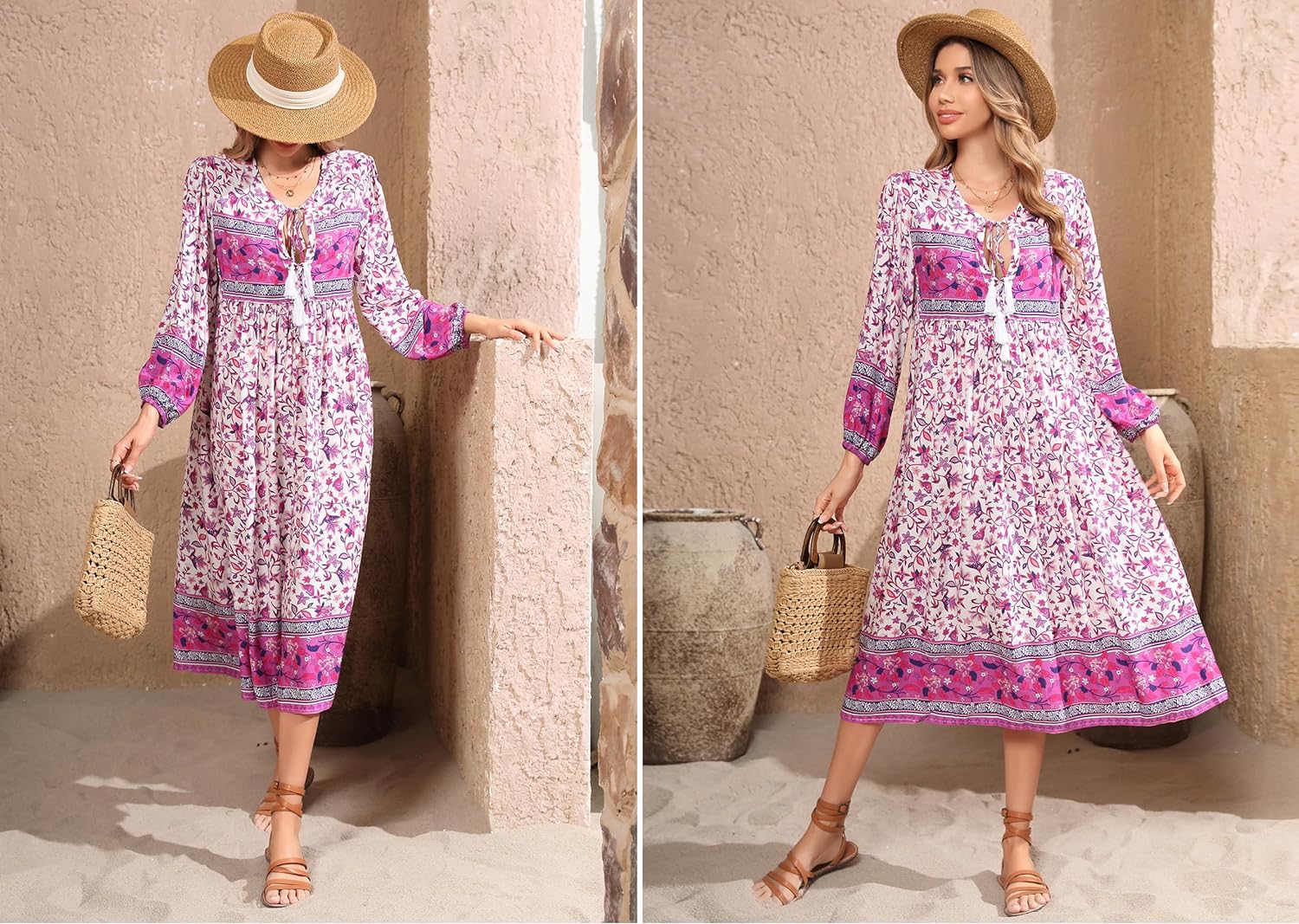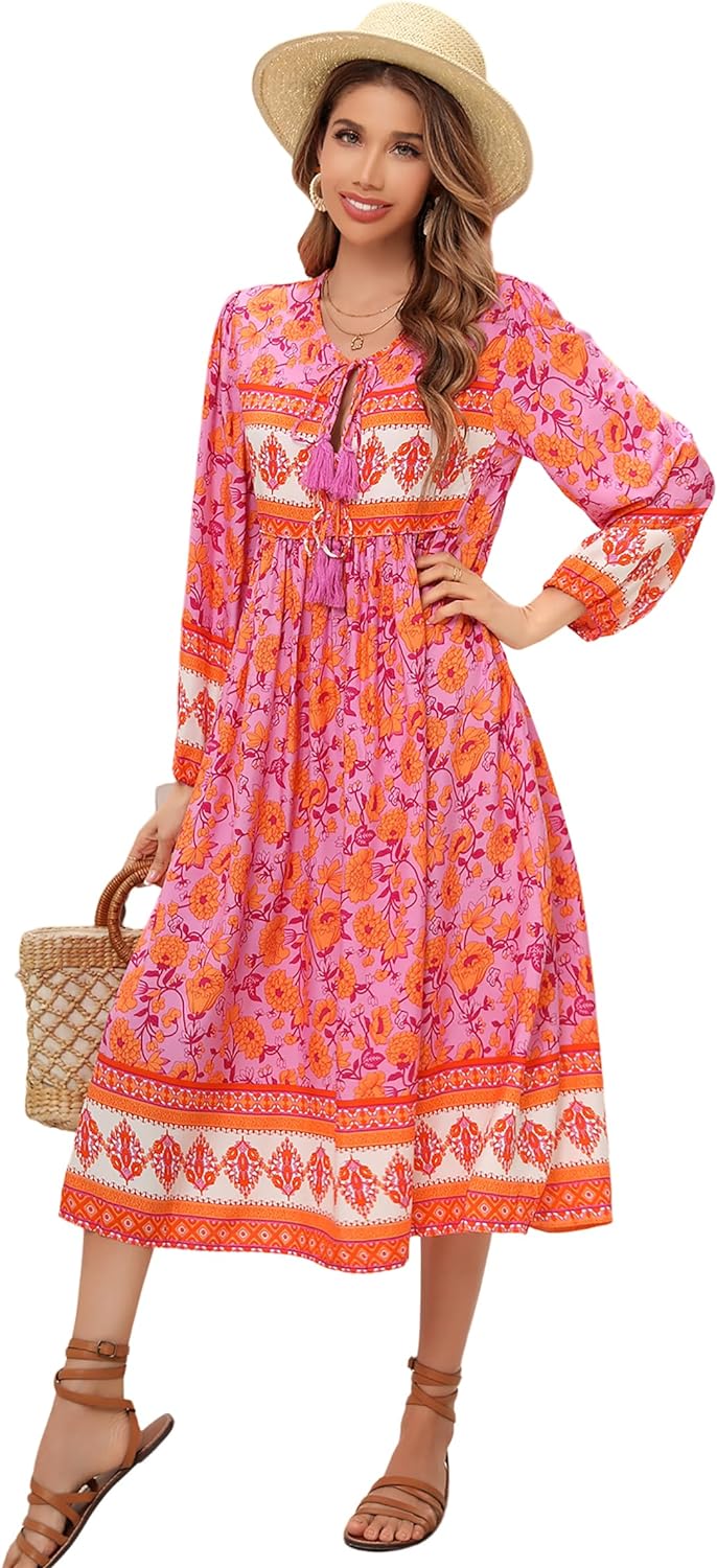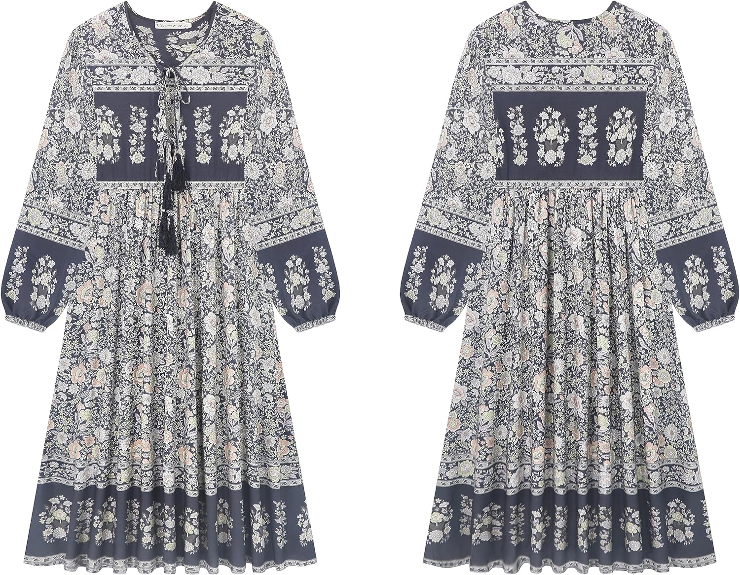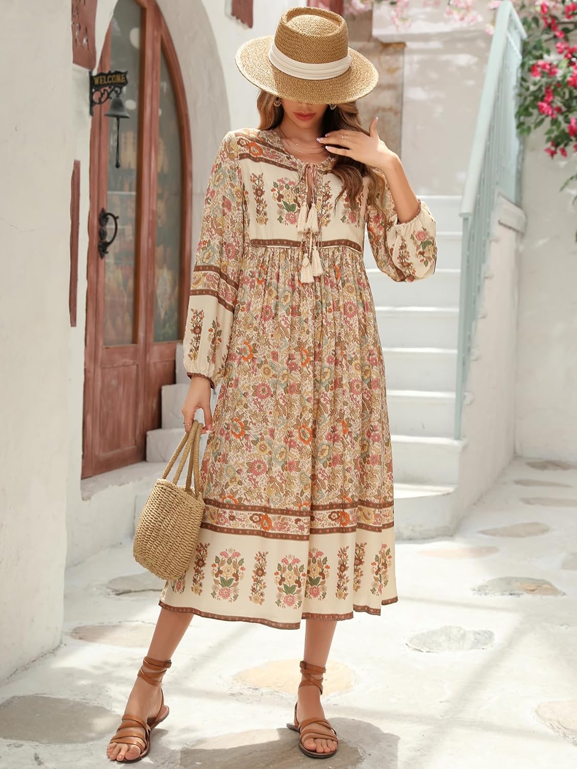 R.Vivimos Women's Long Sleeve Floral Print Retro V Neck Tassel Bohemian Midi Dresses