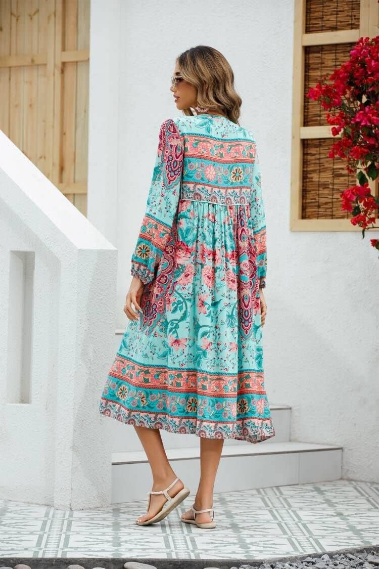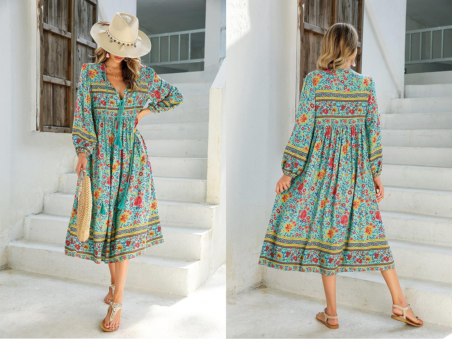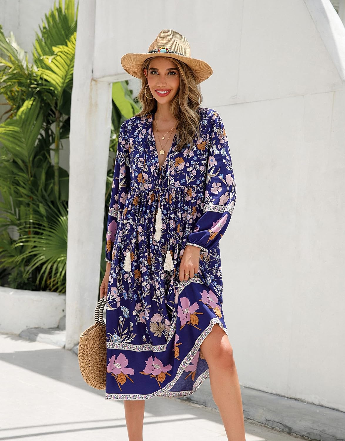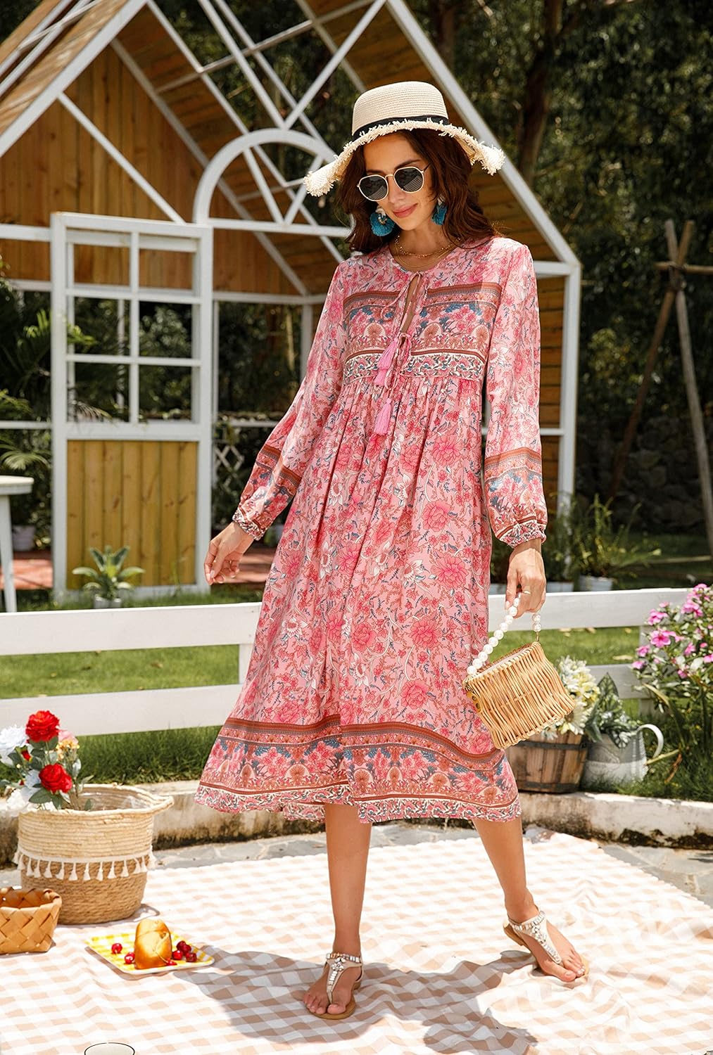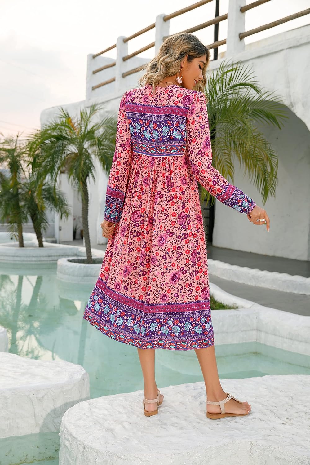 R.Vivimos Women's Long Sleeve Floral Print Retro V Neck Tassel Bohemian Midi Dresses